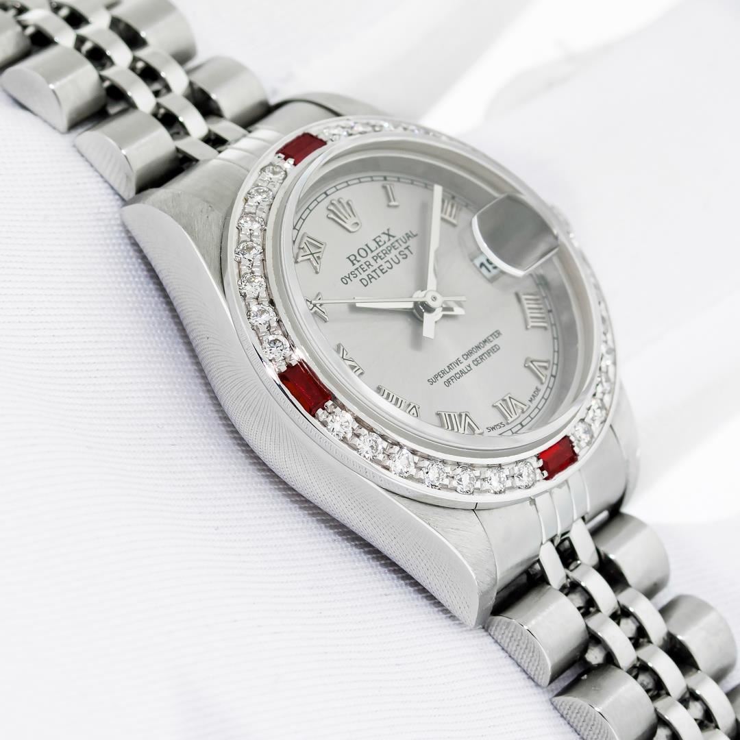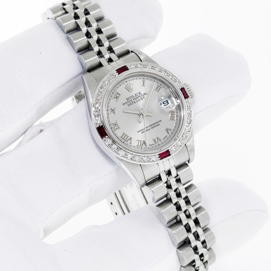 One Ladies Pre Owned Quickset Stainless Steel Rolex Datejust Polished Bright with Satin Finish, Serviced & Electronically Tested, Stainless Steel Case: 26mm. Rolex Stainless Steel Crown, Custom Bezel: New 18K White Gold Ruby Bead Set Diamond Bezel, Diamond + Gem Count: 28 Diamonds + 4 Rubies. Custom Crystal: New Sapphire With Magnified Date Window. Custom Hands: New Hands. Rolex Movement: Automatic Winding Movement 2235. Rolex Dial: Gray With Roman Hour Markers & Square Track. Date Window: 3 O'Clock Position Date Display, Model: Quickset Datejust. Condition: G-6 Extra Fine. Rolex Bracelet: Stainless Steel Jubilee Band. Bright Polish & Satin Finish. 6.0 Inch Length, Adjustable. Standard Clasp, With Rolex Logo. This Watch Has Been Serviced Time Tested And Is In Excellent Condition It Is Free Of All Scratches And Dents.