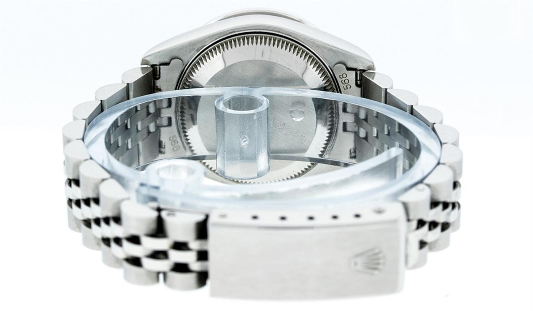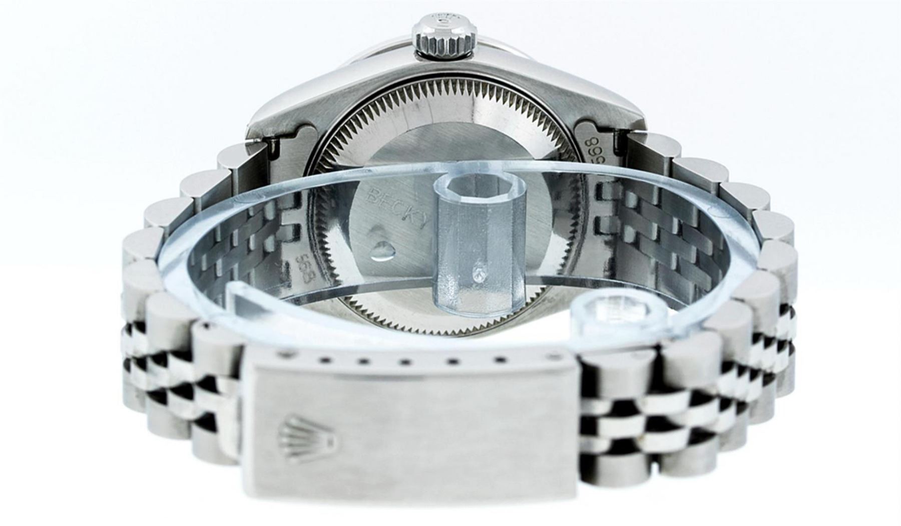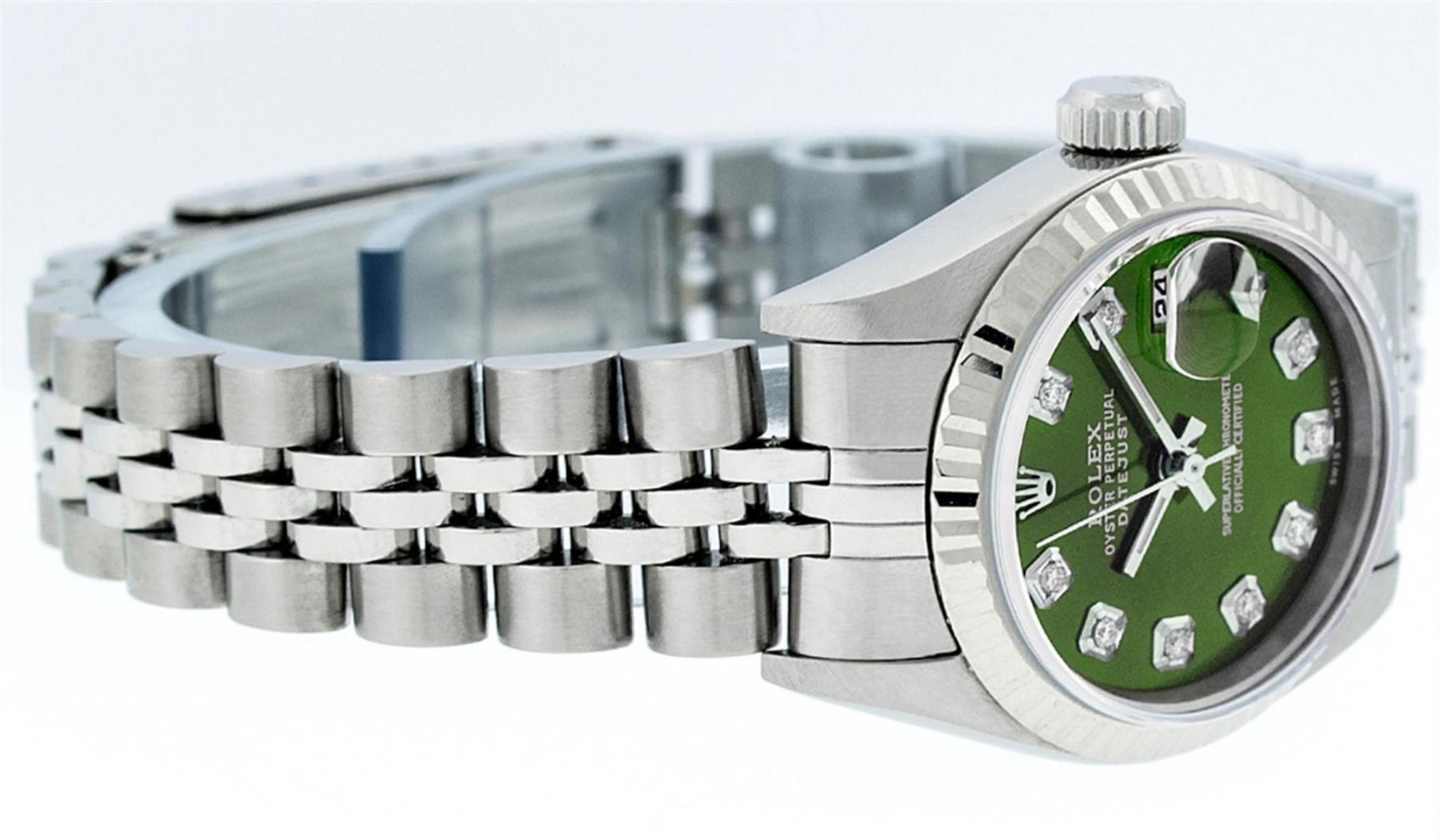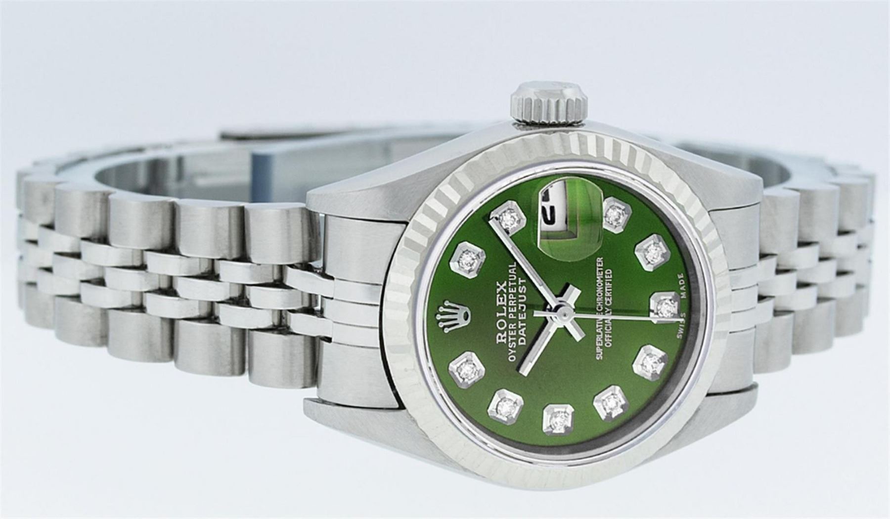 One Ladies Quickset Stainless Steel Rolex Oyster Perpetual Datejust Polished Bright with Satin Finish, Serviced & Electronically Tested, Stainless Steel Case: 26mm, Stainless Steel Crown, Bezel: 18K White Gold Fluted Bezel. Custom Crystal: New Scratch Resistant Sapphire Cyclops Lens. Custom Hands: New Luminescent Hands. Movement: Automatic Winding Movement. Custom Dial: Green Diamond Dial, Diamond Count: 10 Diamonds In Dial, Color: G to H, Clarity: SI1 Date Window: 3 O'Clock Position Date Display, Model: 79174 Quickset Datejust. Condition: G-6 Extra Fine. Bracelet: Stainless Steel Jubilee Band. Bright Polish & Satin Finish. 6.0 Inch Length, Adjustable. Standard Clasp, With Rolex Logo. This Watch Has Been Serviced Time Tested And Is In Excellent Condition It Is Free Of All Scratches And Dents.