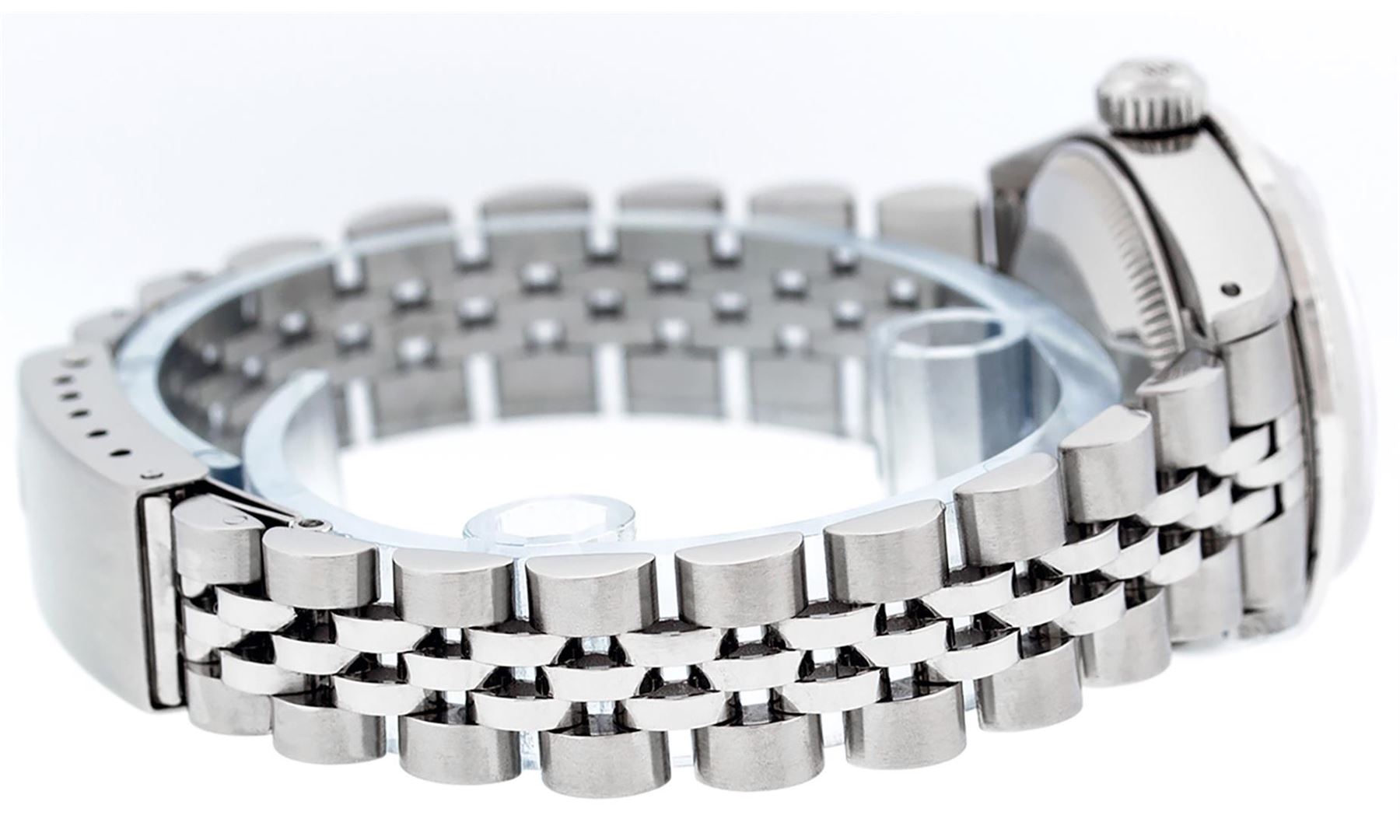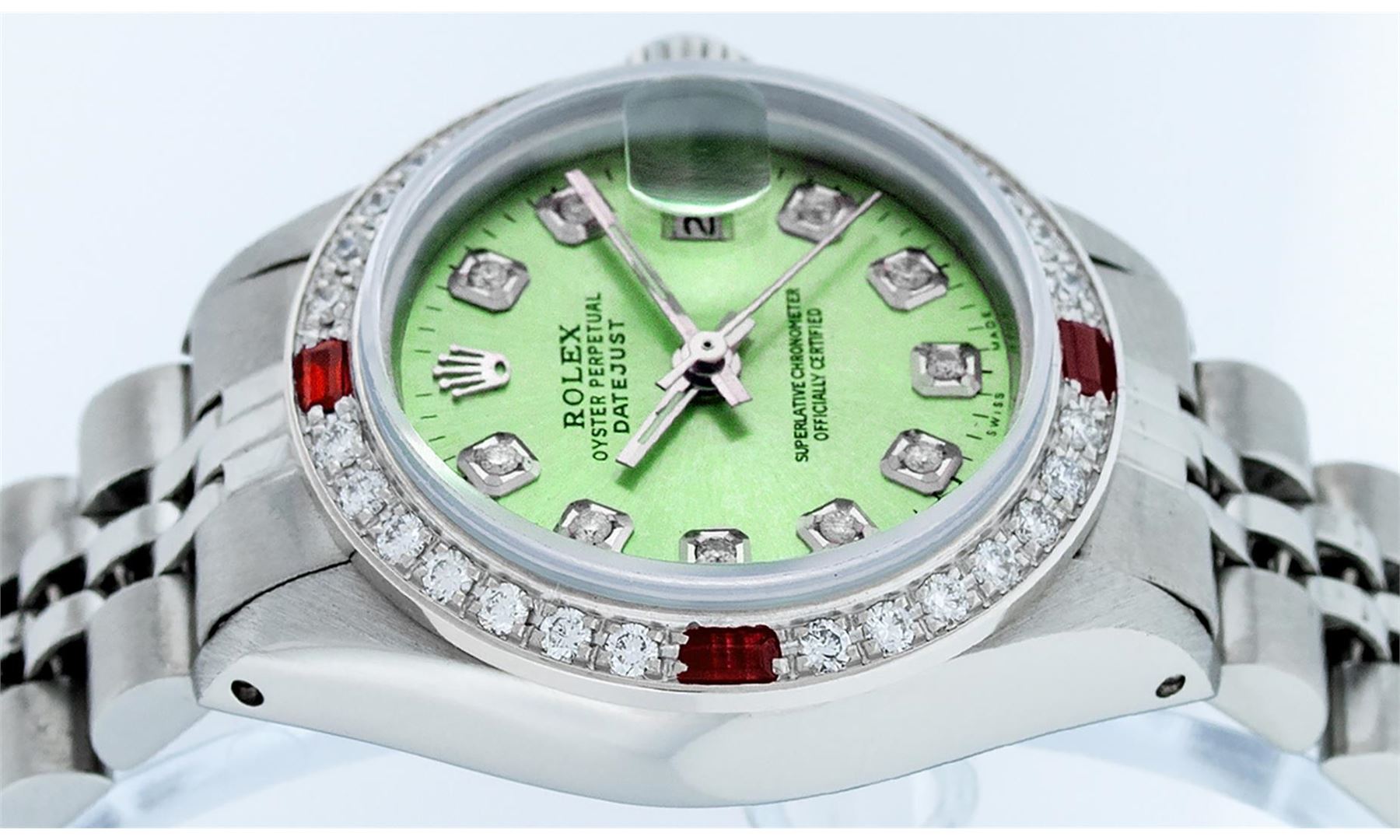 One Ladies Stainless Steel Rolex Datejust Polished Bright with Satin Finish, Serviced & Electronically Tested, Stainless Steel Case: 26mm, Stainless Steel Crown, Custom Bezel: New 18K White Gold Ruby Beadset Diamond Bezel, Diamond + Gem Count:� 28 Diamonds + 4 Rubies. Total Weight .70 Carat, Clarity: SI-VS, Color: G to H. Custom Crystal: New Scratch Resistant Synthetic Sapphire Cyclops Lens. Custom Hands: New Luminescent Hands. Movement: Automatic Winding Movement Caliber 2030. Custom Dial: Refinished Green With Diamond Hour Markers & Dash Track, 10 Diamonds in Dial, G To H In Color, Clarity: SI-VS. Date Window: 3 O'Clock Position Date Display, Model: Datejust. Condition: G-6 Extra Fine. Bracelet: Stainless Steel Jubilee. Bright Polish & Satin Finish. 6.0 Inch Length, Adjustable. Standard Clasp, With Rolex Logo. This Watch Has Been Serviced Time Tested And Is In Excellent Condition It Is Free Of All Scratches And Dents.