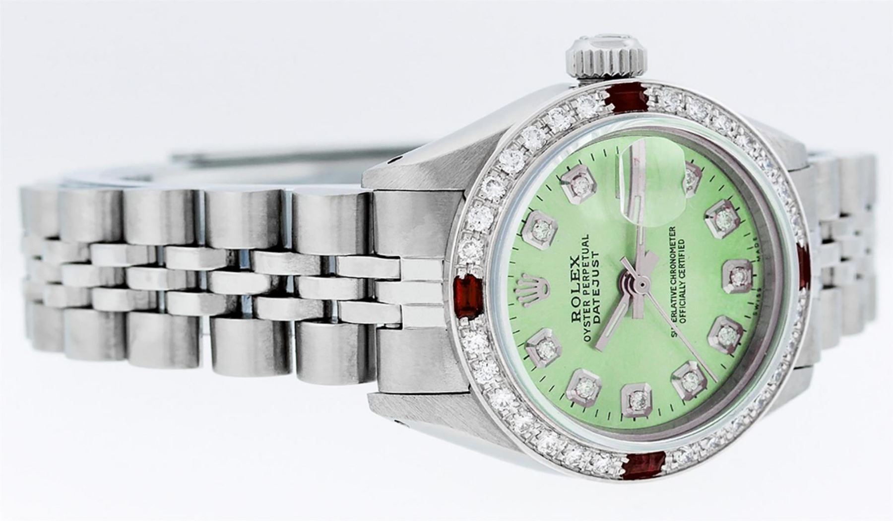 One Ladies Stainless Steel Rolex Datejust Polished Bright with Satin Finish, Serviced & Electronically Tested, Stainless Steel Case: 26mm, Stainless Steel Crown, Custom Bezel: New 18K White Gold Ruby Beadset Diamond Bezel, Diamond + Gem Count:  28 Diamonds + 4 Rubies. Total Weight .70 Carat, Clarity: SI-VS, Color: G to H. Custom Crystal: New Scratch Resistant Synthetic Sapphire Cyclops Lens. Custom Hands: New Luminescent Hands. Movement: Automatic Winding Movement Caliber 2030. Custom Dial: Refinished Green With Diamond Hour Markers & Dash Track, 10 Diamonds in Dial, G To H In Color, Clarity: SI-VS. Date Window: 3 O'Clock Position Date Display, Model: Datejust. Condition: G-6 Extra Fine. Bracelet: Stainless Steel Jubilee. Bright Polish & Satin Finish. 6.0 Inch Length, Adjustable. Standard Clasp, With Rolex Logo. This Watch Has Been Serviced Time Tested And Is In Excellent Condition It Is Free Of All Scratches And Dents.