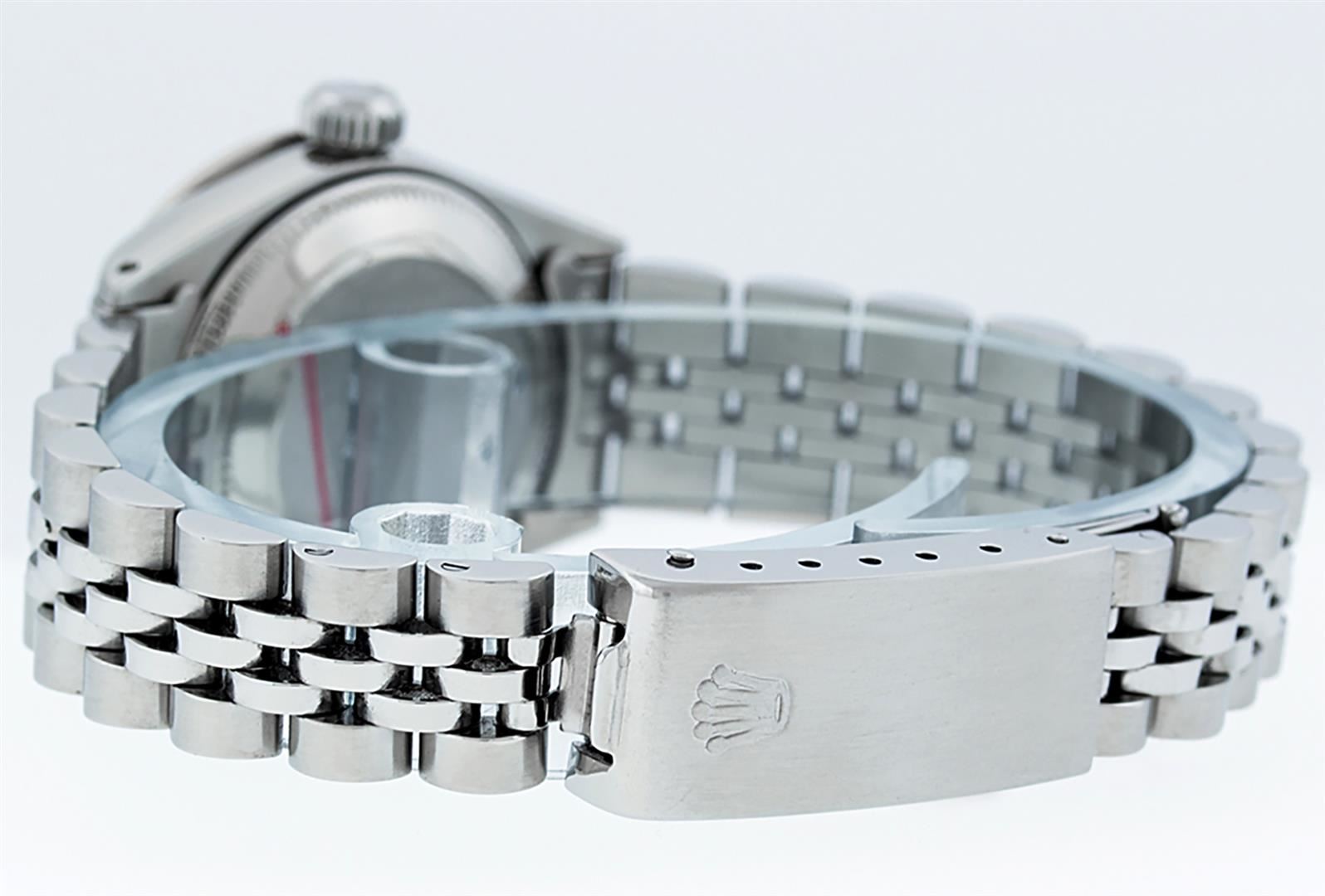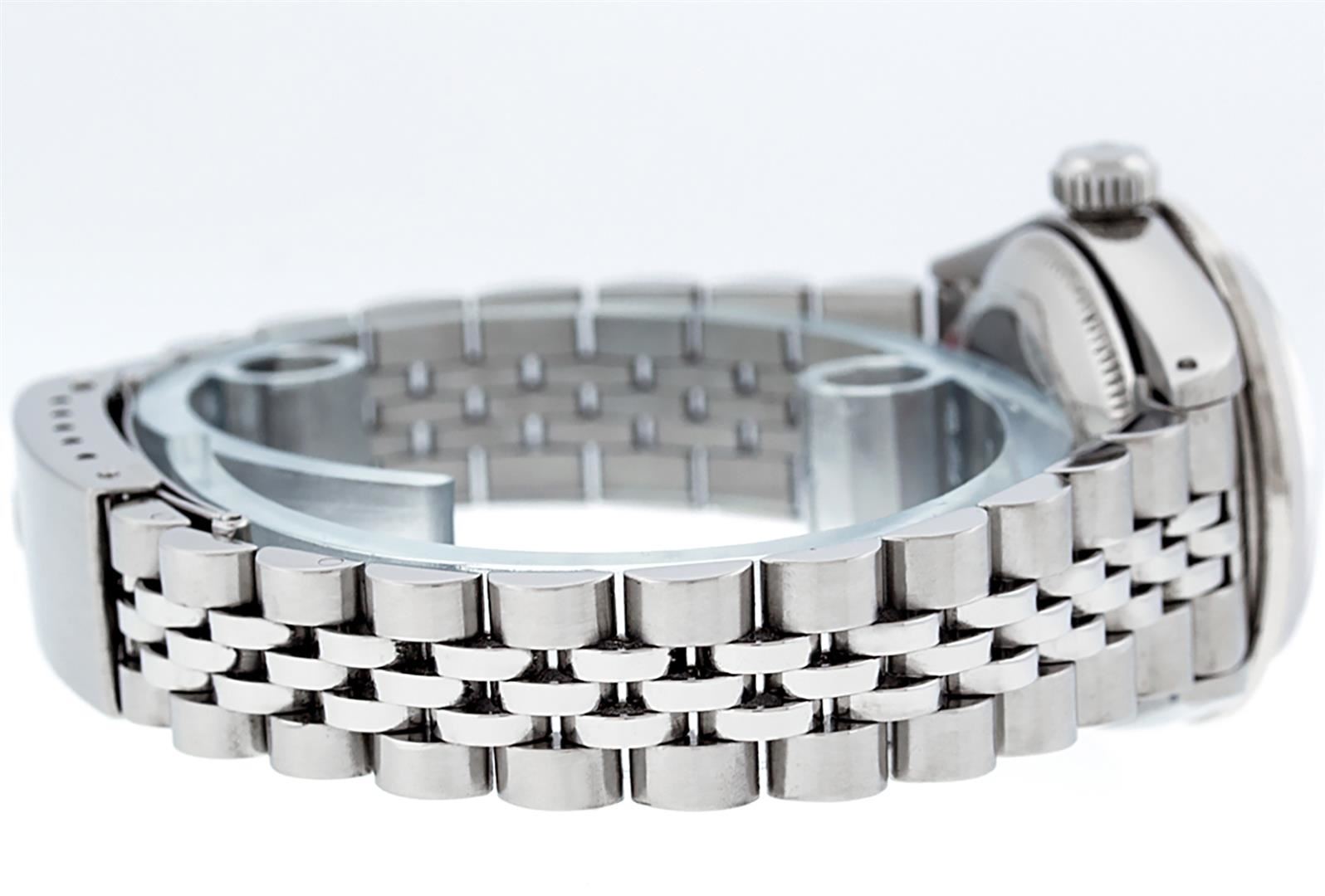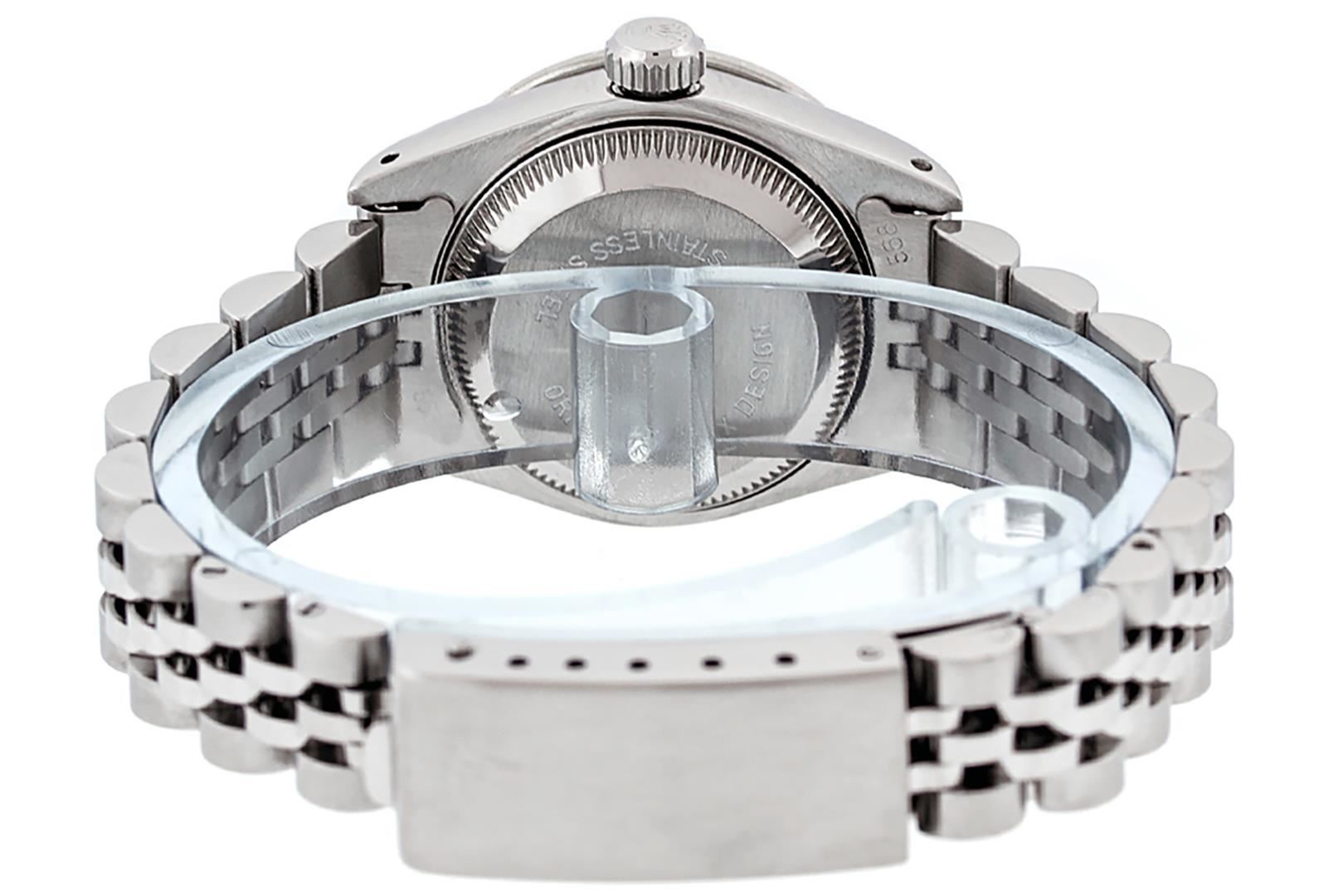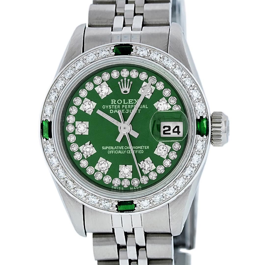 One Ladies Pre Owned Stainless Steel Rolex Datejust Polished Bright with Satin Finish, Serviced & Electronically Tested, Stainless Steel Case: 26mm, Stainless Steel Crown. Custom Bezel: New 18K White Gold Beadset & Emerald Diamond Bezel, Diamond Count: 28