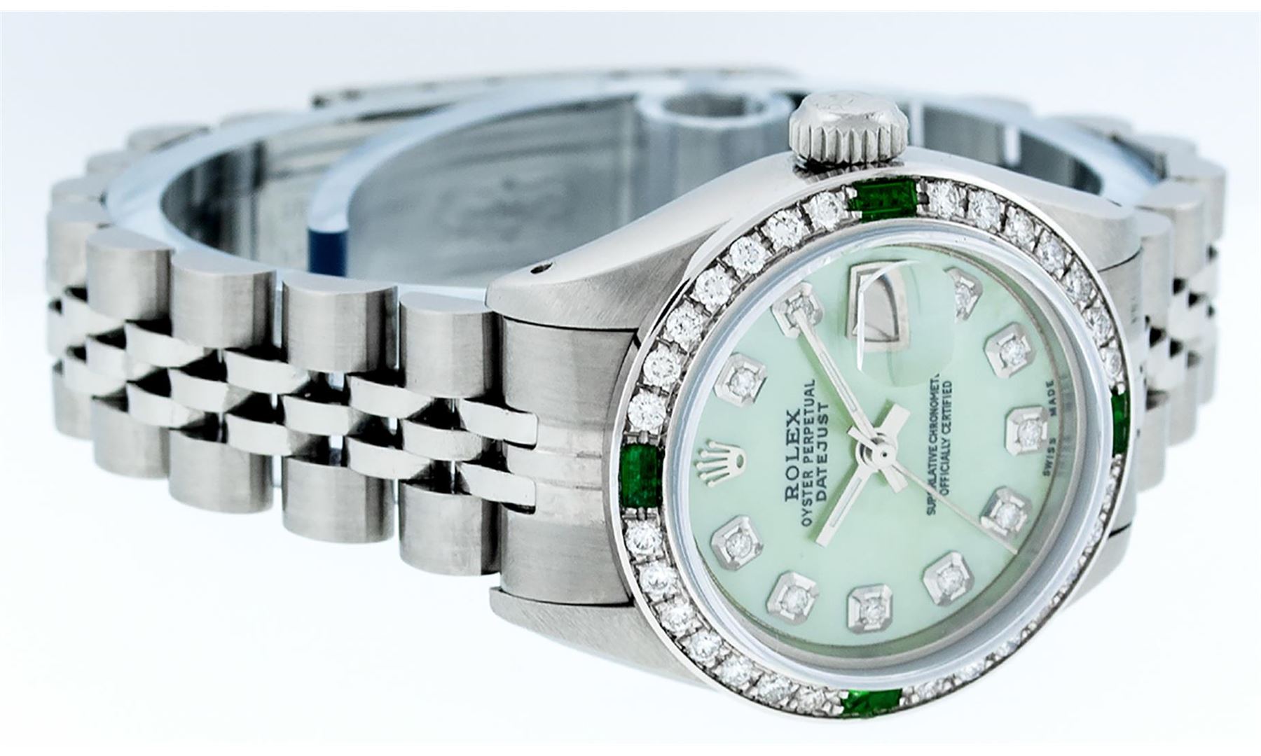 One Ladies Stainless Steel Rolex Datejust Polished Bright with Satin Finish, Serviced & Electronically Tested, Stainless Steel Case: 26mm, Stainless Steel Crown. Custom Bezel: New 18K White Gold Beadset & Synthetic Emerald Diamond Bezel, Diamond Count: 28 Diamonds + 4 Synthetic Emeralds. Total Weight .70 Carat, Clarity: SI-VS, Color: G to H. Custom Crystal: New Synthetic Sapphire Cyclops Lens. Custom Hands: New Luminescent Hands. Movement: Automatic Winding Movement. Custom Dial: Refinished Green Mother Of Pearl Diamond Dial, Stone Count: 10 Diamonds In Dial, G To H In Color, Clarity: SI-VS. Date Window: 3 O'clock Position Date Display, Model: Datejust. Condition: G-6 Extra Fine. Bracelet: Stainless Steel Jubilee. Bright Polish & Satin Finish. 6.0 Inch Length, Adjustable. Standard Clasp, With Rolex Logo. This Watch Has Been Serviced Time Tested And Is In Excellent Condition It Is Free Of All Scratches And Dents.