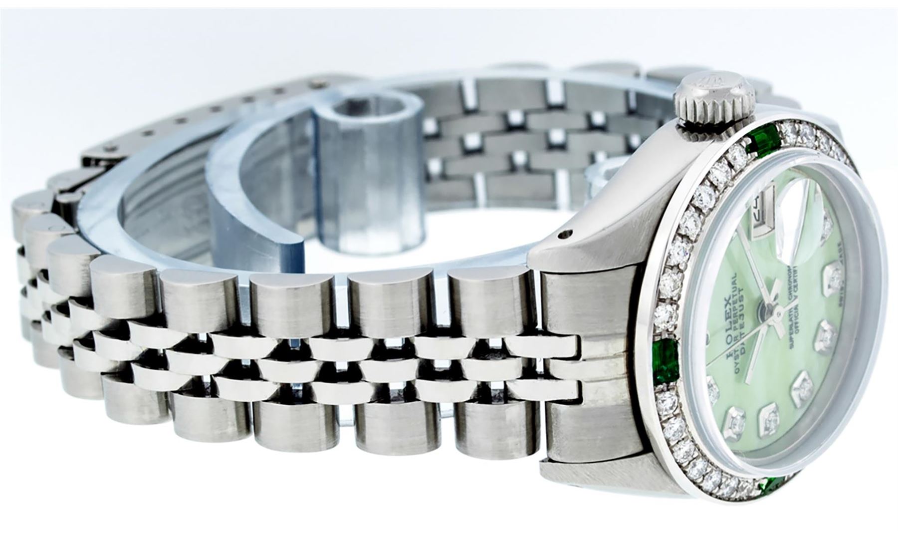 One Ladies Stainless Steel Rolex Datejust Polished Bright with Satin Finish, Serviced & Electronically Tested, Stainless Steel Case: 26mm, Stainless Steel Crown. Custom Bezel: New 18K White Gold Beadset & Synthetic Emerald Diamond Bezel, Diamond Count: 28 Diamonds + 4 Synthetic Emeralds. Total Weight .70 Carat, Clarity: SI-VS, Color: G to H. Custom Crystal: New Synthetic Sapphire Cyclops Lens. Custom Hands: New Luminescent Hands. Movement: Automatic Winding Movement. Custom Dial: Refinished Green Mother Of Pearl Diamond Dial, Stone Count: 10 Diamonds In Dial, G To H In Color, Clarity: SI-VS. Date Window: 3 O'clock Position Date Display, Model: Datejust. Condition: G-6 Extra Fine. Bracelet: Stainless Steel Jubilee. Bright Polish & Satin Finish. 6.0 Inch Length, Adjustable. Standard Clasp, With Rolex Logo. This Watch Has Been Serviced Time Tested And Is In Excellent Condition It Is Free Of All Scratches And Dents.