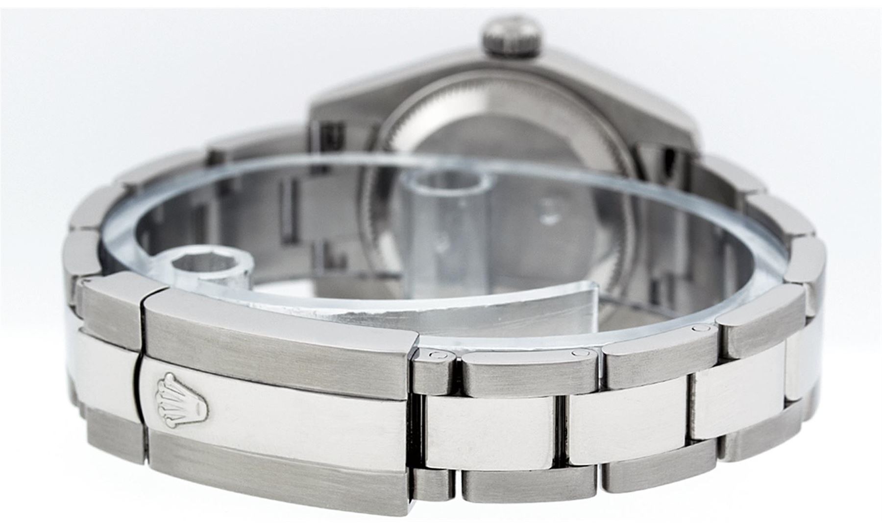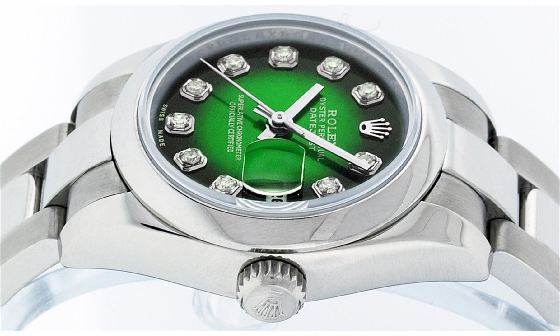 One Ladies Quickset Stainless Steel Rolex Datejust Polished Bright with Satin Finish, Serviced & Electronically Tested, Stainless Steel Case: 26mm, Stainless Steel Crown, Bezel: Stainless Steel Smooth Bezel. Custom Crystal: New Scratch Resistant Sapphire Cyclops Lens. Custom Hands: New Luminescent Hands. Movement: Automatic Winding Movement Caliber 2235. Custom Dial: Green Vignette Single Cut VS Diamond Dial, Diamond Count: 10 Single Cut Diamonds In Dial, Color: G to H, Clarity: VS. Date Window: 3 O'Clock Position Date Display, Model: 179160 Quickset Datejust. Condition: G-6 Extra Fine. Bracelet: Stainless Steel Oyster Band. Bright Polish & Satin Finish. 6.0 Inch Length, Adjustable. Standard Clasp, With Rolex Logo. This Watch Has Been Serviced Time Tested And Is In Excellent Condition It Is Free Of All Scratches And Dents. This Watch Comes With A Rolex Box.