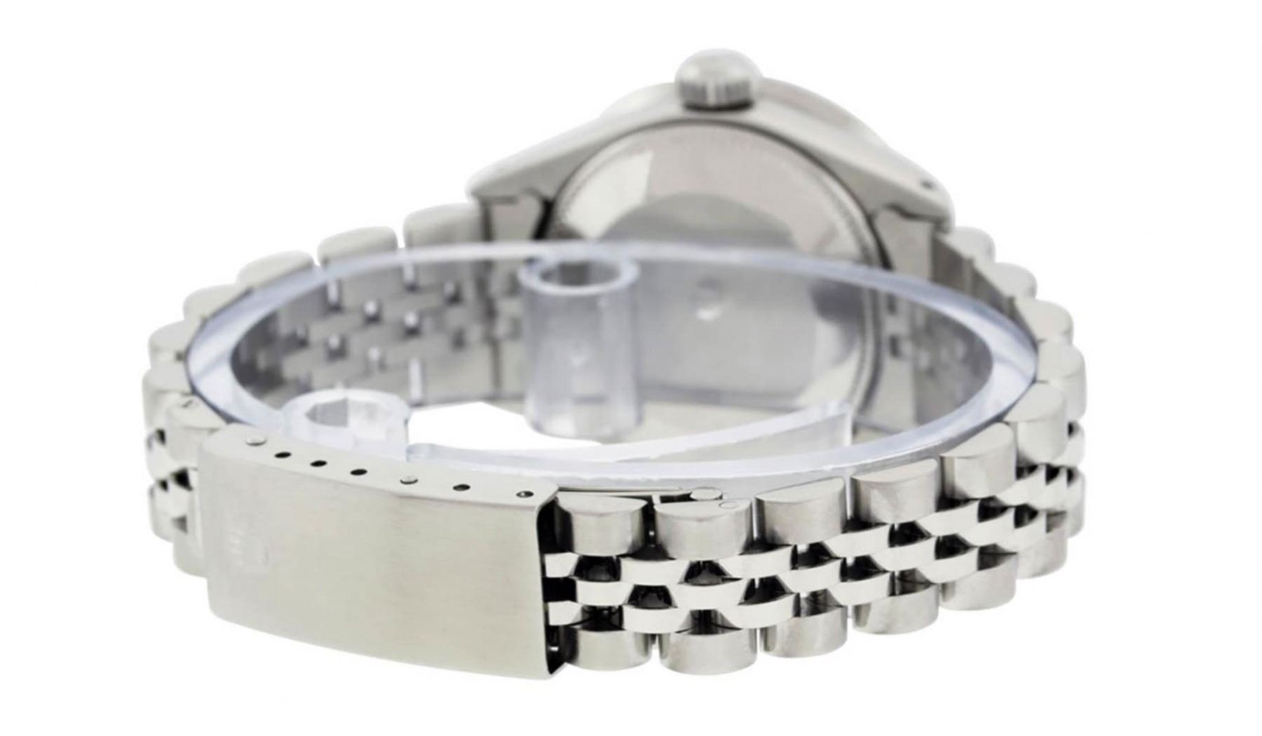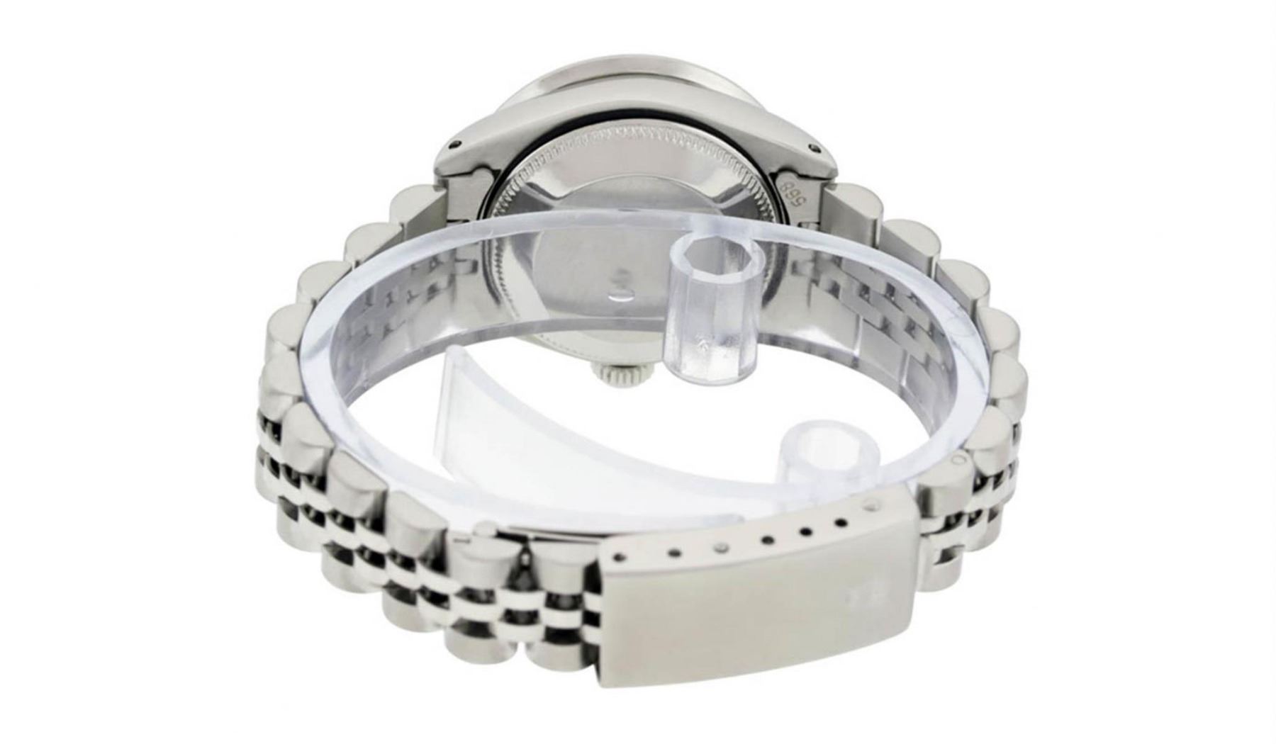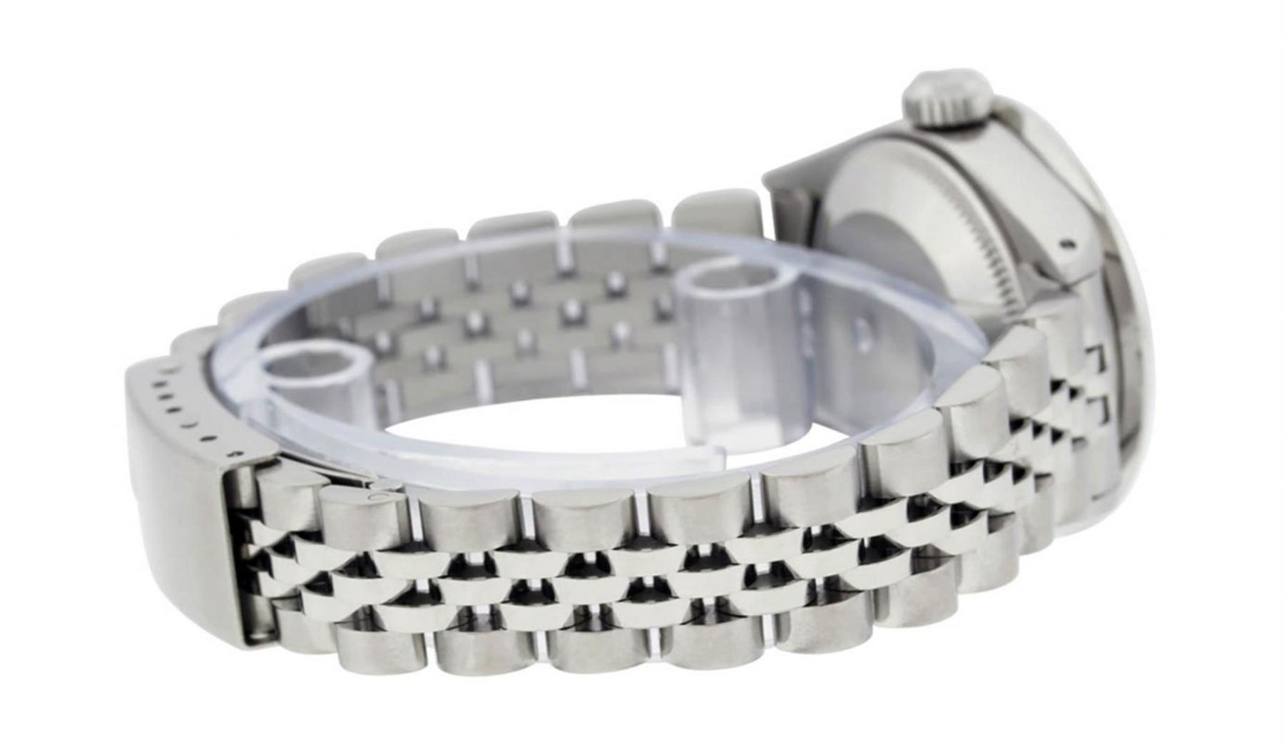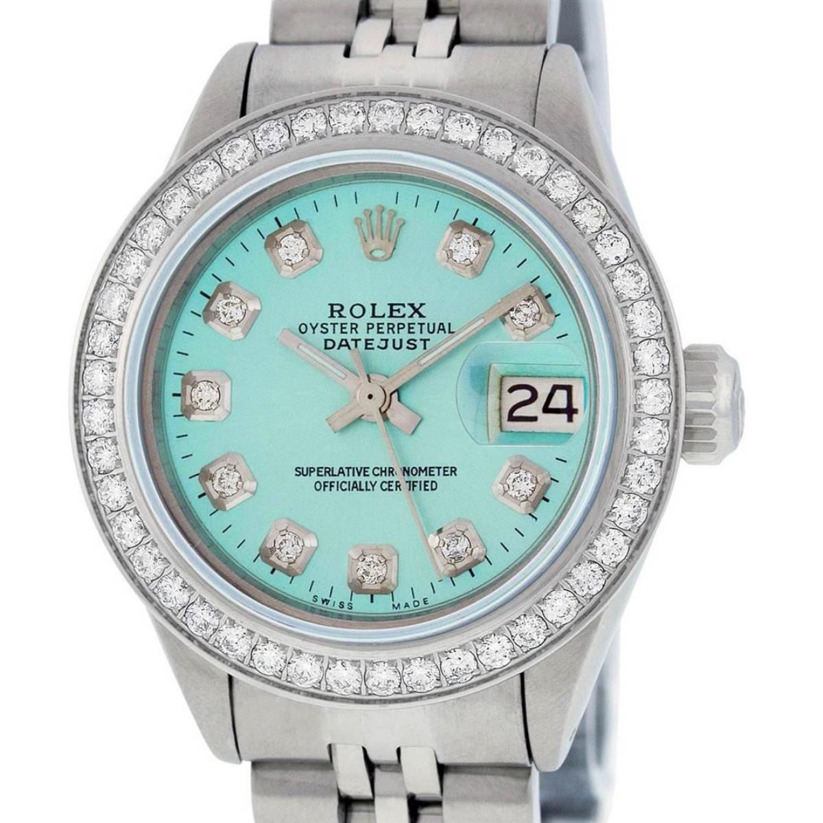 One Ladies Stainless Steel Rolex Datejust Polished Bright with Satin Finish, Serviced & Electronically Tested, Stainless Steel Case: 26mm, Stainless Steel Crown, Custom Bezel: New Stainless Steel Beadset Diamond Bezel, Diamond Count:�44 Diamonds, Total Weight .90 Carat, Clarity: SI-VS, Color: G to H. Custom Crystal: New Synthetic Sapphire Cyclops Lens. Custom Hands: New Luminescent Hands. Movement: Automatic Winding Movement Caliber 2030. Custom Dial: Refinished Ice Blue Diamond With Dash Track, Diamond Count: 10 Diamonds in Dial G To H In Color, Clarity: SI-VS. Date Window: 3 O'Clock Position Date Display, Model: Datejust. Condition: G-6 Extra Fine. Bracelet: Stainless Steel Jubilee Band. Bright Polish & Satin Finish.�6.0 Inch Length, Adjustable. Standard Clasp, With Rolex Logo.