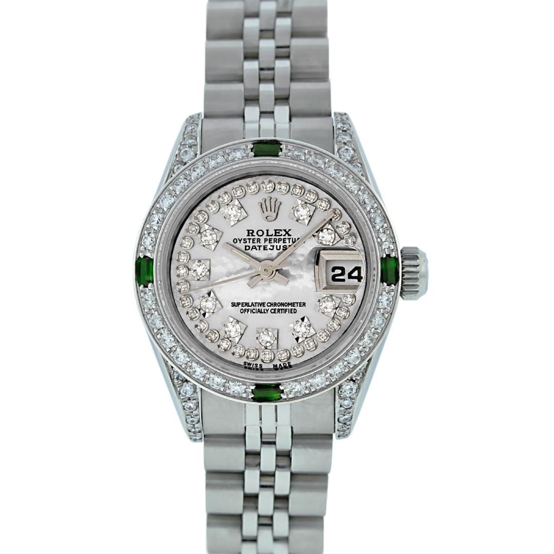 One Ladies Stainless Steel Rolex Datejust Polished Bright with Satin Finish, Serviced & Electronically Tested, Stainless Steel Case: 26mm, Stainless Steel Crown, Diamond Lugs: 24 Diamonds On Lugs, Clarity: SI-VS, Color: G to H. Custom Bezel: New 18K White Gold Synthetic Emerald Beadset Bezel, Diamond Count: 28 Diamonds + 4 Synthetic Emeralds, Total Weight .70 Carat, Clarity: SI-VS, Color: G to H. Custom Crystal: New Synthetic Sapphire Cyclops Lens. Custom Hands: New Luminescent Hands. Movement: Automatic Winding Movement. Custom Dial: Refinished Mother Of Pearl String Diamond Dial, 43 Diamonds in Dial G To H In Color, Clarity: VS. Date Window: 3 O'clock Position Date Display, Model: Datejust Condition: G-6 Extra Fine. Bracelet: Stainless Steel Jubilee. Bright Polish & Satin Finish. 6.0 Inch Length, Adjustable. Standard Clasp, With Rolex Logo. This Watch Has Been Serviced Time Tested And Is In Excellent Condition It Is Free Of All Scratches And Dents.