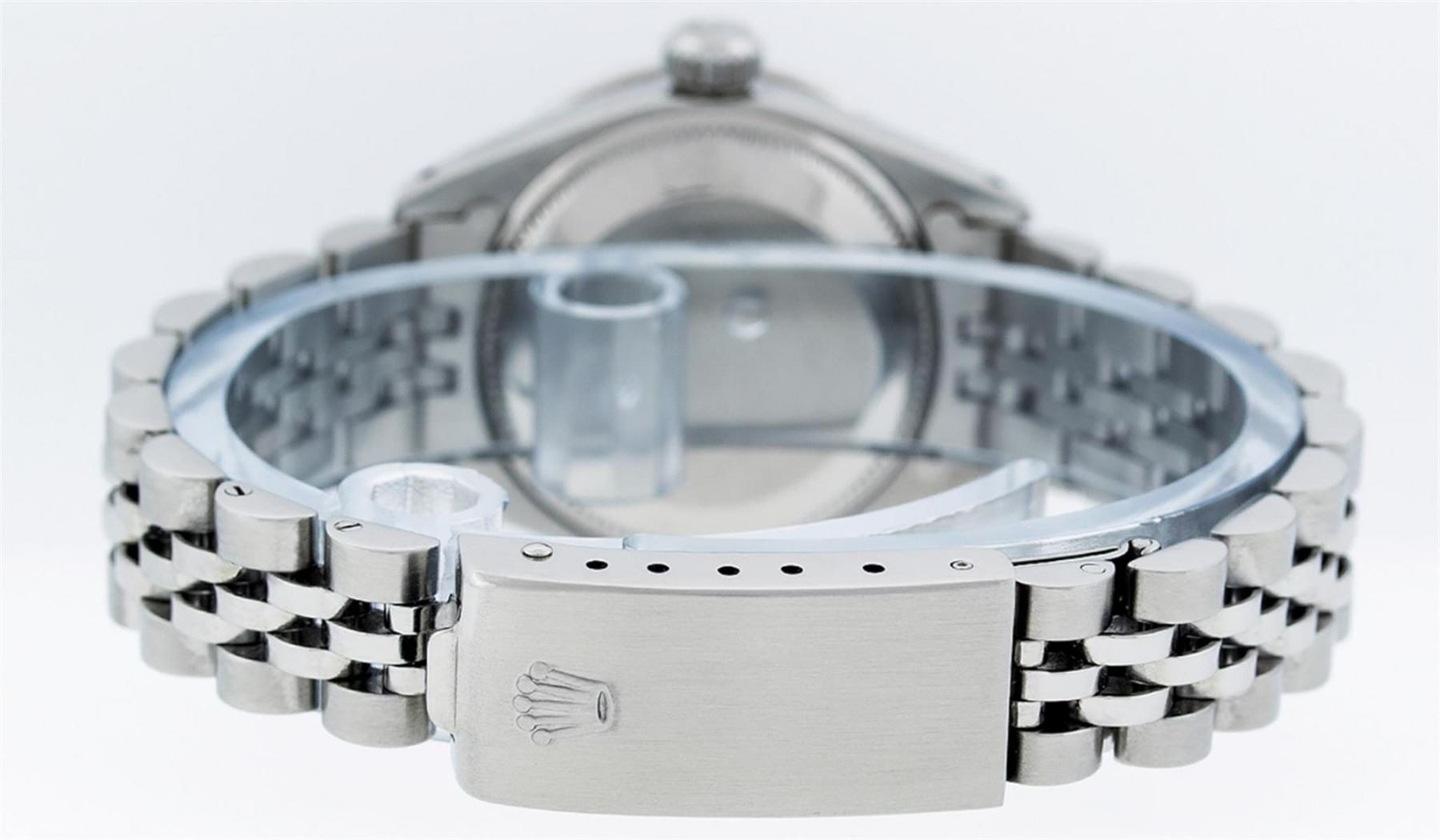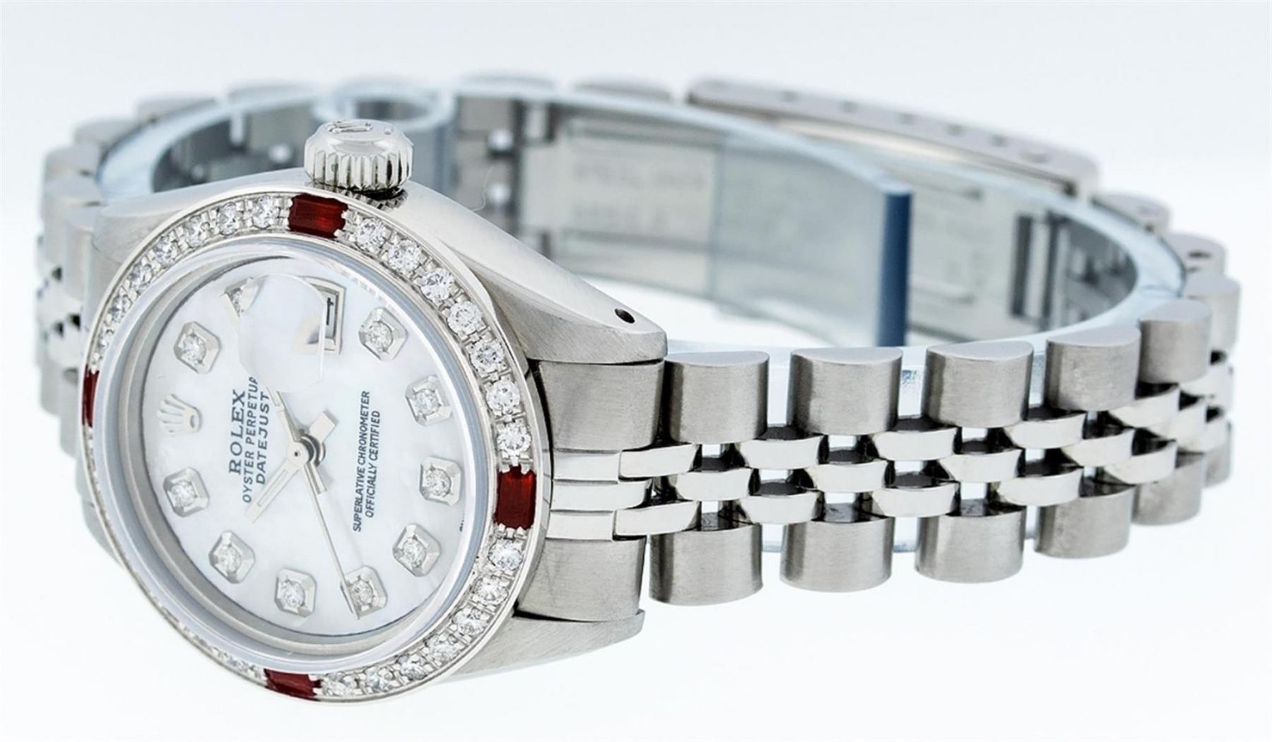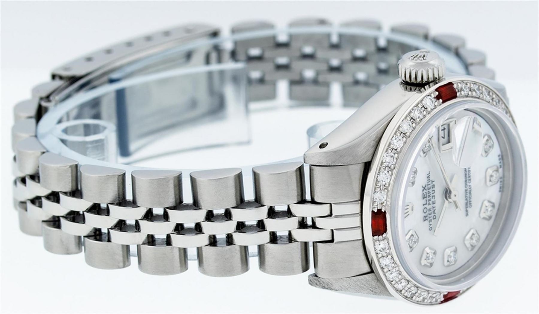 One Ladies Stainless Steel Rolex Datejust Polished Bright with Satin Finish, Serviced & Electronically Tested, Stainless Steel Case: 26mm, Stainless Steel Crown, Custom Bezel: New 18K White Gold Ruby Beadset Diamond Bezel, Diamond + Gem Count: 28 Diamonds + 4 Rubies. Total Weight .70 Carat, Clarity: SI-VS, Color: G to H. Custom Crystal: New Synthetic Sapphire Cyclops Lens. Custom Hands: New Luminescent Hands. Movement: Automatic Winding Movement. Custom Dial: Refinished Mother Of Pearl With Diamond Hour Markers, Diamond Count: 10 Diamond in Dial, G To H In Color, Clarity: SI-VS. Date Window: 3 O'Clock Position Date Display, Model: Datejust. Condition: G-6 Extra Fine. Bracelet: Stainless Steel Jubilee. Bright Polish & Satin Finish. 6.0 Inch Length, Adjustable. Standard Clasp, With Rolex Logo. This Watch Has Been Serviced Time Tested And Is In Excellent Condition It Is Free Of All Scratches And Dents.