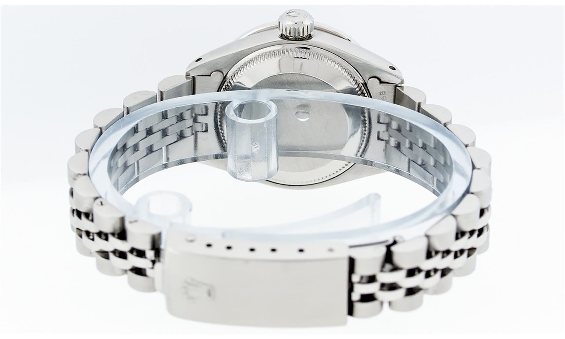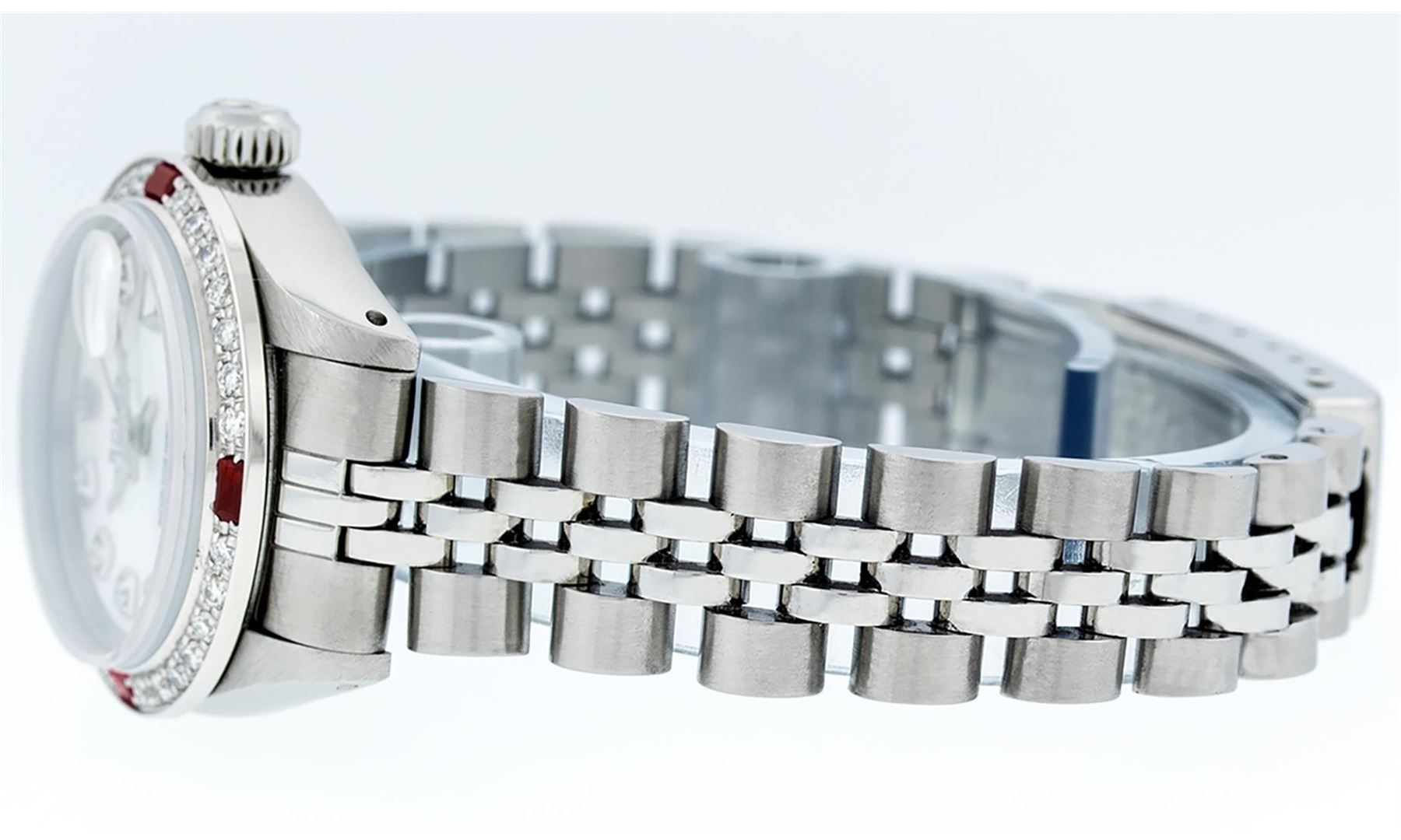 One Ladies Stainless Steel Rolex Oyster Perpetual Datejust Polished Bright with Satin Finish, Serviced & Electronically Tested, Stainless Steel Case: 26mm, Stainless Steel Crown, Custom Bezel: New 18K White Gold Ruby Beadset Diamond Bezel, Diamond + Gem Count: 28 Diamonds + 4 Rubies. Total Weight .70 Carat, Clarity: SI-VS, Color: G to H. Custom Crystal: New Synthetic Sapphire Cyclops Lens. Custom Hands: New Luminescent Hands. Movement: Automatic Winding Movement. Custom Dial: Refinished Mother Of Pearl With Diamond Hour Markers, Diamond Count: 10 Diamond in Dial, G To H In Color, Clarity: SI-VS. Date Window: 3 O'Clock Position Date Display, Model: Datejust. Condition: G-6 Extra Fine. Bracelet: Stainless Steel Jubilee. Bright Polish & Satin Finish. 6.0 Inch Length, Adjustable. Standard Clasp, With Rolex Logo. This Watch Has Been Serviced Time Tested And Is In Excellent Condition It Is Free Of All Scratches And Dents.