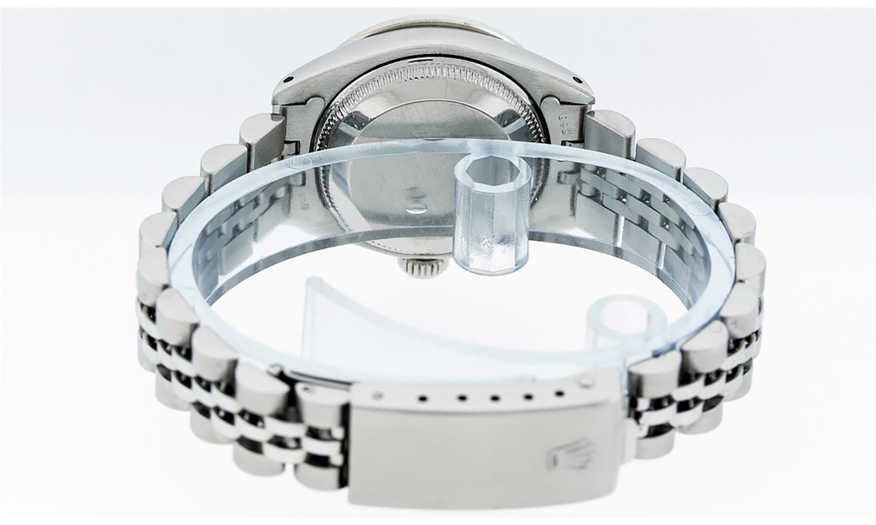 One Ladies Stainless Steel Rolex Oyster Perpetual Datejust Polished Bright with Satin Finish, Serviced & Electronically Tested, Stainless Steel Case: 26mm, Stainless Steel Crown, Custom Bezel: New 18K White Gold Ruby Beadset Diamond Bezel, Diamond + Gem Count: 28 Diamonds + 4 Rubies. Total Weight .70 Carat, Clarity: SI-VS, Color: G to H. Custom Crystal: New Synthetic Sapphire Cyclops Lens. Custom Hands: New Luminescent Hands. Movement: Automatic Winding Movement. Custom Dial: Refinished Mother Of Pearl With Diamond Hour Markers, Diamond Count: 10 Diamond in Dial, G To H In Color, Clarity: SI-VS. Date Window: 3 O'clock Position Date Display, Model: Datejust. Condition: G-6 Extra Fine. Bracelet: Stainless Steel Jubilee. Bright Polish & Satin Finish. 6.0 Inch Length, Adjustable. Standard Clasp, With Rolex Logo. This Watch Has Been Serviced Time Tested And Is In Excellent Condition It Is Free Of All Scratches And Dents.