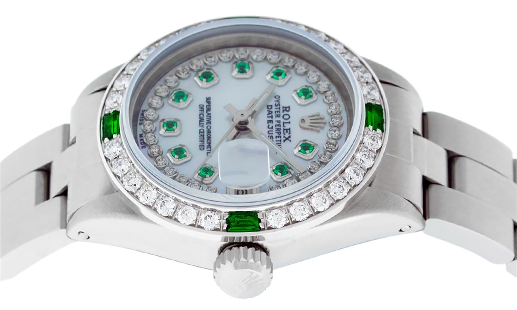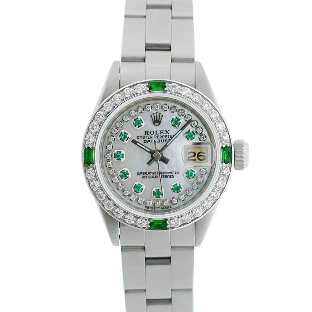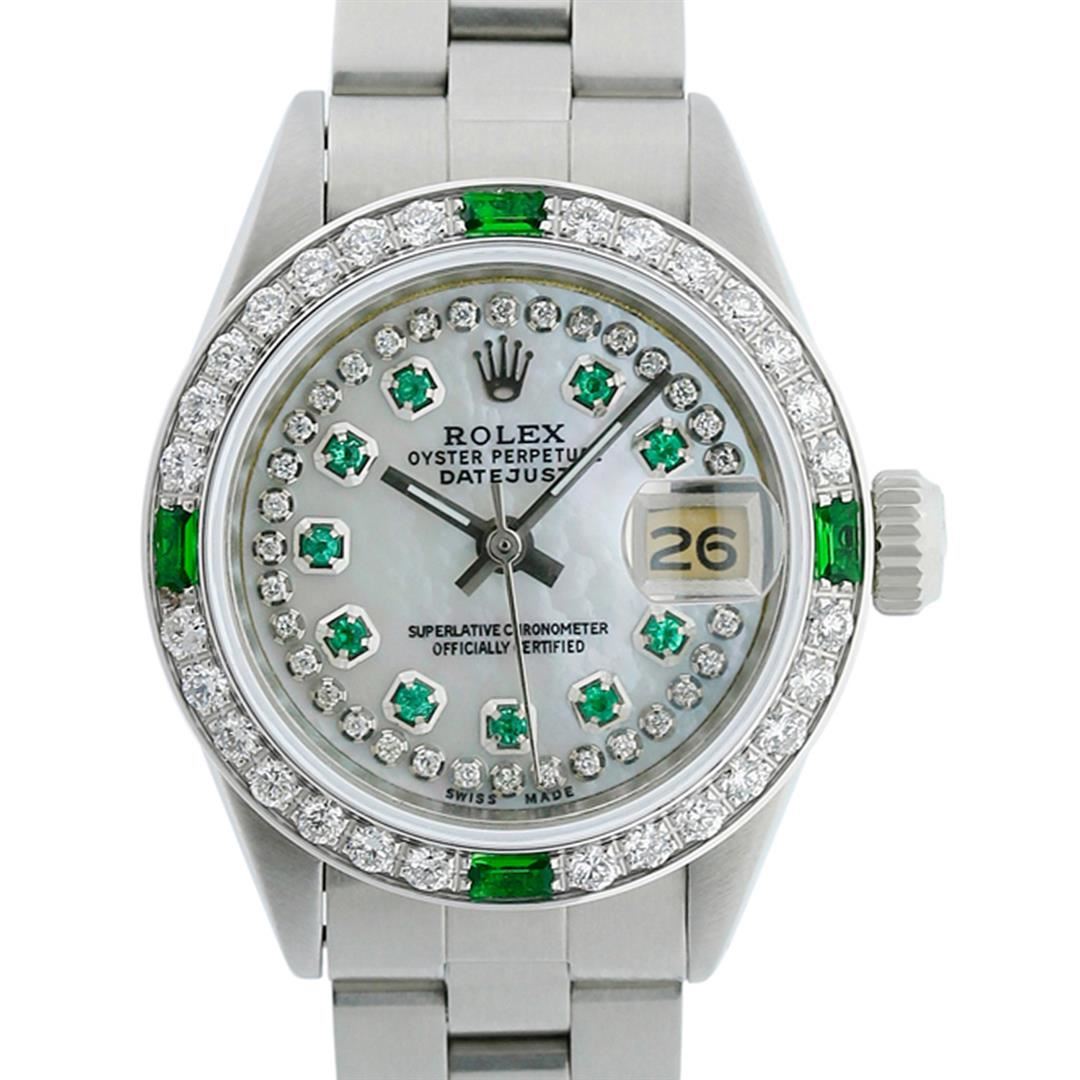 One Ladies Stainless Steel Rolex Datejust Polished Bright with Satin Finish, Serviced & Electronically Tested, Stainless Steel Case: 26mm, Stainless Steel Crown. Custom Bezel: New 18K White Gold Beadset & Emerald Diamond Bezel, Diamond Count: 28 Diamonds + 4 Emeralds. Total Weight .70 Carat, Clarity: SI-VS, Color: G to H. Custom Crystal: New Synthetic Sapphire Cyclops Lens. Custom Hands: New Luminescent Hands. Movement: Automatic Winding Movement Caliber 2030. Custom Dial: Refinished Mother Of Pearl Emerald String Diamond Dial, Stone Count: 33 Diamonds + 10 Emeralds In Dial, G To H In Color, Clarity: SI-VS. Date Window: 3 O'clock Position Date Display, Model: Datejust. Condition: G-6 Extra Fine. Bracelet: Stainless Steel Oyster. Bright Polish & Satin Finish. 6.0 Inch Length, Adjustable. Standard Clasp, With Rolex Logo. This Watch Has Been Serviced Time Tested And Is In Excellent Condition It Is Free Of All Scratches And Dents.