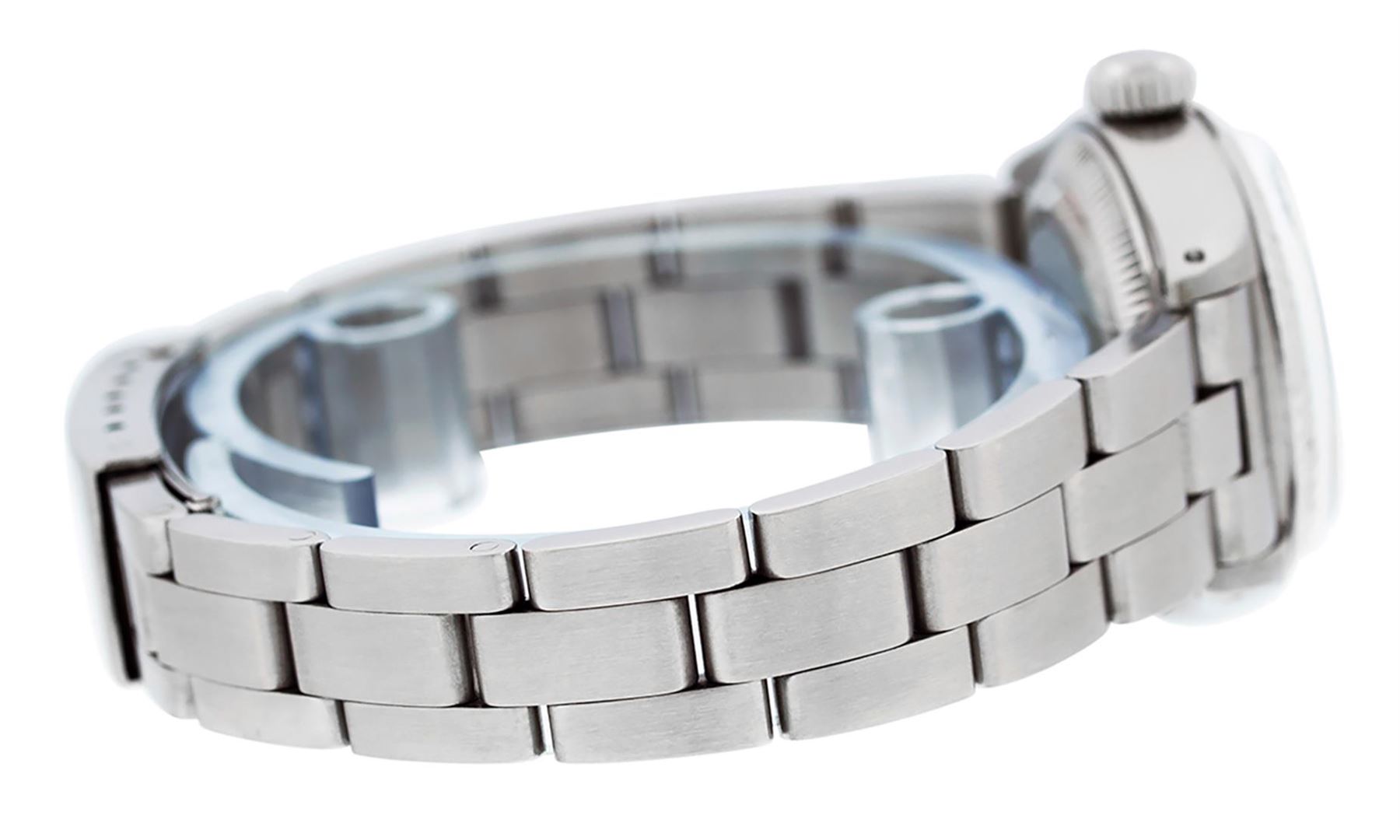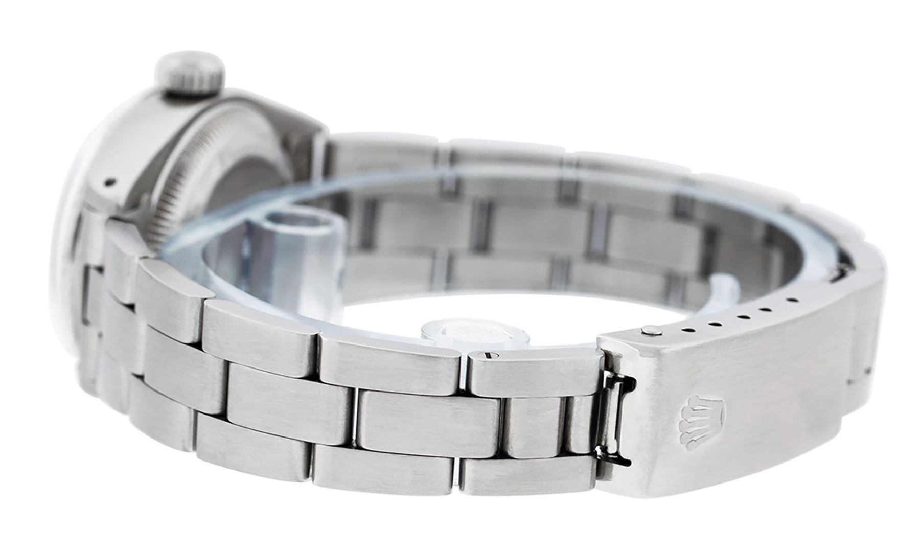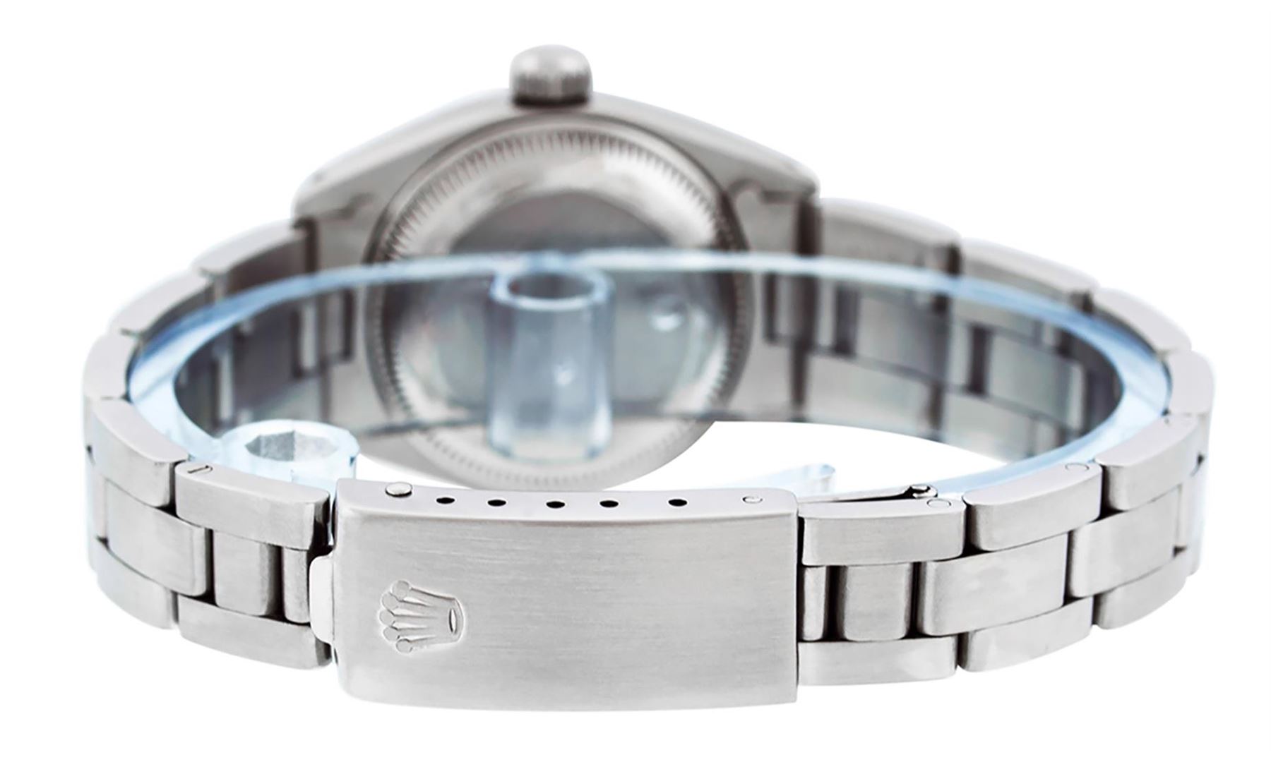One Ladies Stainless Steel Rolex Datejust Polished Bright with Satin Finish, Serviced & Electronically Tested, Stainless Steel Case: 26mm, Stainless Steel Crown. Custom Bezel: New 18K White Gold Beadset & Emerald Diamond Bezel, Diamond Count: 28 Diamonds + 4 Emeralds. Total Weight .70 Carat, Clarity: SI-VS, Color: G to H. Custom Crystal: New Synthetic Sapphire Cyclops Lens. Custom Hands: New Luminescent Hands. Movement: Automatic Winding Movement Caliber 2030. Custom Dial: Refinished Mother Of Pearl Emerald String Diamond Dial, Stone Count: 33 Diamonds + 10 Emeralds In Dial, G To H In Color, Clarity: SI-VS. Date Window: 3 O'clock Position Date Display, Model: Datejust. Condition: G-6 Extra Fine. Bracelet: Stainless Steel Oyster. Bright Polish & Satin Finish. 6.0 Inch Length, Adjustable. Standard Clasp, With Rolex Logo. This Watch Has Been Serviced Time Tested And Is In Excellent Condition It Is Free Of All Scratches And Dents.