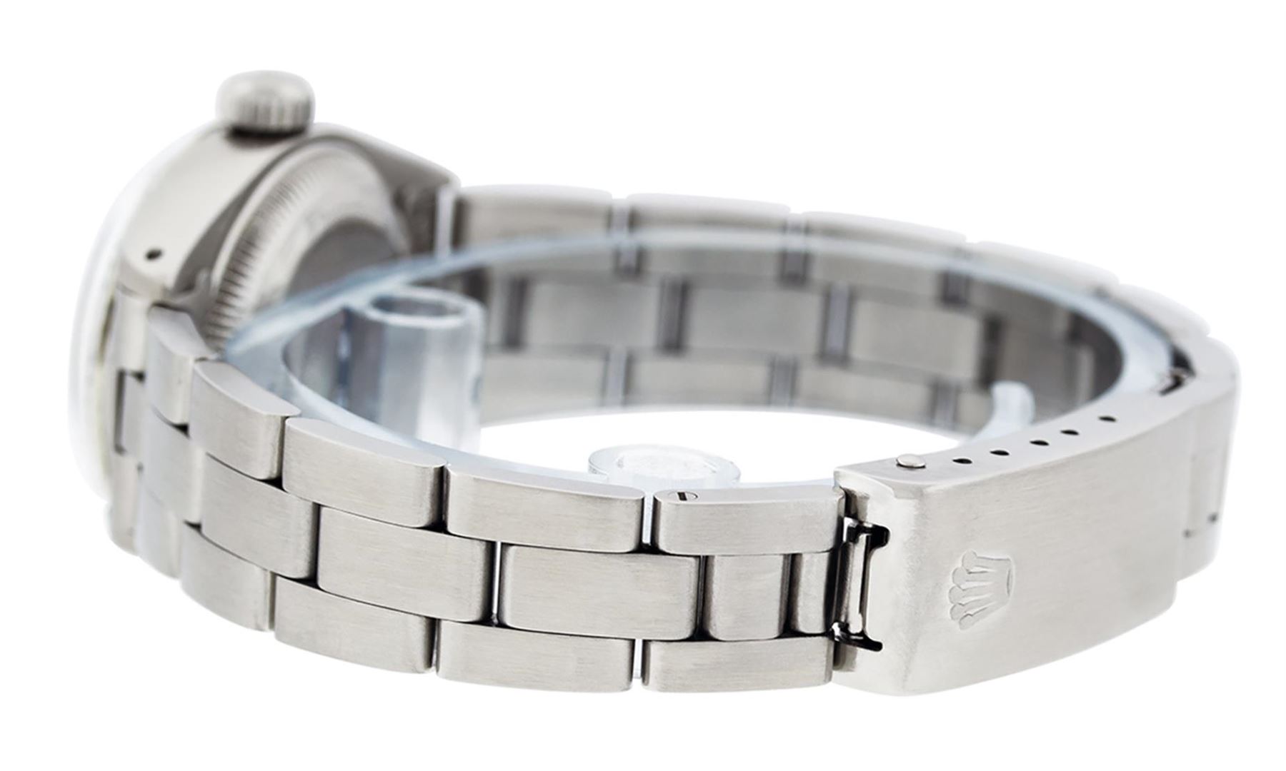 One Ladies Stainless Steel Rolex Datejust Polished Bright with Satin Finish, Serviced & Electronically Tested, Stainless Steel Case: 26mm, Stainless Steel Crown. Custom Bezel: New 18K White Gold Beadset & Synthetic Emerald Diamond Bezel, Diamond Count: 28 Diamonds + 4 Synthetic Emeralds. Total Weight .70 Carat, Clarity: SI-VS, Color: G to H. Custom Crystal: New Synthetic Sapphire Cyclops Lens. Custom Hands: New Luminescent Hands. Movement: Automatic Winding Movement Caliber 2030. Custom Dial: Refinished Mother Of Pearl Emerald String Diamond Dial, Stone Count: 10 Diamonds + 33Emerlads In Dial, G To H In Color, Clarity: SI-VS. Date Window: 3 O'Clock Position Date Display, Model: Datejust. Condition: G-6 Extra Fine. Bracelet: Stainless Steel Oyster. Bright Polish & Satin Finish. 6.0 Inch Length, Adjustable. Standard Clasp, With Rolex Logo. This Watch Has Been Serviced Time Tested And Is In Excellent Condition It Is Free Of All Scratches And Dents.