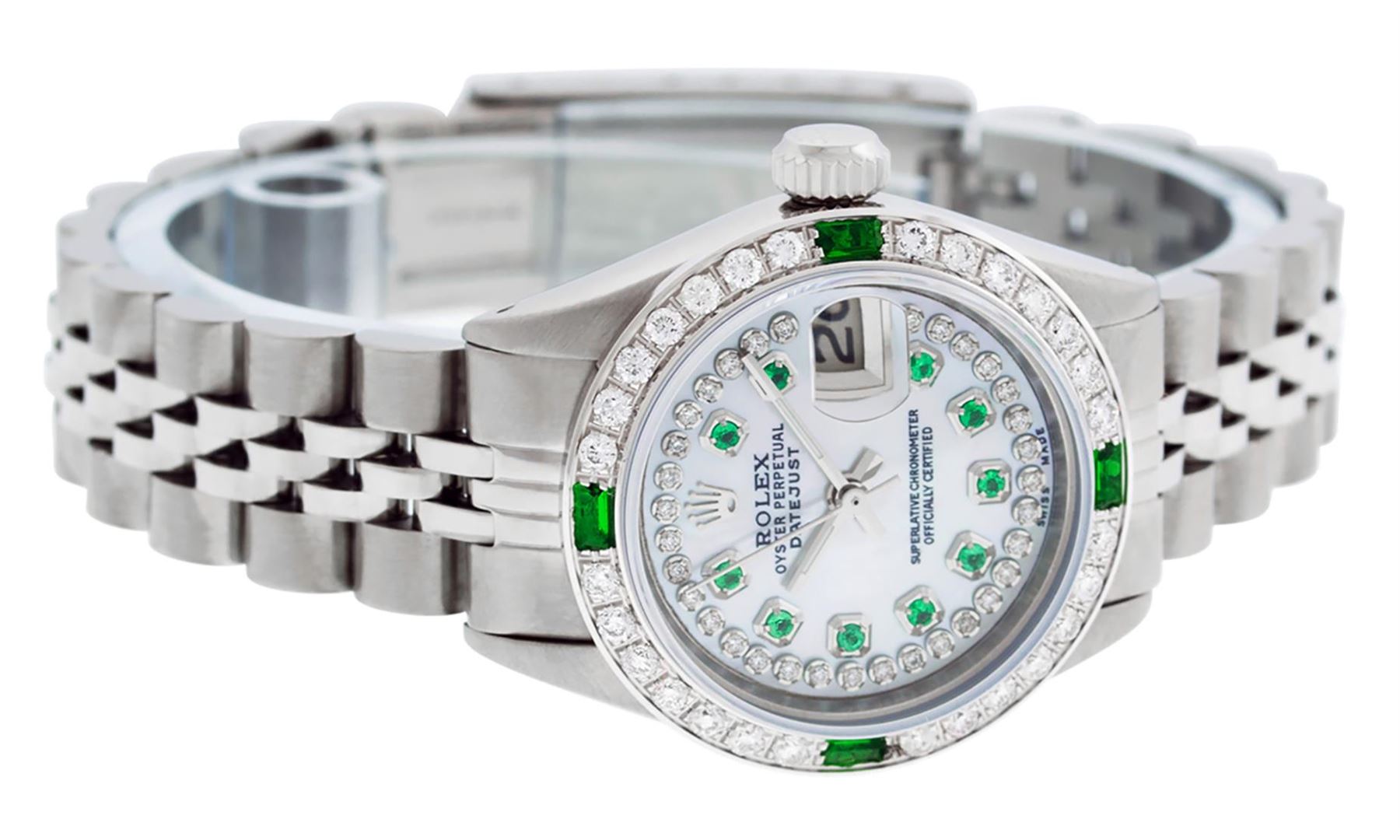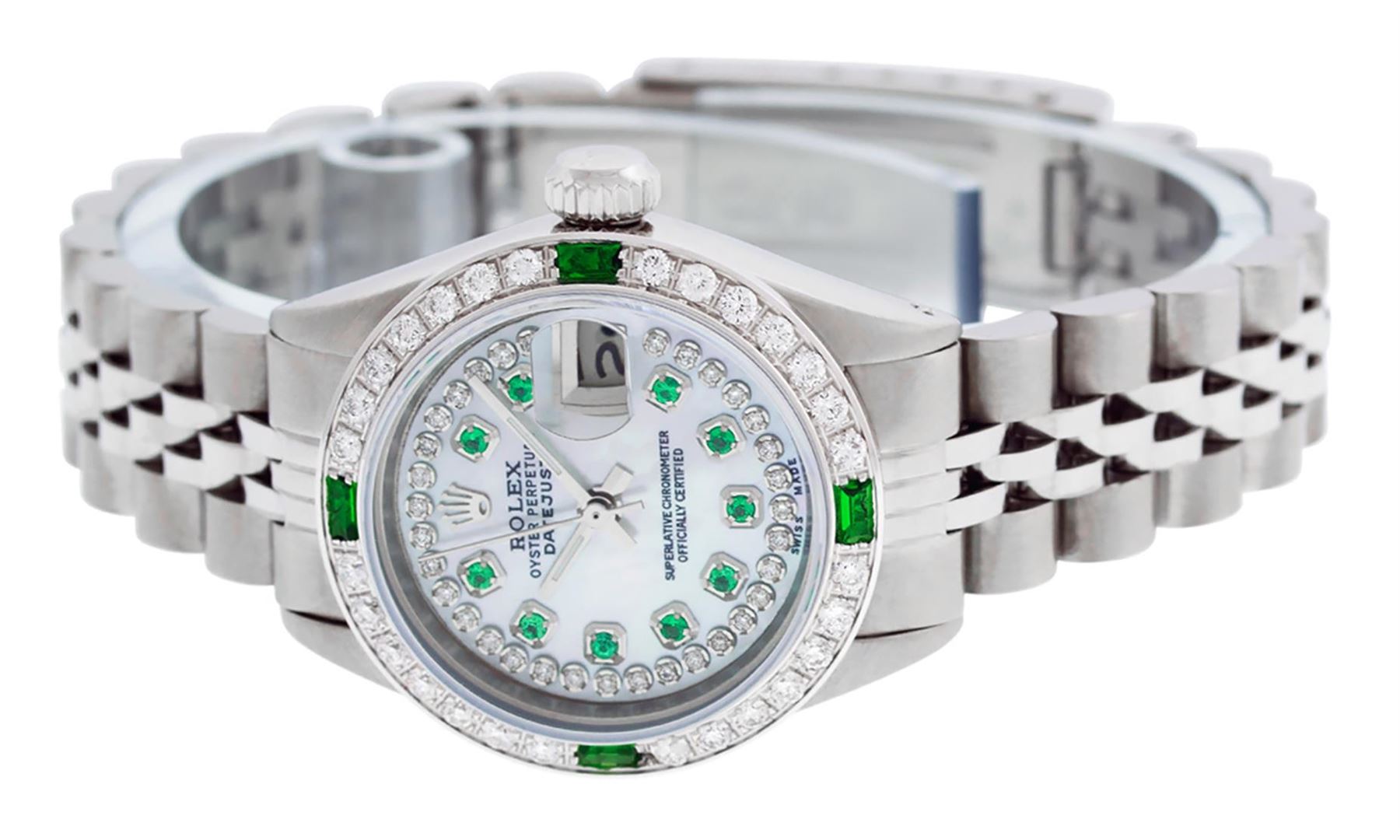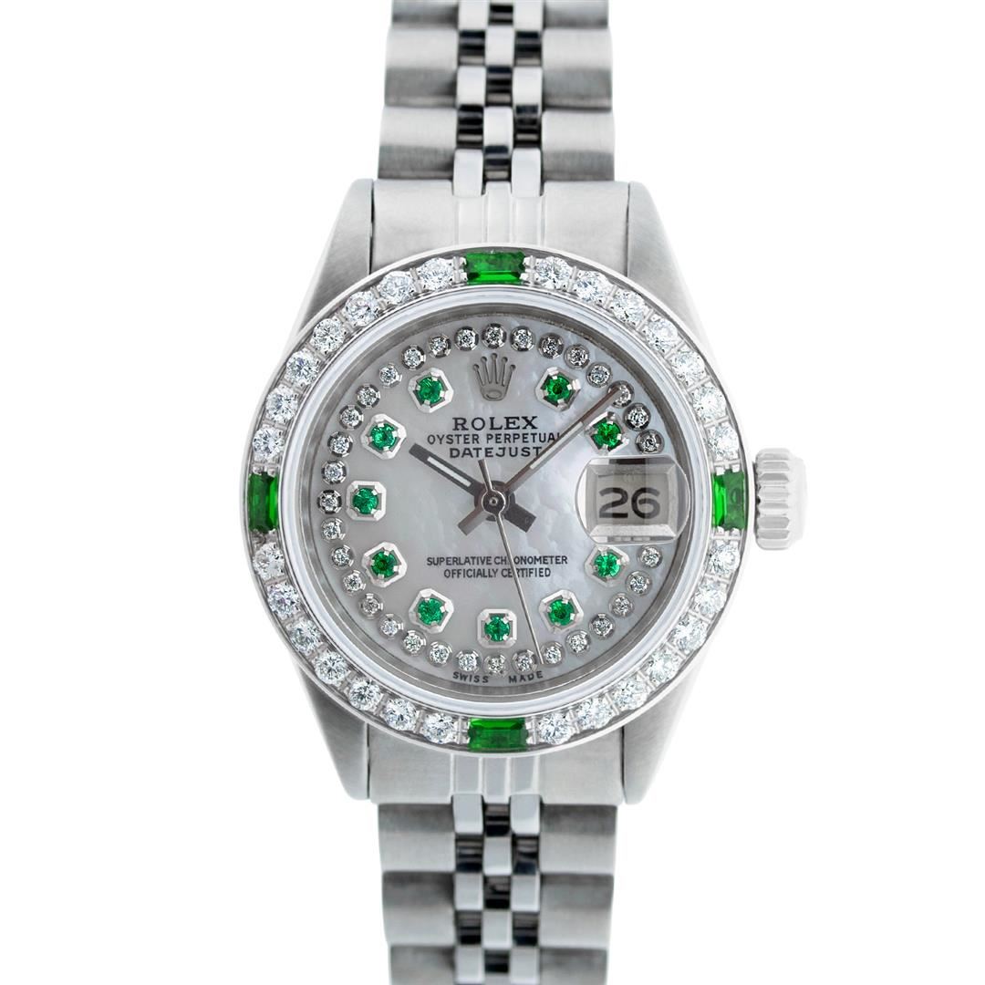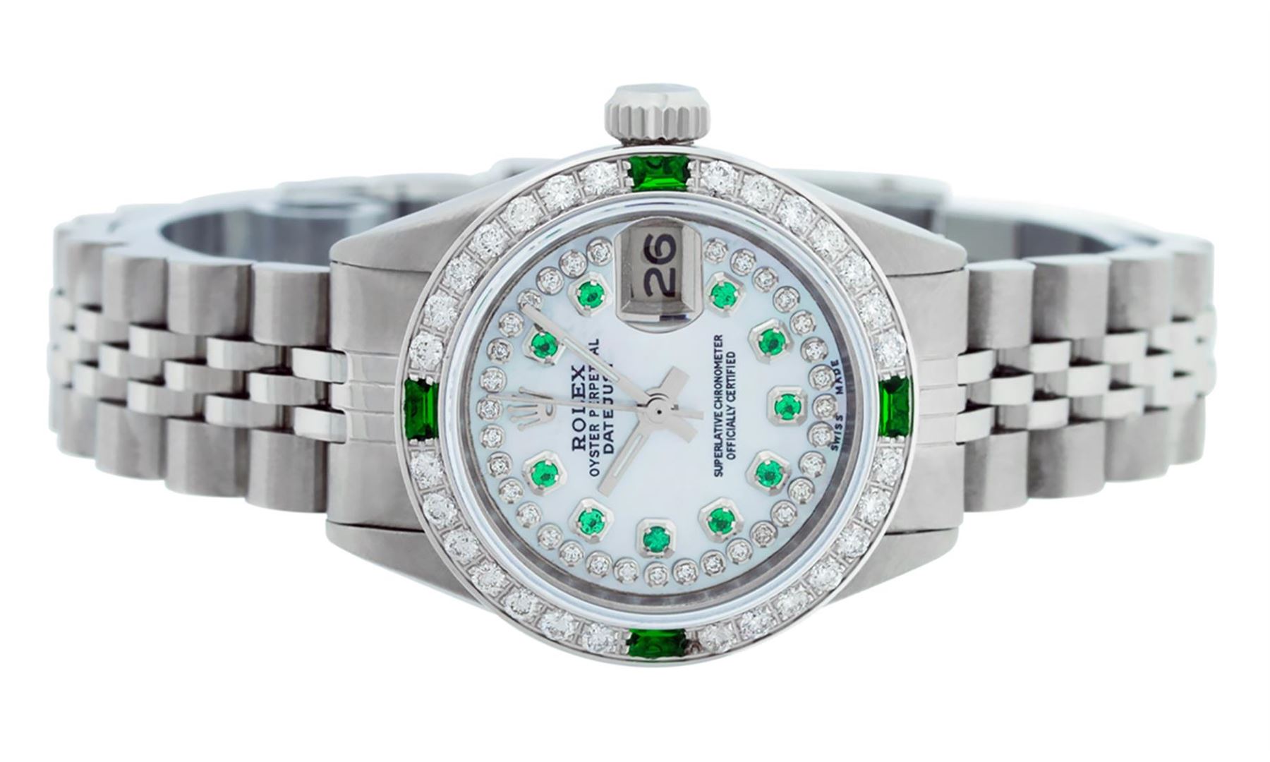 One Ladies Stainless Steel Rolex Datejust Polished Bright with Satin Finish, Serviced & Electronically Tested, Stainless Steel Case: 26mm, Stainless Steel Crown. Custom Bezel: New 18K White Gold Beadset & Emerald Diamond Bezel, Diamond Count: 28 Diamonds + 4 Synthetic Emeralds. Total Weight .70 Carat, Clarity: SI-VS, Color: G to H. Custom Crystal: New Synthetic Sapphire Cyclops Lens. Custom Hands: New Luminescent Hands. Movement: Automatic Winding Movement . Custom Dial: Refinished Mother Of Pearl Emerald String Diamond Dial, Stone Count: 10 Diamonds + 33 Diamonds In Dial, G To H In Color, Clarity: SI-VS. Date Window: 3 O'Clock Position Date Display, Model: Datejust. Condition: G-6 Extra Fine. Bracelet: Stainless Steel Jubilee. Bright Polish & Satin Finish. 6.0 Inch Length, Adjustable. Standard Clasp, With Rolex Logo. This Watch Has Been Serviced Time Tested And Is In Excellent Condition It Is Free Of All Scratches And Dents.