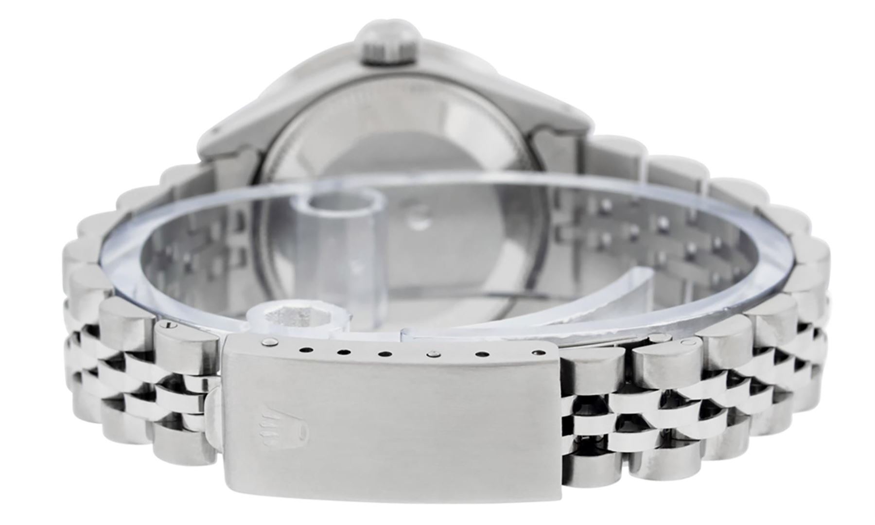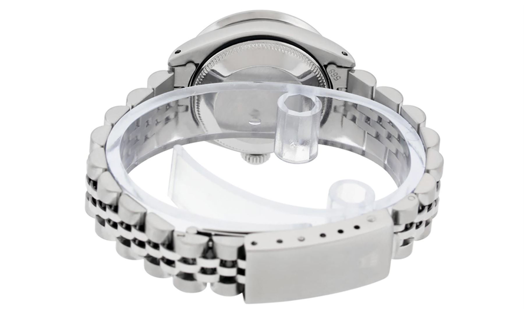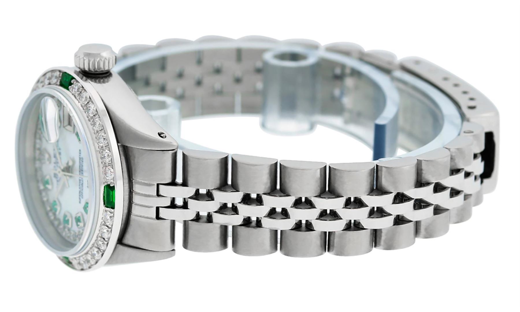 One Ladies Stainless Steel Rolex Datejust Polished Bright with Satin Finish, Serviced & Electronically Tested, Stainless Steel Case: 26mm, Stainless Steel Crown. Custom Bezel: New 18K White Gold Beadset & Emerald Diamond Bezel, Diamond Count: 28 Diamonds + 4 Synthetic Emeralds. Total Weight .70 Carat, Clarity: SI-VS, Color: G to H. Custom Crystal: New Synthetic Sapphire Cyclops Lens. Custom Hands: New Luminescent Hands. Movement: Automatic Winding Movement . Custom Dial: Refinished Mother Of Pearl Emerald String Diamond Dial, Stone Count: 10 Diamonds + 33 Diamonds In Dial, G To H In Color, Clarity: SI-VS. Date Window: 3 O'Clock Position Date Display, Model: Datejust. Condition: G-6 Extra Fine. Bracelet: Stainless Steel Jubilee. Bright Polish & Satin Finish. 6.0 Inch Length, Adjustable. Standard Clasp, With Rolex Logo. This Watch Has Been Serviced Time Tested And Is In Excellent Condition It Is Free Of All Scratches And Dents.