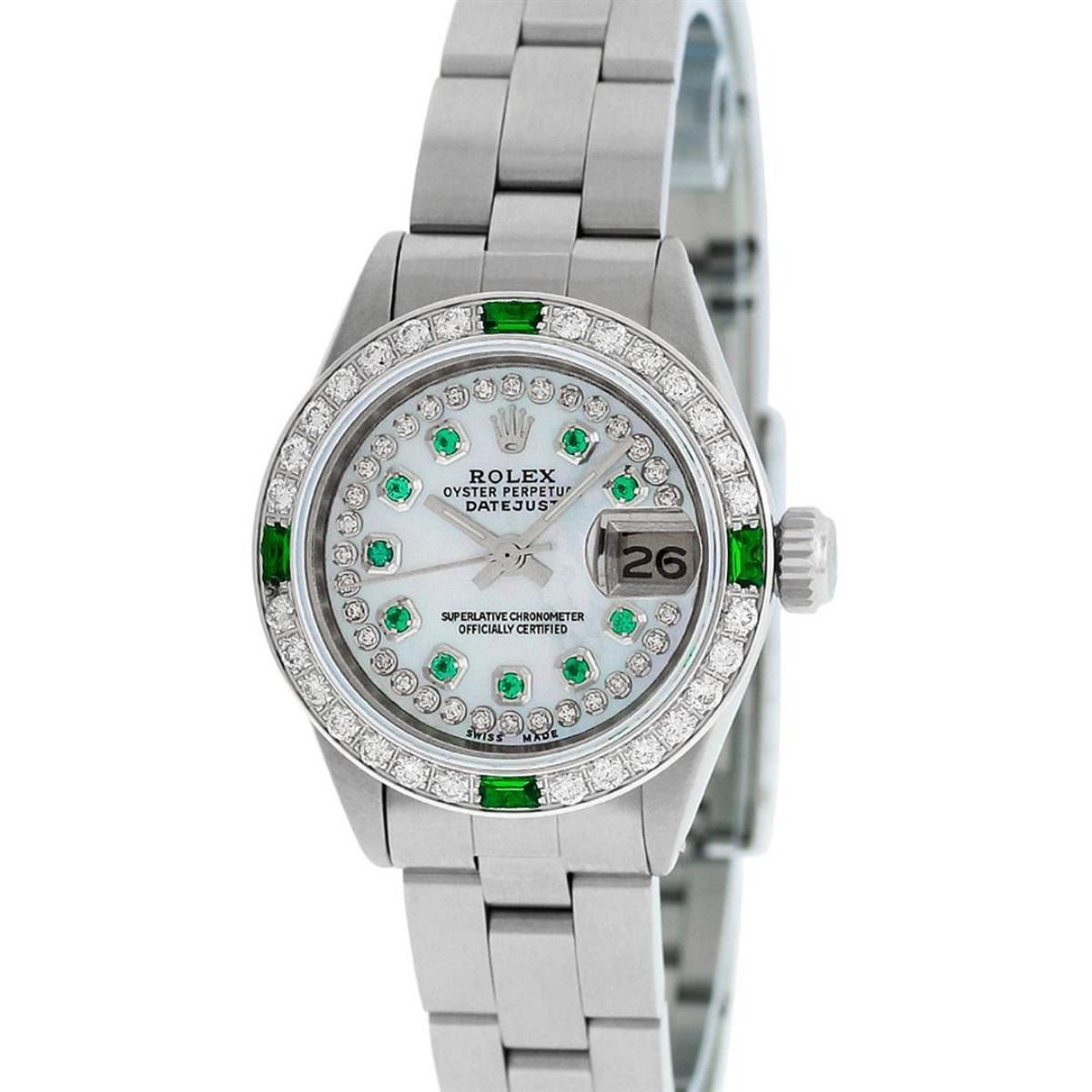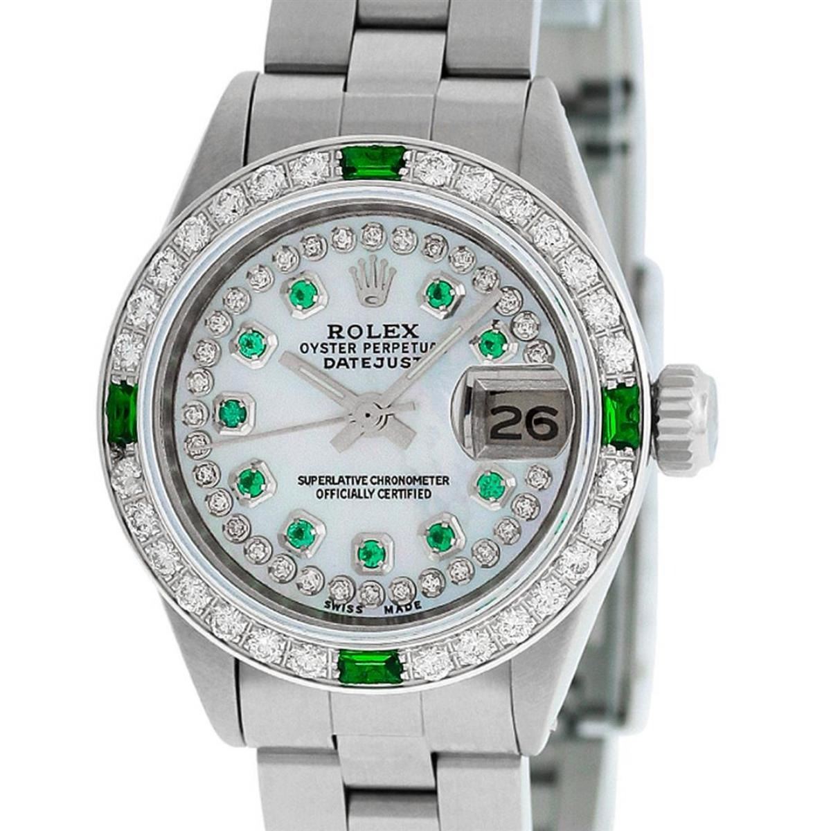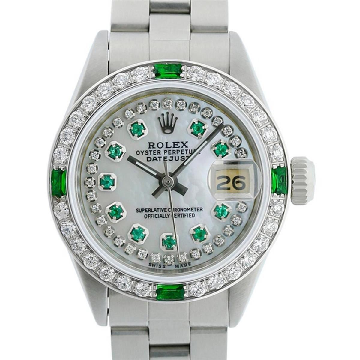One Ladies Stainless Steel Rolex Oyster Perpetual Datejust Polished Bright with Satin Finish, Serviced & Electronically Tested, Stainless Steel Case: 26mm, Stainless Steel Crown. Custom Bezel: New 18K White Gold Beadset Emerald Diamond Bezel, Diamond Count: 28 Diamonds + 4 Emeralds. Total Weight .70 Carat, Clarity: SI-VS, Color: G to H. Custom Crystal: New Scratch Resistant Synthetic Sapphire Cyclops Lens. Custom Hands: New Luminescent Hands. Movement: Automatic Winding Movement. Custom Dial: Refinished Mother Of Pearl Emerald String Diamond Dial, Stone Count: 10 Diamonds + 33Emerlads In Dial, G To H In Color, Clarity: SI-VS. Date Window: 3 O'Clock Position Date Display, Model: Datejust. Condition: G-6 Extra Fine. Bracelet: Stainless Steel Oyster. Bright Polish & Satin Finish. 6.0 Inch Length, Adjustable. Standard Clasp, With Rolex Logo. This Watch Has Been Serviced Time Tested And Is In Excellent Condition It Is Free Of All Scratches And Dents.