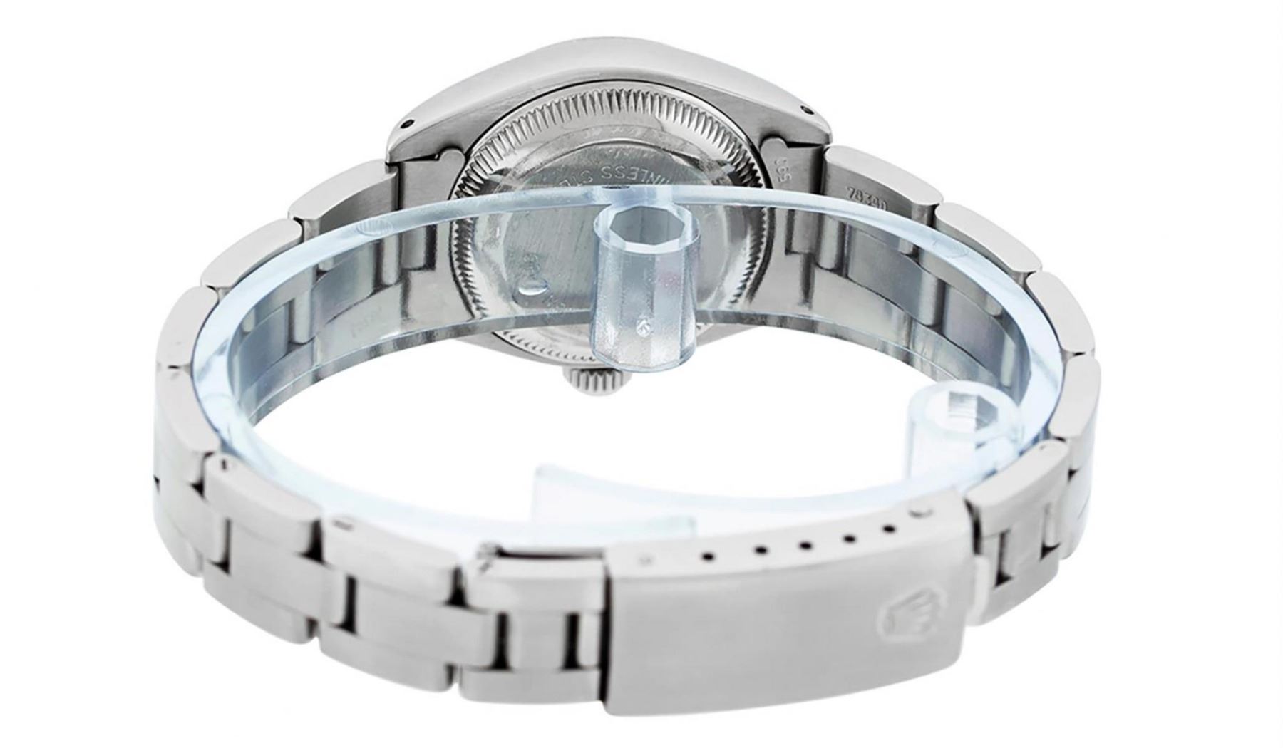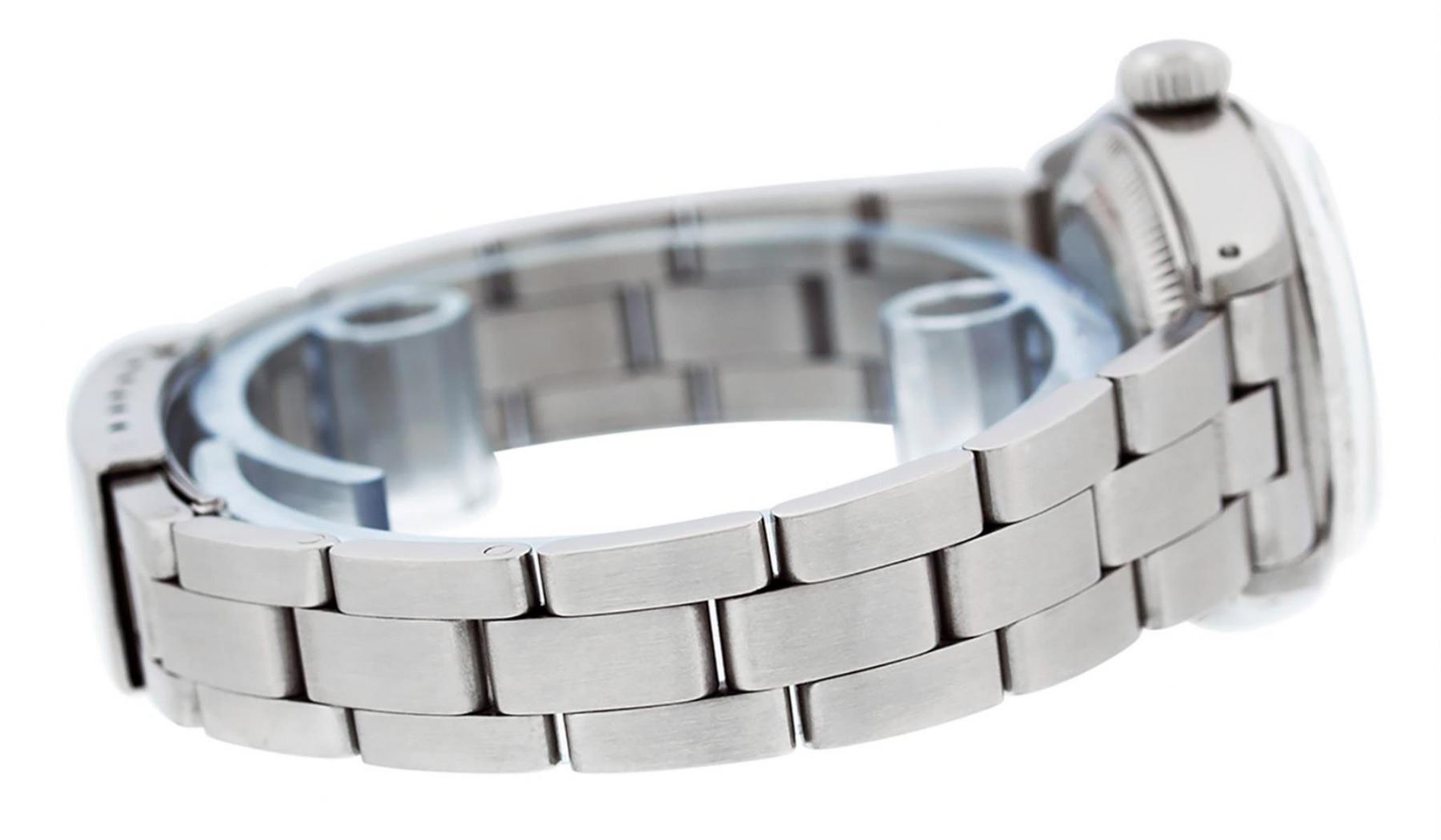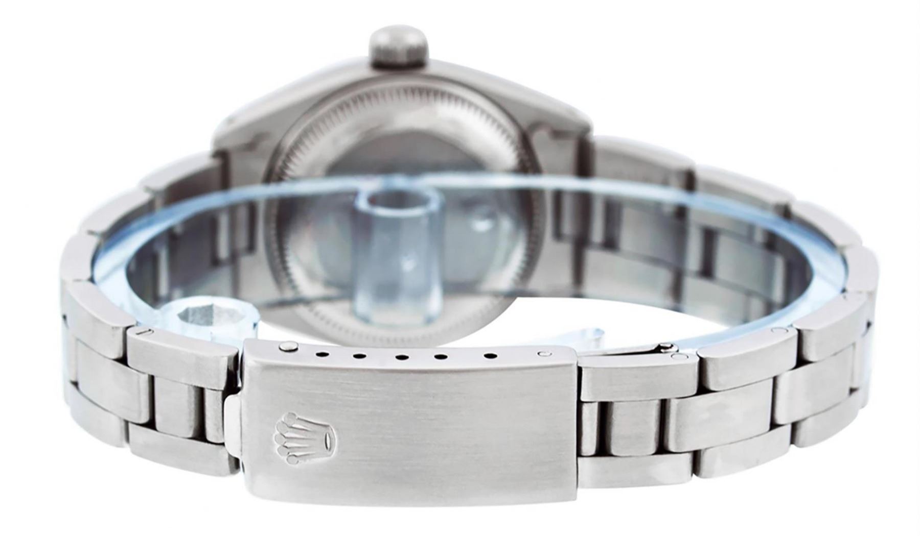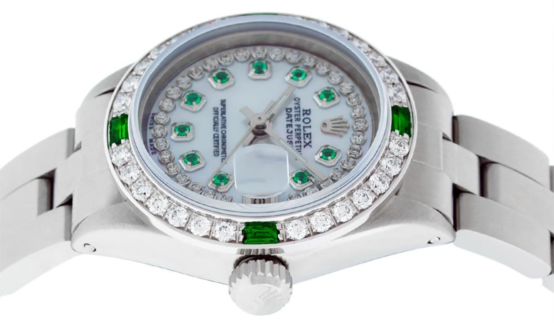 One Ladies Stainless Steel Rolex Oyster Perpetual Datejust Polished Bright with Satin Finish, Serviced & Electronically Tested, Stainless Steel Case: 26mm, Stainless Steel Crown. Custom Bezel: New 18K White Gold Beadset Emerald Diamond Bezel, Diamond Count: 28 Diamonds + 4 Emeralds. Total Weight .70 Carat, Clarity: SI-VS, Color: G to H. Custom Crystal: New Scratch Resistant Synthetic Sapphire Cyclops Lens. Custom Hands: New Luminescent Hands. Movement: Automatic Winding Movement. Custom Dial: Refinished Mother Of Pearl Emerald String Diamond Dial, Stone Count: 10 Diamonds + 33Emerlads In Dial, G To H In Color, Clarity: SI-VS. Date Window: 3 O'Clock Position Date Display, Model: Datejust. Condition: G-6 Extra Fine. Bracelet: Stainless Steel Oyster. Bright Polish & Satin Finish. 6.0 Inch Length, Adjustable. Standard Clasp, With Rolex Logo. This Watch Has Been Serviced Time Tested And Is In Excellent Condition It Is Free Of All Scratches And Dents.