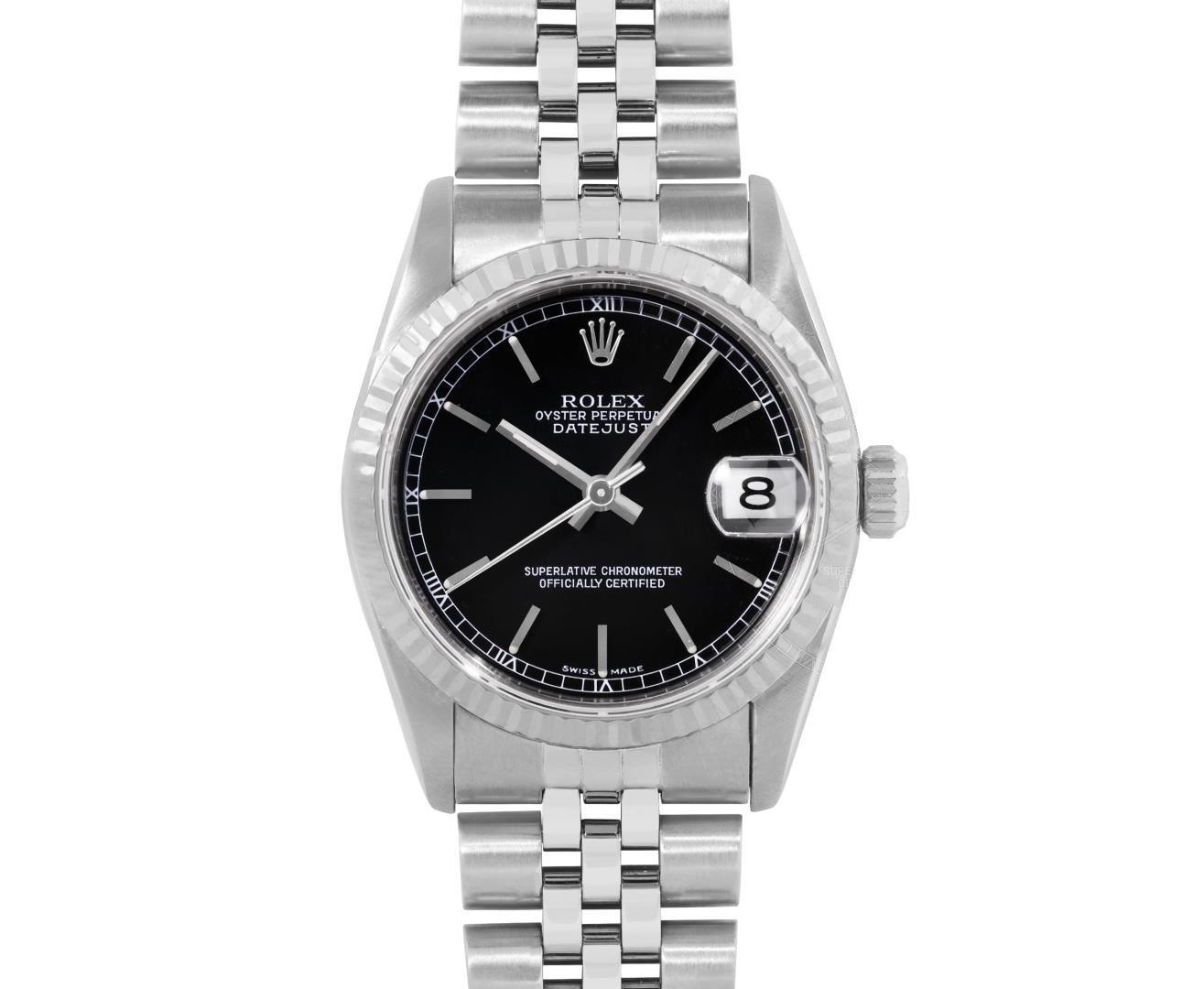 One Rolex Ladies Midsize Pre Owned Stainless Steel Datejust Wristwatch Polished with Satin Finish, Serviced And Electronically Tested, Stainless Steel Case: 31mm, Stainless Steel Crown, Bezel: 18K White Gold Fluted Bezel. Crystal: Sapphire With Magnifying Date Window. Hands: Luminescent Hands. Rolex Movement: Automatic Winding Movement 2235. Rolex Factory Dial: Black With Index Hour Markers. Date Window: 3 O'Clock Position Date Display, Model: Quickset Datejust. Condition: G-6 Extra Fine. Rolex Bracelet: Stainless Steel Jubilee Band. Bright Polish And Satin Finish. 6.0 Inch Length, Adjustable. Standard Clasp, With Rolex Logo. This Watch Has Been Serviced Time Tested And Is In Excellent Condition It Is Free Of All Scratches And Dents. This Watch Comes With A Rolex Box.