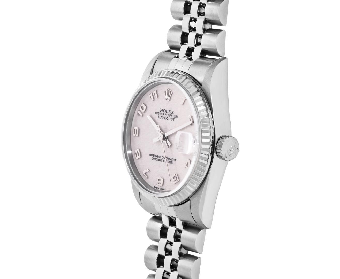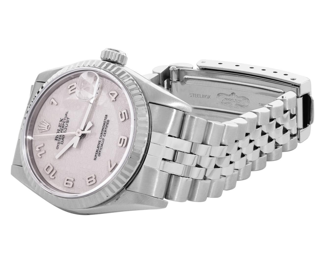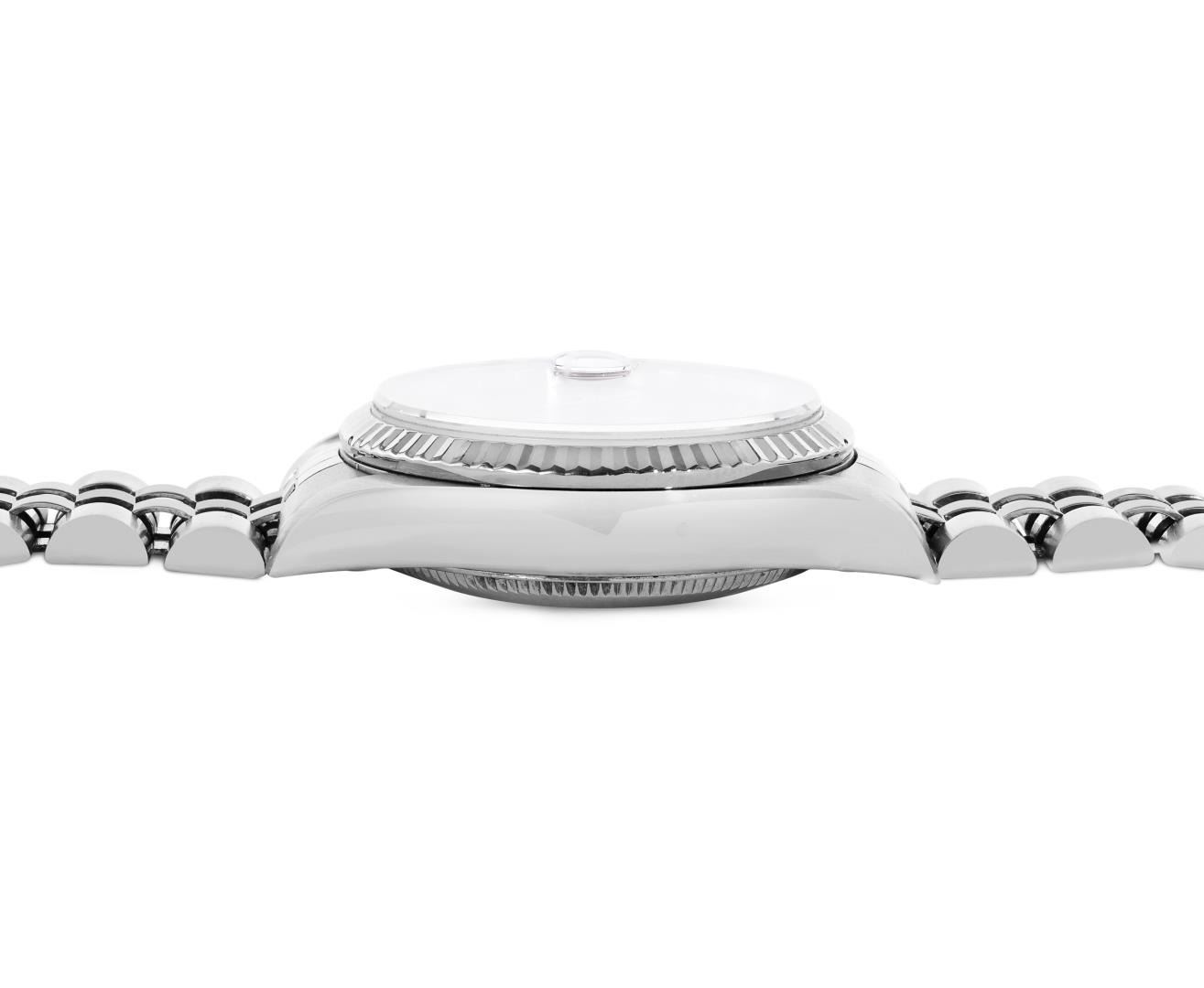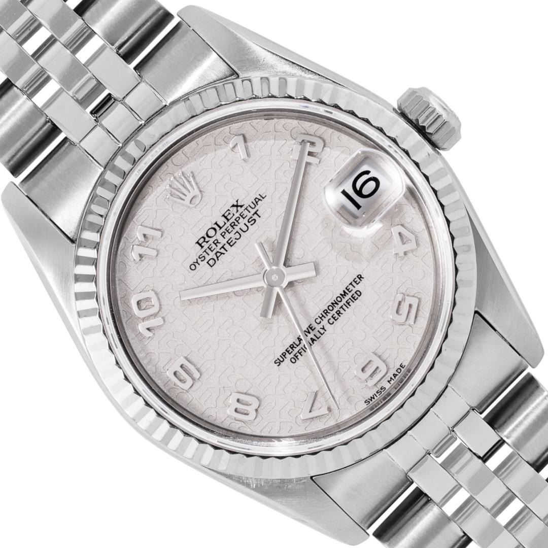 One Rolex Ladies Midsize Pre Owned Stainless Steel Datejust Wristwatch Polished with Satin Finish, Serviced And Electronically Tested, Stainless Steel Case: 31mm, Stainless Steel Crown, Bezel: 18K White Gold Fluted Bezel. Crystal: Sapphire With Magnifying Date Window. Hands: Solid Hands. Rolex Movement: Automatic Winding Movement 2235. Rolex Factory Dial: Cream Dial With Arabic Hour Markers. Date Window: 3 O'Clock Position Date Display, Model: Quickset Datejust. Condition: G-6 Extra Fine. Rolex Bracelet: Stainless Steel Jubilee Band. Bright Polish And Satin Finish. 6.0 Inch Length, Adjustable. Standard Clasp, With Rolex Logo. This Watch Has Been Serviced Time Tested And Is In Excellent Condition It Is Free Of All Scratches And Dents. This Watch Comes With A Rolex Box.