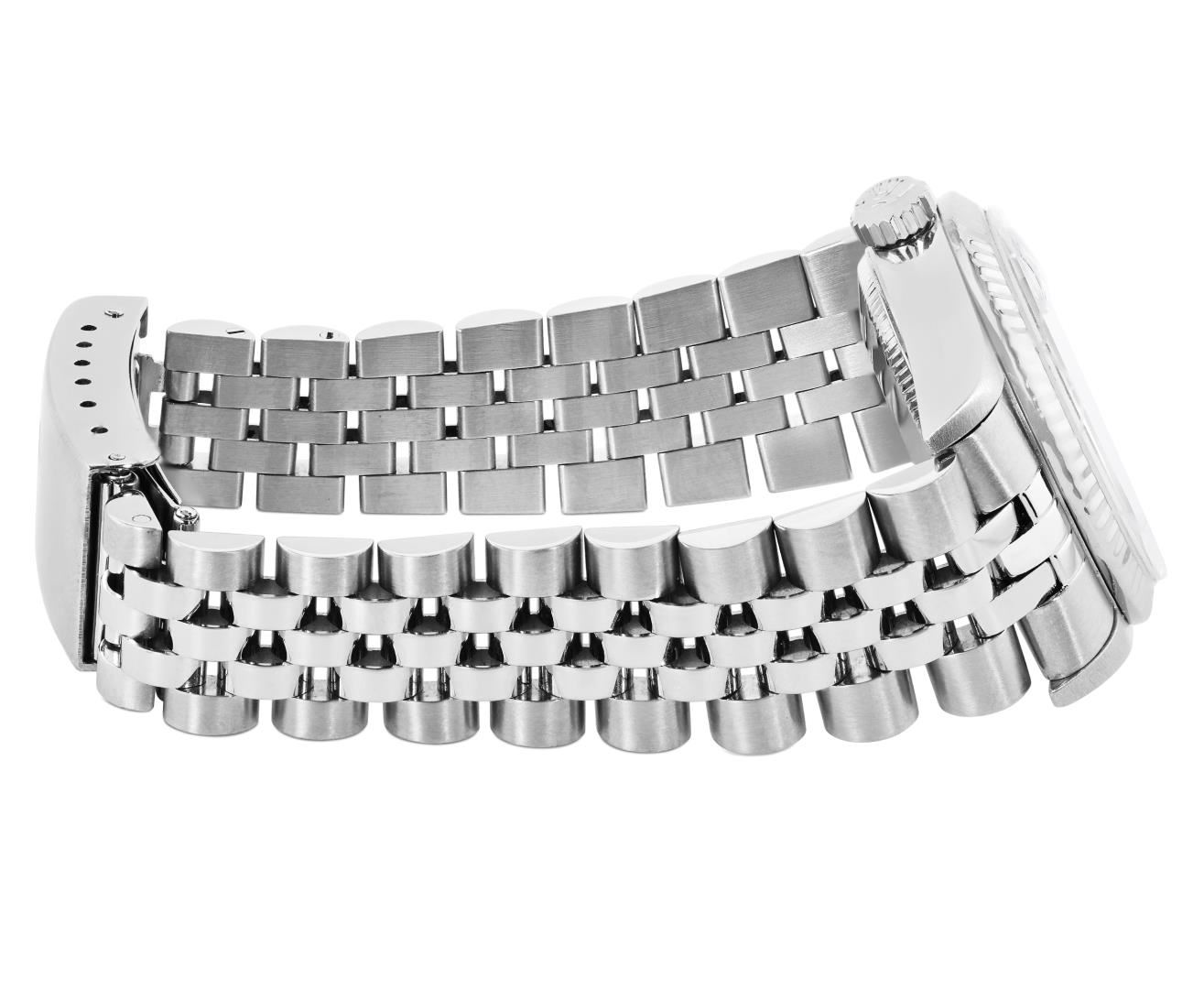 One Rolex Ladies Midsize Pre Owned Stainless Steel Datejust Wristwatch Polished with Satin Finish, Serviced And Electronically Tested, Stainless Steel Case: 31mm, Stainless Steel Crown, Bezel: 18K White Gold Fluted Bezel. Crystal: Sapphire With Magnifying Date Window. Hands: Solid Hands. Rolex Movement: Automatic Winding Movement 2235. Rolex Factory Dial: Cream Dial With Arabic Hour Markers. Date Window: 3 O'Clock Position Date Display, Model: Quickset Datejust. Condition: G-6 Extra Fine. Rolex Bracelet: Stainless Steel Jubilee Band. Bright Polish And Satin Finish. 6.0 Inch Length, Adjustable. Standard Clasp, With Rolex Logo. This Watch Has Been Serviced Time Tested And Is In Excellent Condition It Is Free Of All Scratches And Dents. This Watch Comes With A Rolex Box.