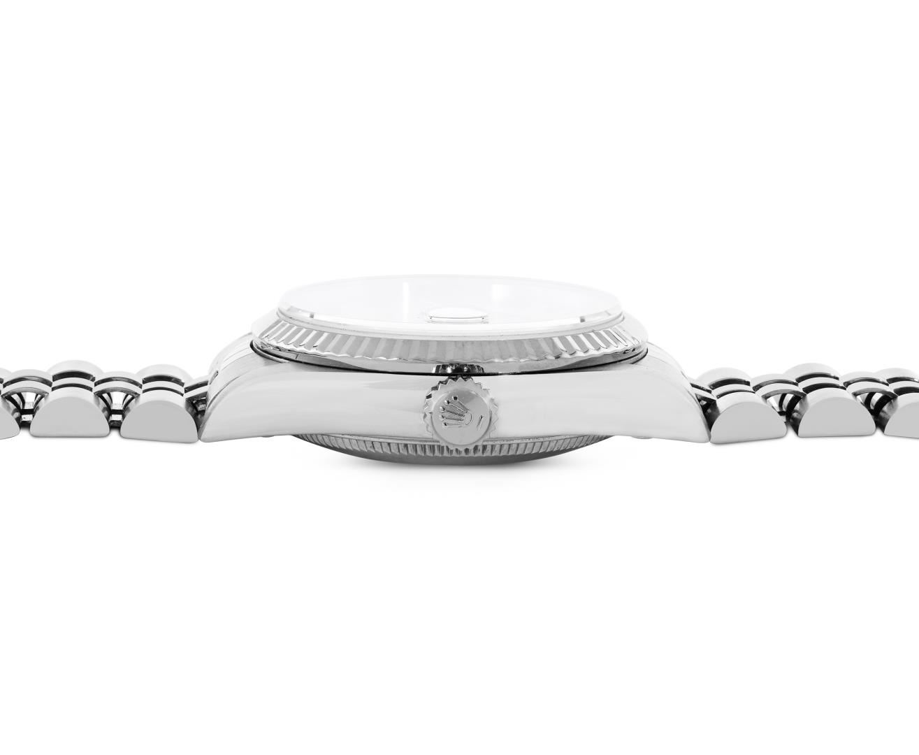 One Rolex Ladies Midsize Pre Owned Stainless Steel Datejust Wristwatch Polished with Satin Finish, Serviced And Electronically Tested, Stainless Steel Case: 31mm, Stainless Steel Crown, Bezel: 18K White Gold Fluted Bezel. Crystal: Sapphire With Magnifying Date Window. Hands: Solid Hands. Rolex Movement: Automatic Winding Movement 2235. Rolex Factory Dial: Cream Dial With Arabic Hour Markers. Date Window: 3 O'Clock Position Date Display, Model: Quickset Datejust. Condition: G-6 Extra Fine. Rolex Bracelet: Stainless Steel Jubilee Band. Bright Polish And Satin Finish. 6.0 Inch Length, Adjustable. Standard Clasp, With Rolex Logo. This Watch Has Been Serviced Time Tested And Is In Excellent Condition It Is Free Of All Scratches And Dents. This Watch Comes With A Rolex Box.