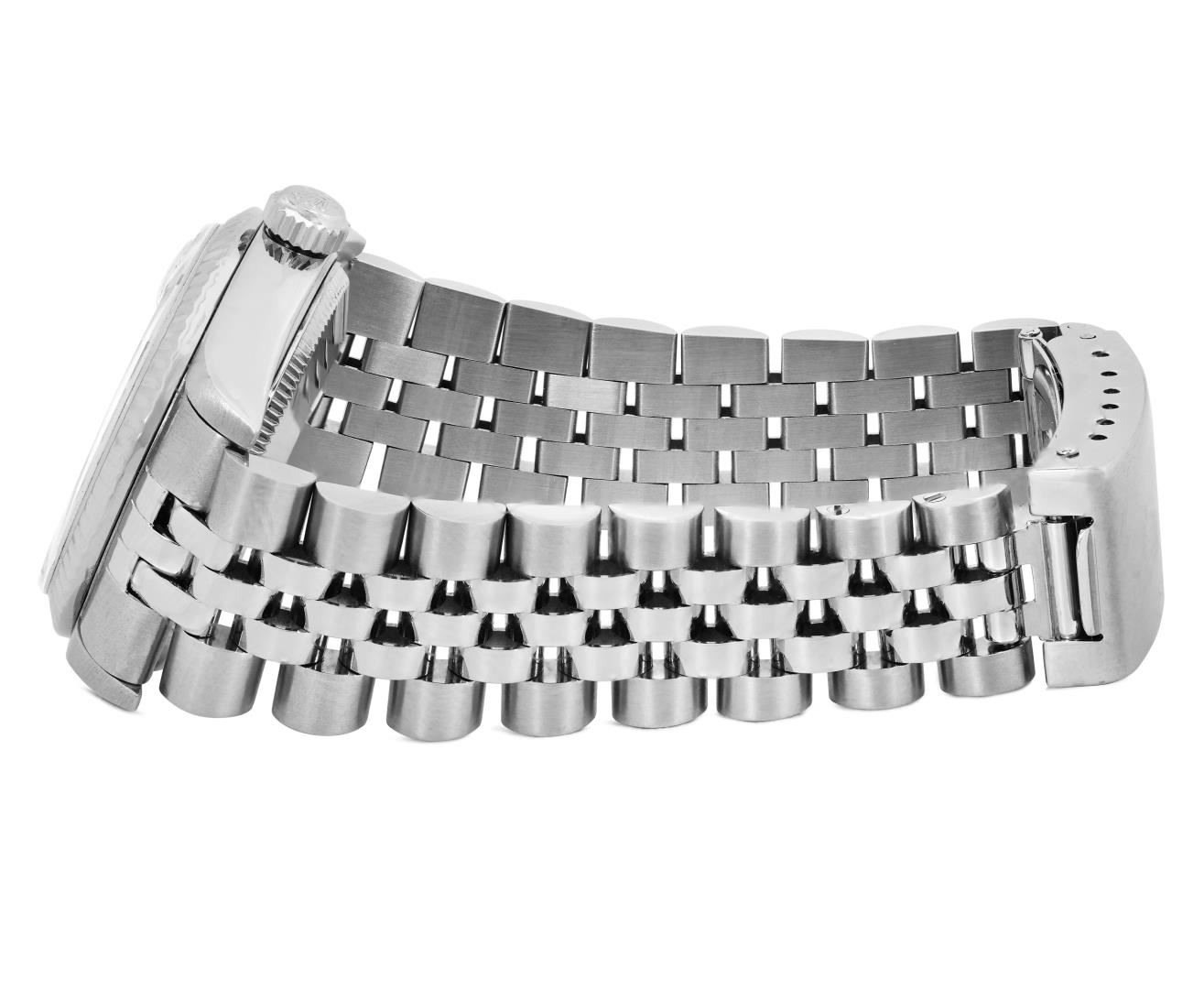 One Rolex Ladies Midsize Pre Owned Stainless Steel Datejust Wristwatch Polished with Satin Finish, Serviced And Electronically Tested, Stainless Steel Case: 31mm, Stainless Steel Crown, Bezel: 18K White Gold Fluted Bezel. Crystal: Sapphire With Magnifying Date Window. Hands: Solid Hands. Rolex Movement: Automatic Winding Movement 2235. Rolex Factory Dial: Salmon Dial With Arabic Hour Markers. Date Window: 3 O'Clock Position Date Display, Model: Quickset Datejust. Condition: G-6 Extra Fine. Rolex Bracelet: Stainless Steel Jubilee Band. Bright Polish And Satin Finish. 6.0 Inch Length, Adjustable. Standard Clasp, With Rolex Logo. This Watch Has Been Serviced Time Tested And Is In Excellent Condition It Is Free Of All Scratches And Dents. This Watch Comes With A Rolex Box.