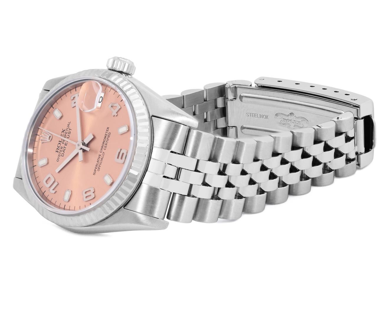One Rolex Ladies Midsize Pre Owned Stainless Steel Datejust Wristwatch Polished with Satin Finish, Serviced And Electronically Tested, Stainless Steel Case: 31mm, Stainless Steel Crown, Bezel: 18K White Gold Fluted Bezel. Crystal: Sapphire With Magnifying Date Window. Hands: Solid Hands. Rolex Movement: Automatic Winding Movement 2235. Rolex Factory Dial: Salmon Dial With Arabic Hour Markers. Date Window: 3 O'Clock Position Date Display, Model: Quickset Datejust. Condition: G-6 Extra Fine. Rolex Bracelet: Stainless Steel Jubilee Band. Bright Polish And Satin Finish. 6.0 Inch Length, Adjustable. Standard Clasp, With Rolex Logo. This Watch Has Been Serviced Time Tested And Is In Excellent Condition It Is Free Of All Scratches And Dents. This Watch Comes With A Rolex Box.