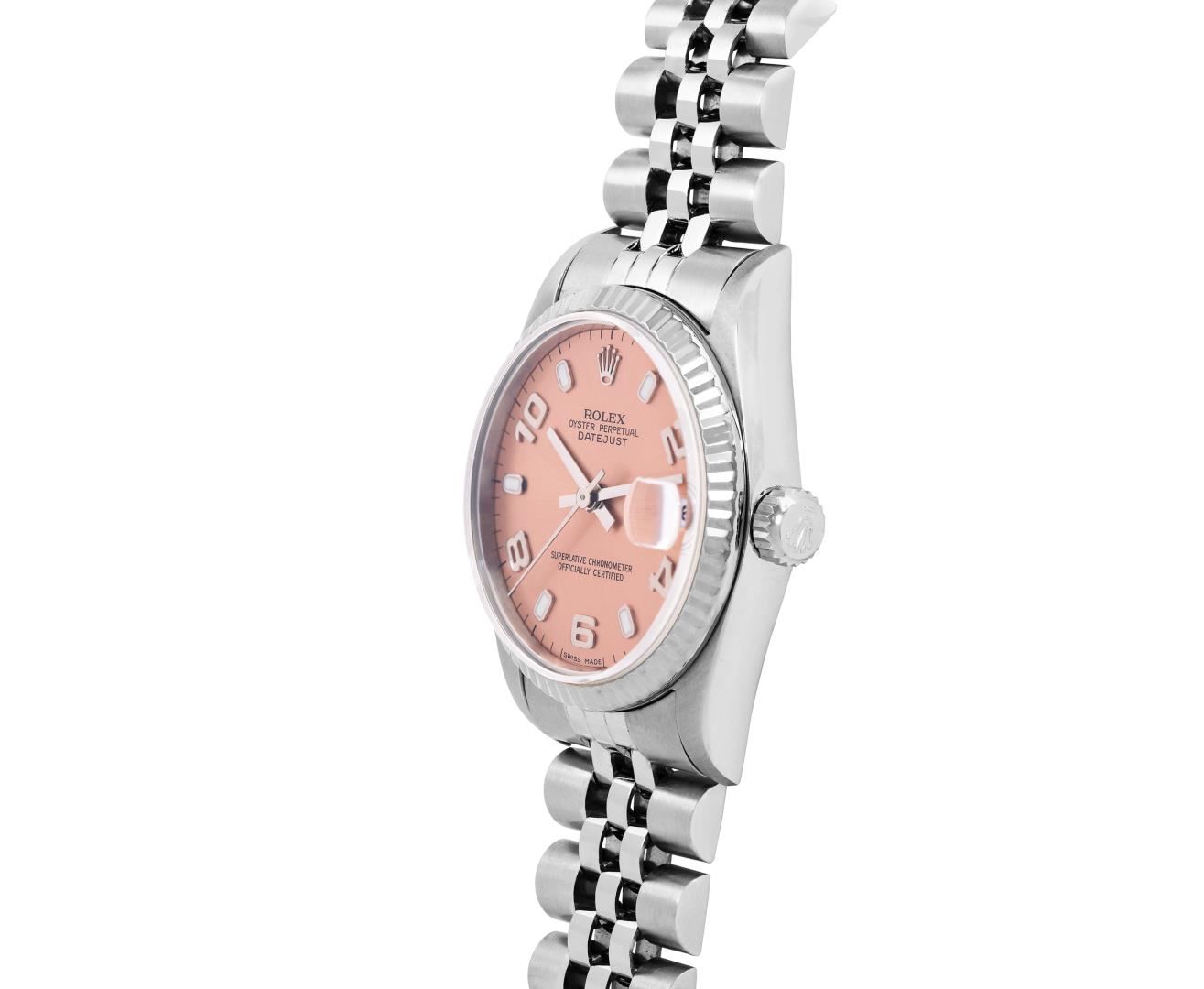 One Rolex Ladies Midsize Pre Owned Stainless Steel Datejust Wristwatch Polished with Satin Finish, Serviced And Electronically Tested, Stainless Steel Case: 31mm, Stainless Steel Crown, Bezel: 18K White Gold Fluted Bezel. Crystal: Sapphire With Magnifying Date Window. Hands: Solid Hands. Rolex Movement: Automatic Winding Movement 2235. Rolex Factory Dial: Salmon Dial With Arabic Hour Markers. Date Window: 3 O'Clock Position Date Display, Model: Quickset Datejust. Condition: G-6 Extra Fine. Rolex Bracelet: Stainless Steel Jubilee Band. Bright Polish And Satin Finish. 6.0 Inch Length, Adjustable. Standard Clasp, With Rolex Logo. This Watch Has Been Serviced Time Tested And Is In Excellent Condition It Is Free Of All Scratches And Dents. This Watch Comes With A Rolex Box.