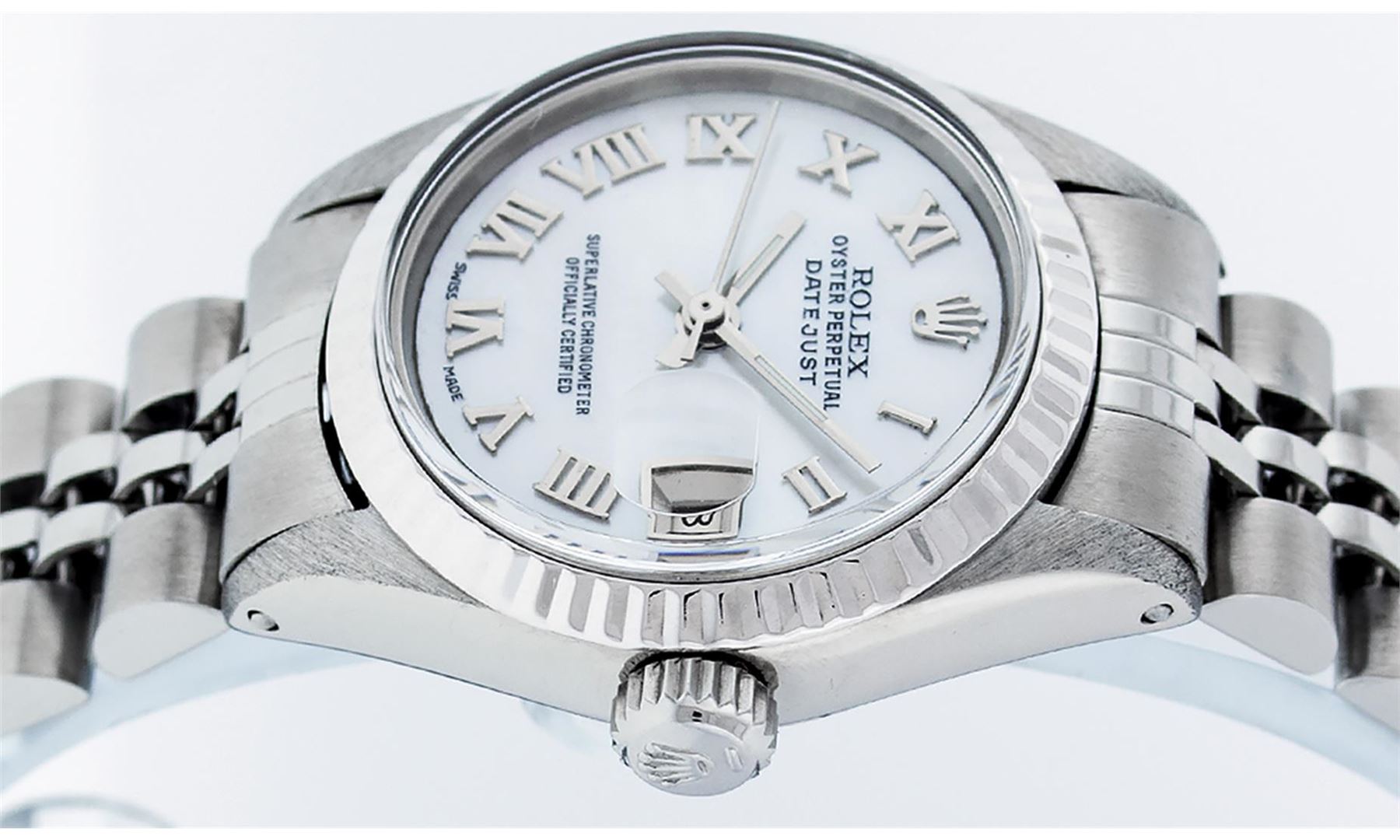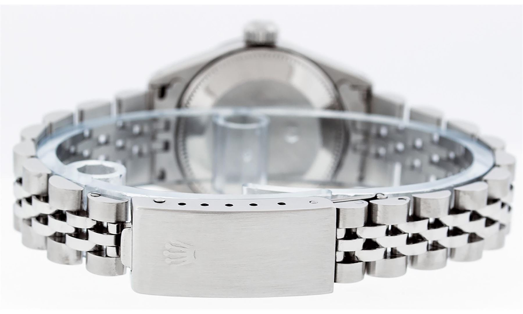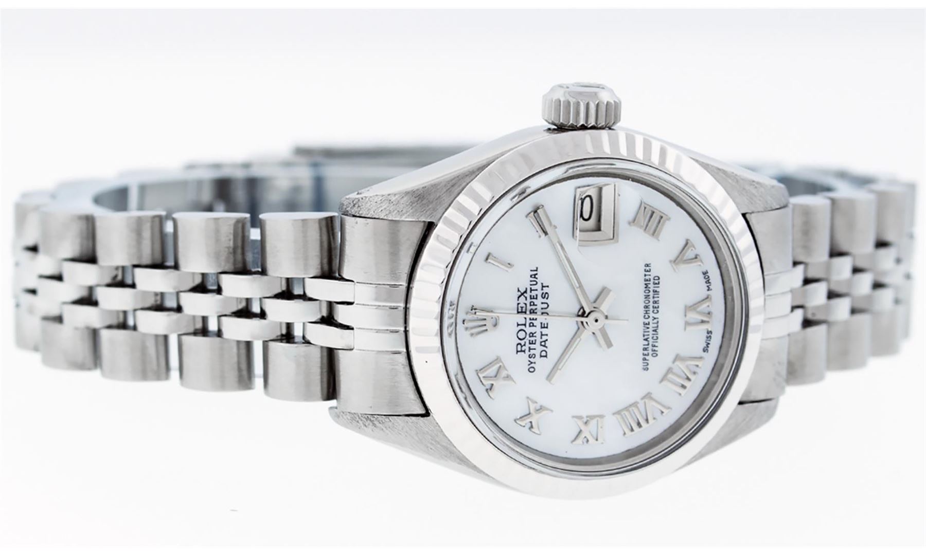 One Ladies Stainless Steel Rolex Datejust Polished Bright with Satin Finish, Serviced & Electronically Tested, Stainless Steel Case: 26mm, Stainless Steel Crown, Bezel: 14K White Gold Bezel. Custom Crystal: New Acrylic Cyclops Lens. Custom Hands: New Luminescent Hands. Movement: Automatic Winding Movement Caliber 2030. Custom Dial: Refinished Mother Of Pearl Roman Dial. Date Window: 3 O'Clock Position Date Display, Model: Datejust. Condition: G-6 Extra Fine. Bracelet: Stainless Steel Jubilee Band. Bright Polish & Satin Finish. 6.0 Inch Length, Adjustable. Standard Clasp, With Rolex Logo. This Watch Has Been Serviced Time Tested And Is In Excellent Condition It Is Free Of All Scratches And Dents.