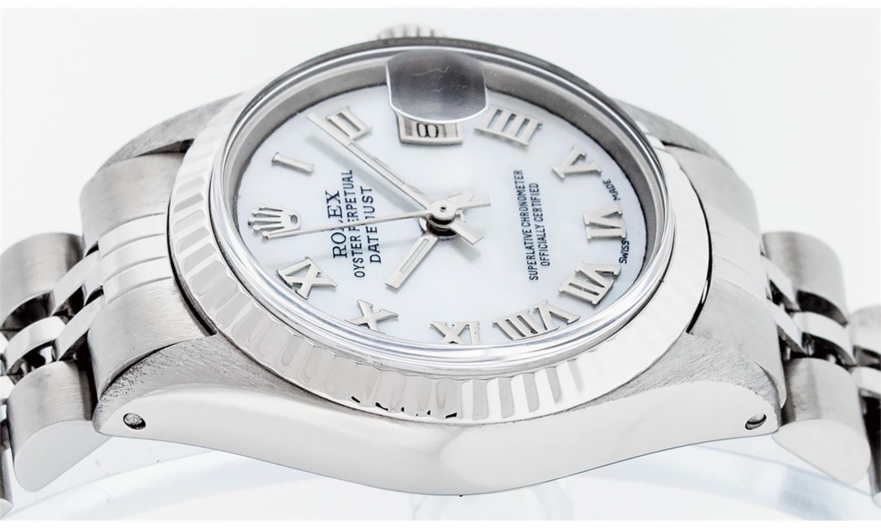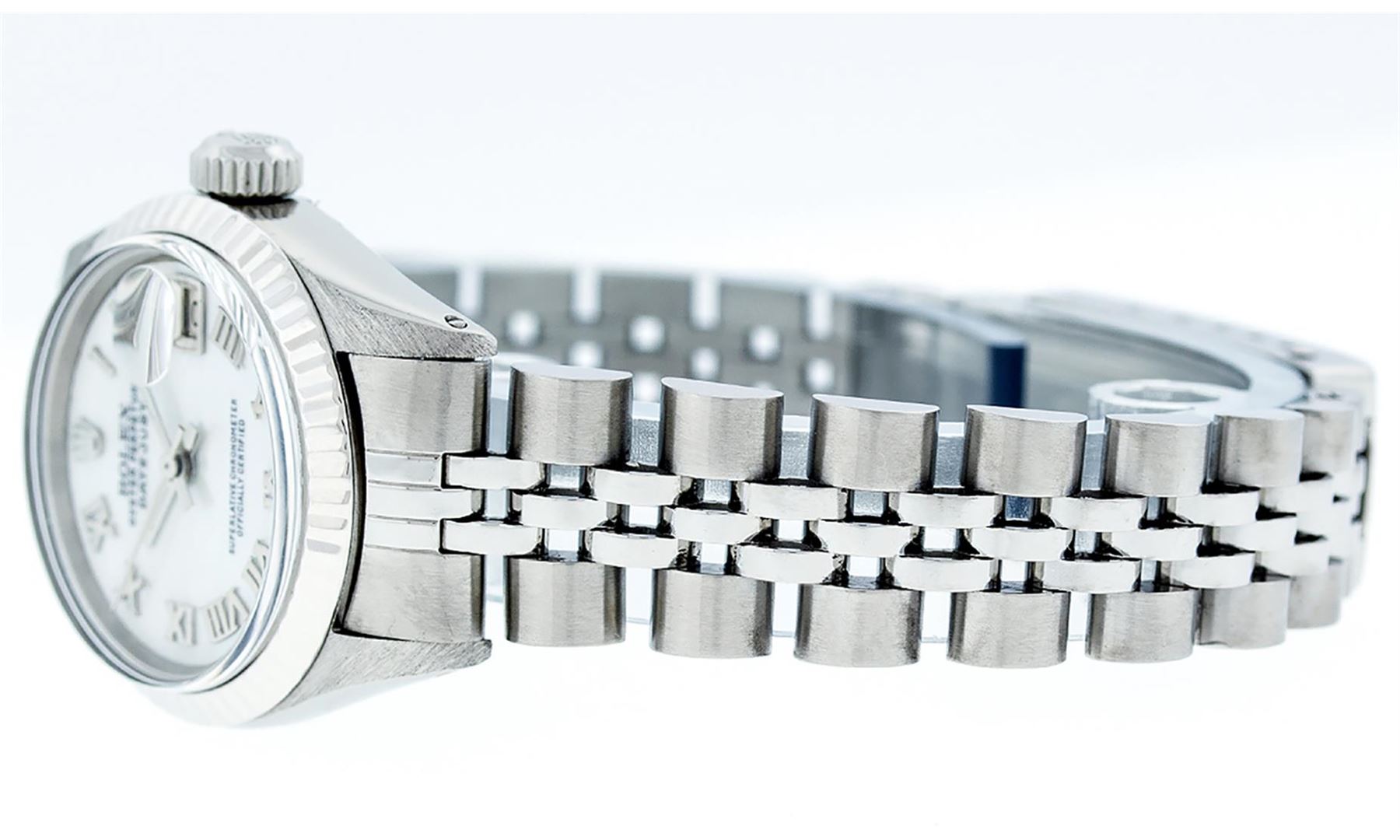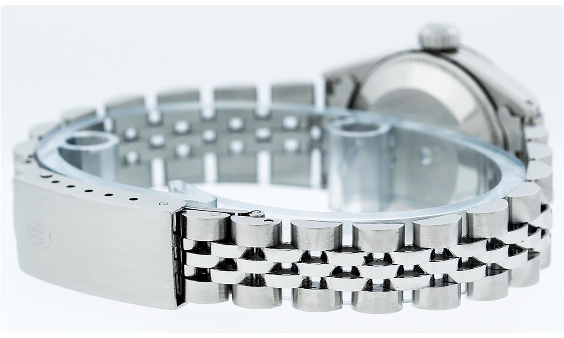 One Ladies Stainless Steel Rolex Datejust Polished Bright with Satin Finish, Serviced & Electronically Tested, Stainless Steel Case: 26mm, Stainless Steel Crown, Bezel: 14K White Gold Bezel. Custom Crystal: New Acrylic Cyclops Lens. Custom Hands: New Luminescent Hands. Movement: Automatic Winding Movement Caliber 2030. Custom Dial: Refinished Mother Of Pearl Roman Dial. Date Window: 3 O'Clock Position Date Display, Model: Datejust. Condition: G-6 Extra Fine. Bracelet: Stainless Steel Jubilee Band. Bright Polish & Satin Finish. 6.0 Inch Length, Adjustable. Standard Clasp, With Rolex Logo. This Watch Has Been Serviced Time Tested And Is In Excellent Condition It Is Free Of All Scratches And Dents.