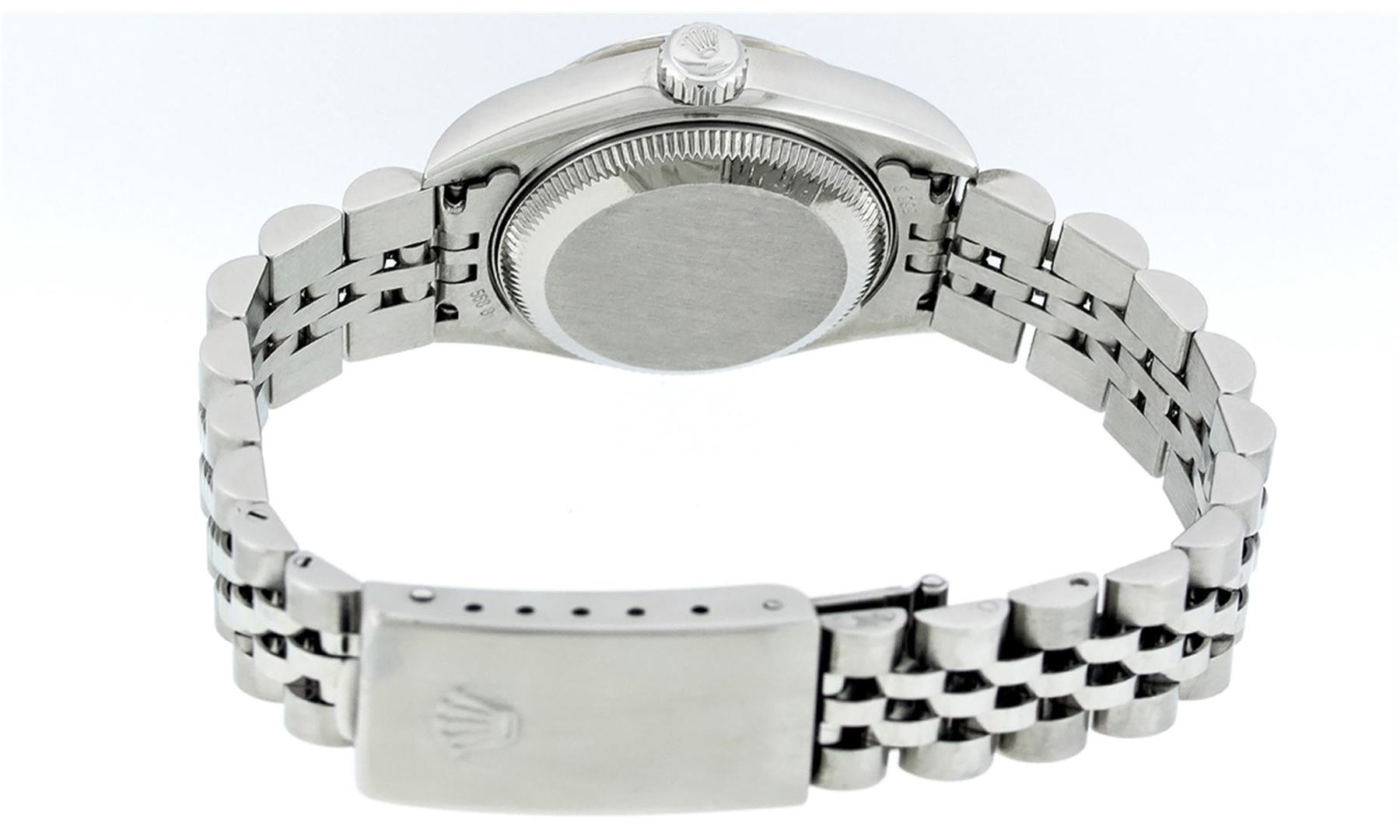 One Ladies Quickset Stainless Steel Rolex Datejust Polished Bright with Satin Finish, Serviced & Electronically Tested, Stainless Steel Case: 26mm, Stainless Steel Crown, Bezel: 18K White Gold Fluted Bezel. Custom Crystal: New Scratch Resistant Sapphire Cyclops Lens. Custom Hands: New Luminescent Hands. Movement: Automatic Winding Movement Caliber 2235. Custom Dial: Mother Of Pearl Diamond Dial, Diamond Count: 10 Single Cut Diamonds In Dial, Color: G to H, Clarity: VS2 Date Window: 3 O'Clock Position Date Display, Model: 79174 Quickset Datejust. Condition: G-6 Extra Fine. Bracelet: Stainless Steel Jubilee Band. Bright Polish & Satin Finish. 6.0 Inch Length, Adjustable. Standard Clasp, With Rolex Logo. This Watch Has Been Serviced Time Tested And Is In Excellent Condition It Is Free Of All Scratches And Dents.