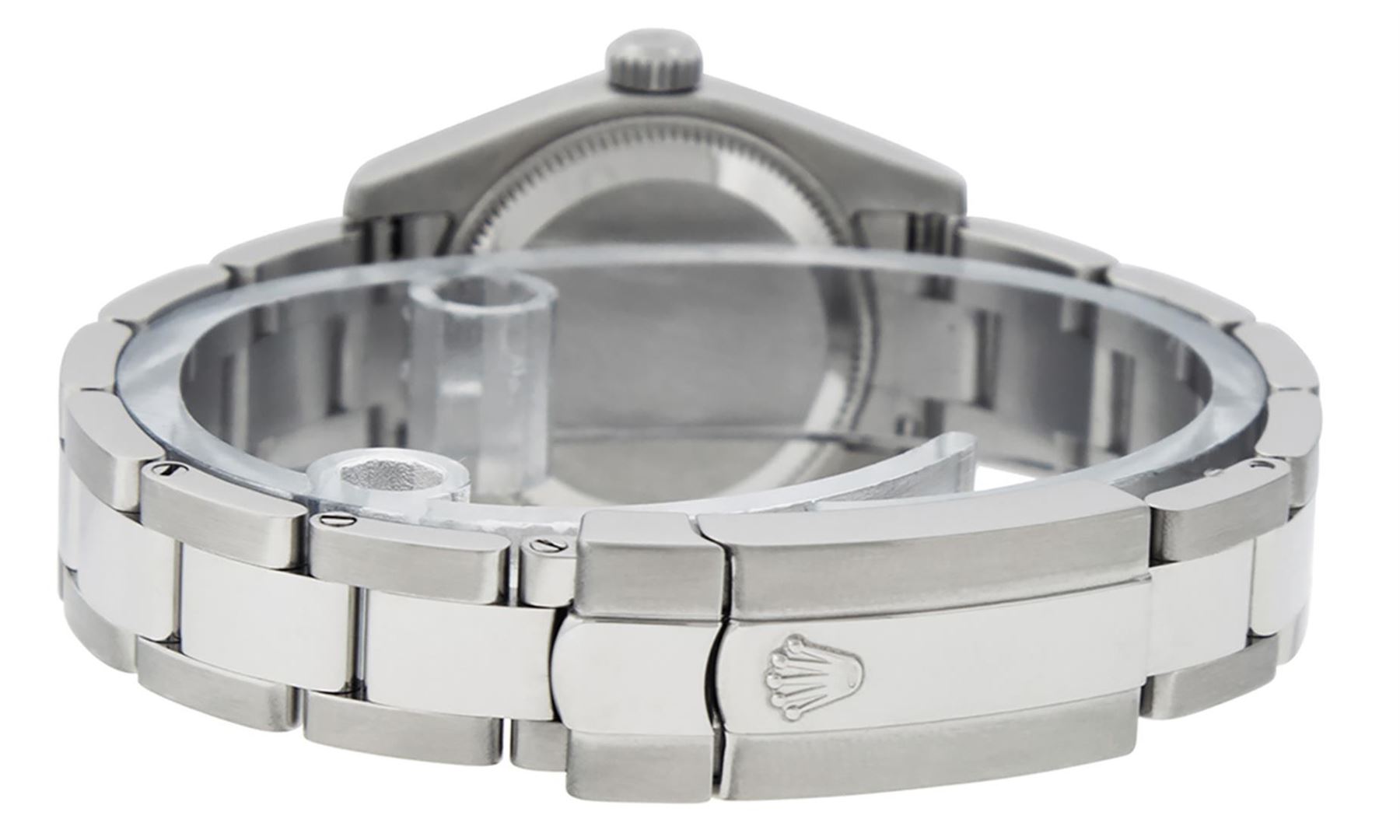 One Ladies Quickset Stainless Steel Rolex Datejust Polished Bright with Satin Finish, Serviced & Electronically Tested, Stainless Steel Case: 26mm, Stainless Steel Crown, Bezel: Stainless Steel Smooth Bezel. Custom Crystal: New Scratch Resistant Sapphire Cyclops Lens. Custom Hands: New Luminescent Hands. Movement: Automatic Winding Movement Caliber 2235. Custom Dial: Mother Of Pearl Single Cut VS Diamond Dial, Diamond Count: 10 Single Cut Diamonds In Dial, Color: G to H, Clarity: VS. Date Window: 3 O'Clock Position Date Display, Model: 179160 Quickset Datejust. Condition: G-6 Extra Fine. Bracelet: Stainless Steel Oyster Band. Bright Polish & Satin Finish. 6.0 Inch Length, Adjustable. Standard Clasp, With Rolex Logo. This Watch Has Been Serviced Time Tested And Is In Excellent Condition It Is Free Of All Scratches And Dents. This Watch Comes With A Rolex Box.