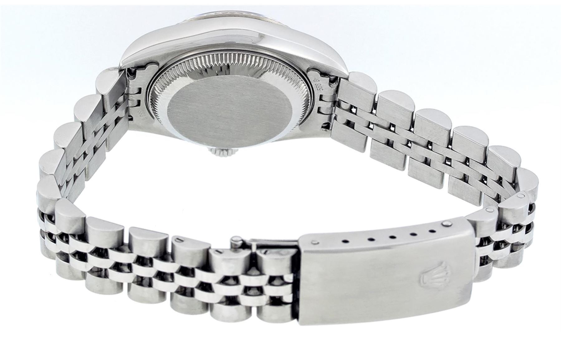 One Ladies Quickset Stainless Steel Rolex Datejust Polished Bright with Satin Finish, Serviced & Electronically Tested, Stainless Steel Case: 26mm, Stainless Steel Crown, Bezel: 18K White Gold Fluted Bezel. Custom Crystal: New Scratch Resistant Sapphire Cyclops Lens. Custom Hands: New Luminescent Hands. Movement: Automatic Winding Movement Caliber 2235. Custom Dial: Mother Of Pearl Diamond Dial, Diamond Count: 10 Single Cut Diamonds In Dial, Color: G to H, Clarity: VS2 Date Window: 3 O'Clock Position Date Display, Model: 79174 Quickset Datejust. Condition: G-6 Extra Fine. Bracelet: Stainless Steel Jubilee Band. Bright Polish & Satin Finish. 6.0 Inch Length, Adjustable. Standard Clasp, With Rolex Logo. This Watch Has Been Serviced Time Tested And Is In Excellent Condition It Is Free Of All Scratches And Dents.