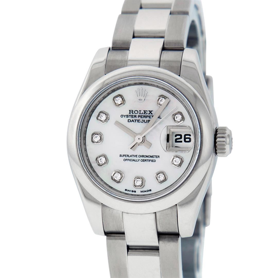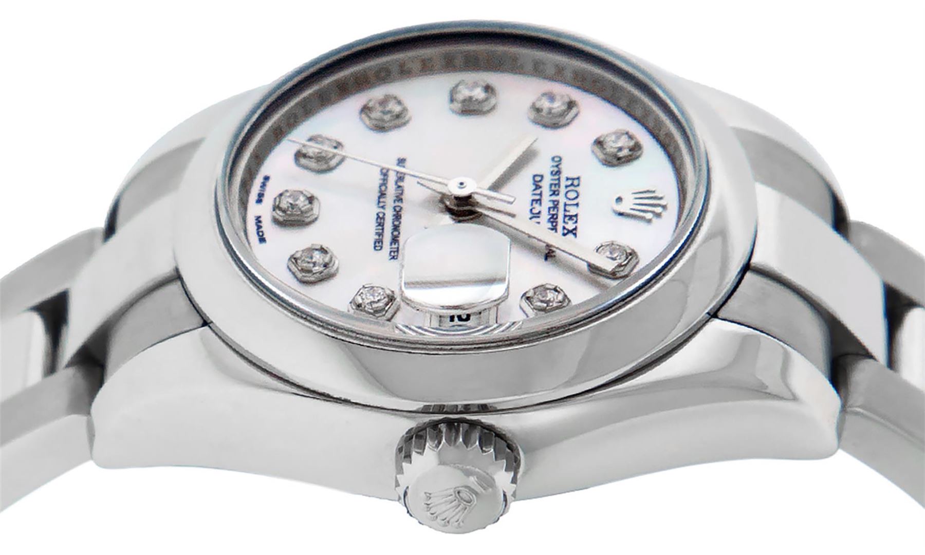 One Ladies Quickset Stainless Steel Rolex Datejust Polished Bright with Satin Finish, Serviced & Electronically Tested, Stainless Steel Case: 26mm, Stainless Steel Crown, Bezel: Stainless Steel Smooth Bezel. Custom Crystal: New Scratch Resistant Sapphire Cyclops Lens. Custom Hands: New Luminescent Hands. Movement: Automatic Winding Movement Caliber 2235. Custom Dial: Mother Of Pearl Single Cut VS Diamond Dial, Diamond Count: 10 Single Cut Diamonds In Dial, Color: G to H, Clarity: VS. Date Window: 3 O'Clock Position Date Display, Model: 179160 Quickset Datejust. Condition: G-6 Extra Fine. Bracelet: Stainless Steel Oyster Band. Bright Polish & Satin Finish. 6.0 Inch Length, Adjustable. Standard Clasp, With Rolex Logo. This Watch Has Been Serviced Time Tested And Is In Excellent Condition It Is Free Of All Scratches And Dents. This Watch Comes With A Rolex Box.