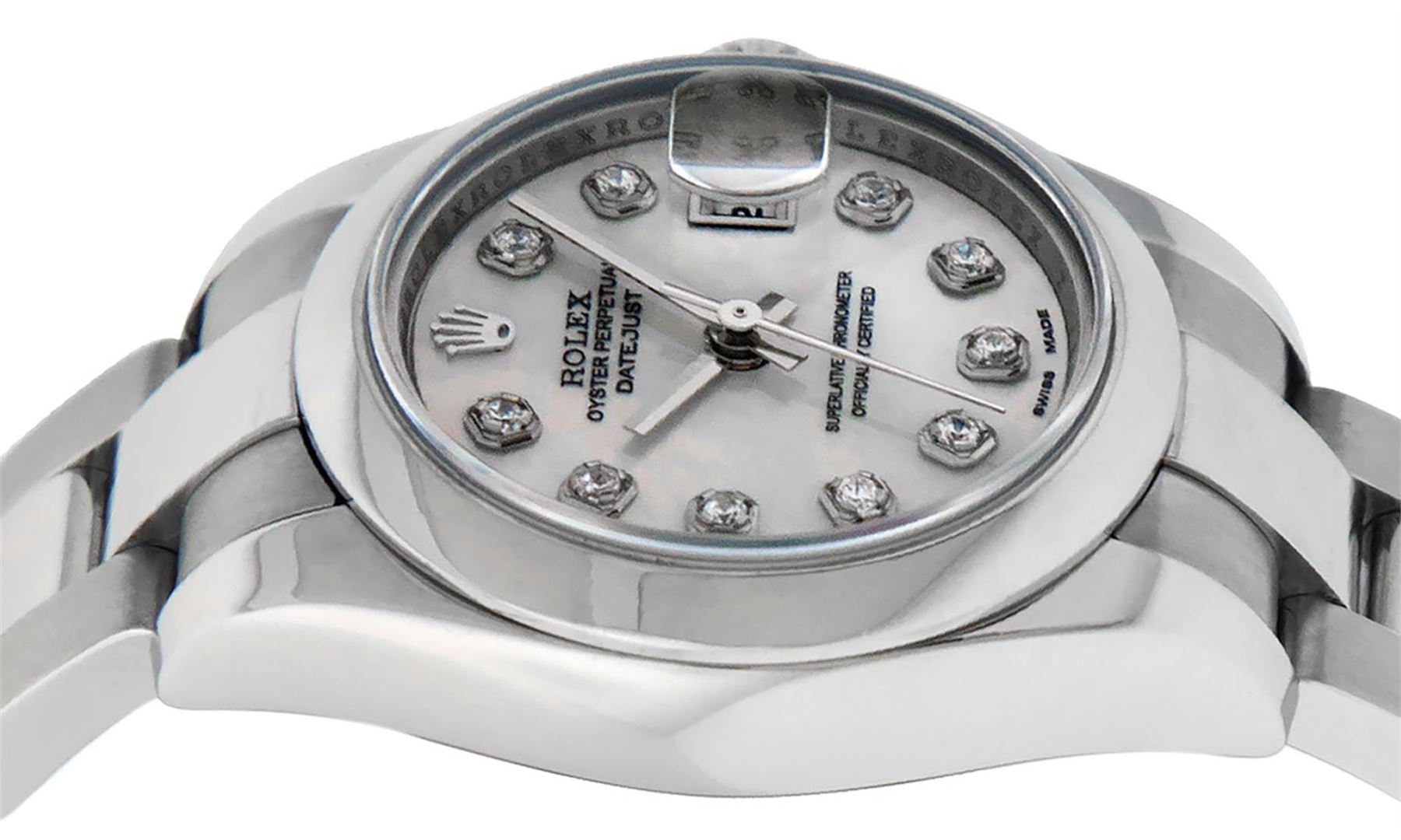 One Ladies Quickset Stainless Steel Rolex Datejust Polished Bright with Satin Finish, Serviced & Electronically Tested, Stainless Steel Case: 26mm, Stainless Steel Crown, Bezel: Stainless Steel Smooth Bezel. Custom Crystal: New Scratch Resistant Sapphire Cyclops Lens. Custom Hands: New Luminescent Hands. Movement: Automatic Winding Movement Caliber 2235. Custom Dial: Mother Of Pearl Single Cut VS Diamond Dial, Diamond Count: 10 Single Cut Diamonds In Dial, Color: G to H, Clarity: VS. Date Window: 3 O'Clock Position Date Display, Model: 179160 Quickset Datejust. Condition: G-6 Extra Fine. Bracelet: Stainless Steel Oyster Band. Bright Polish & Satin Finish. 6.0 Inch Length, Adjustable. Standard Clasp, With Rolex Logo. This Watch Has Been Serviced Time Tested And Is In Excellent Condition It Is Free Of All Scratches And Dents. This Watch Comes With A Rolex Box.