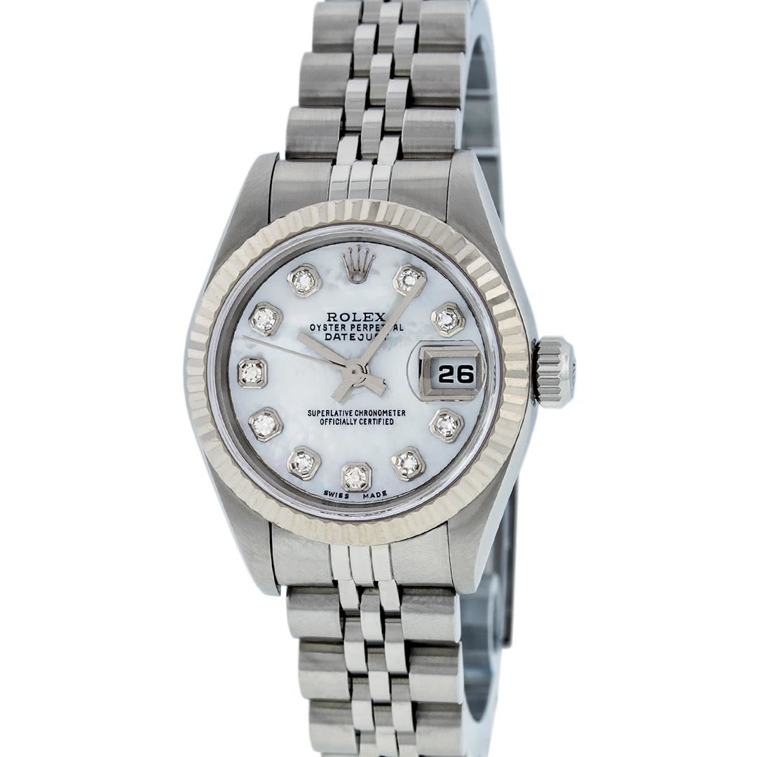 One Ladies Quickset Stainless Steel Rolex Datejust Polished Bright with Satin Finish, Serviced & Electronically Tested, Stainless Steel Case: 26mm, Stainless Steel Crown, Bezel: 18K White Gold Fluted Bezel. Custom Crystal: New Scratch Resistant Sapphire Cyclops Lens. Custom Hands: New Luminescent Hands. Movement: Automatic Winding Movement Caliber 2235. Custom Dial: Mother Of Pearl Diamond Dial, Diamond Count: 10 Single Cut Diamonds In Dial, Color: G to H, Clarity: VS2 Date Window: 3 O'Clock Position Date Display, Model: 79174 Quickset Datejust. Condition: G-6 Extra Fine. Bracelet: Stainless Steel Jubilee Band. Bright Polish & Satin Finish. 6.0 Inch Length, Adjustable. Standard Clasp, With Rolex Logo. This Watch Has Been Serviced Time Tested And Is In Excellent Condition It Is Free Of All Scratches And Dents.