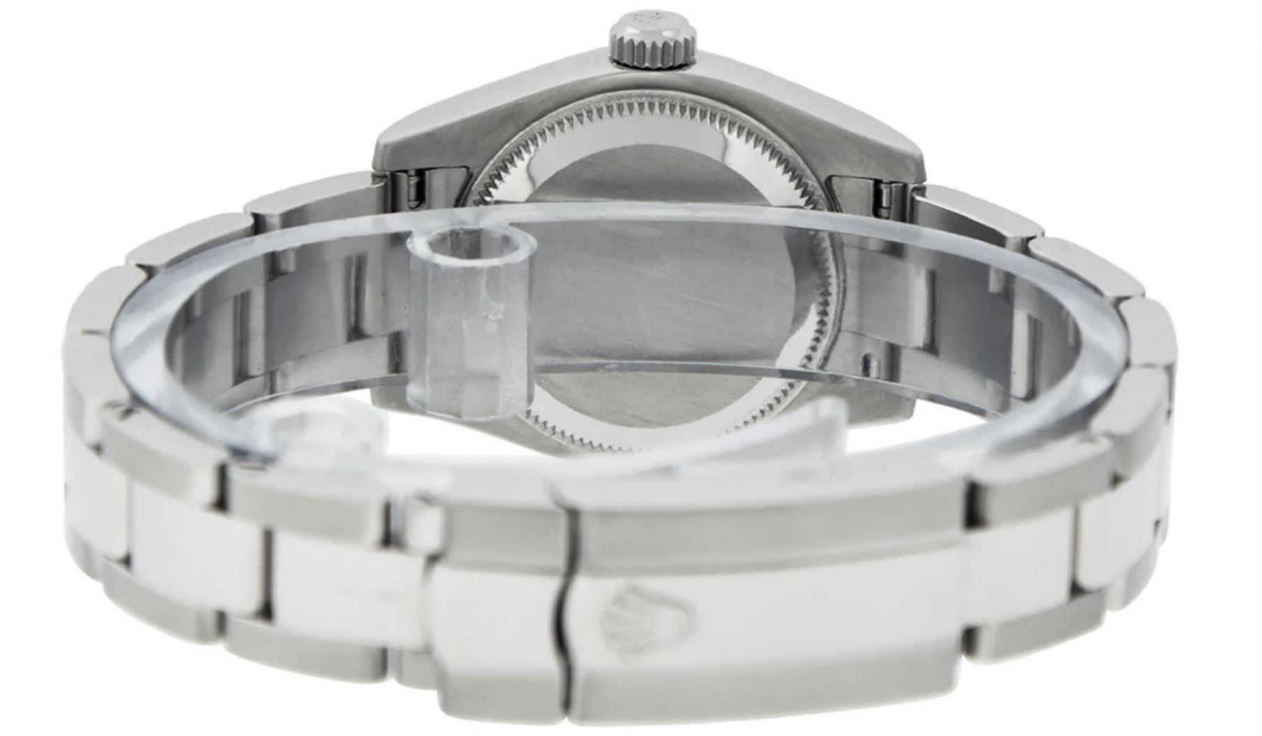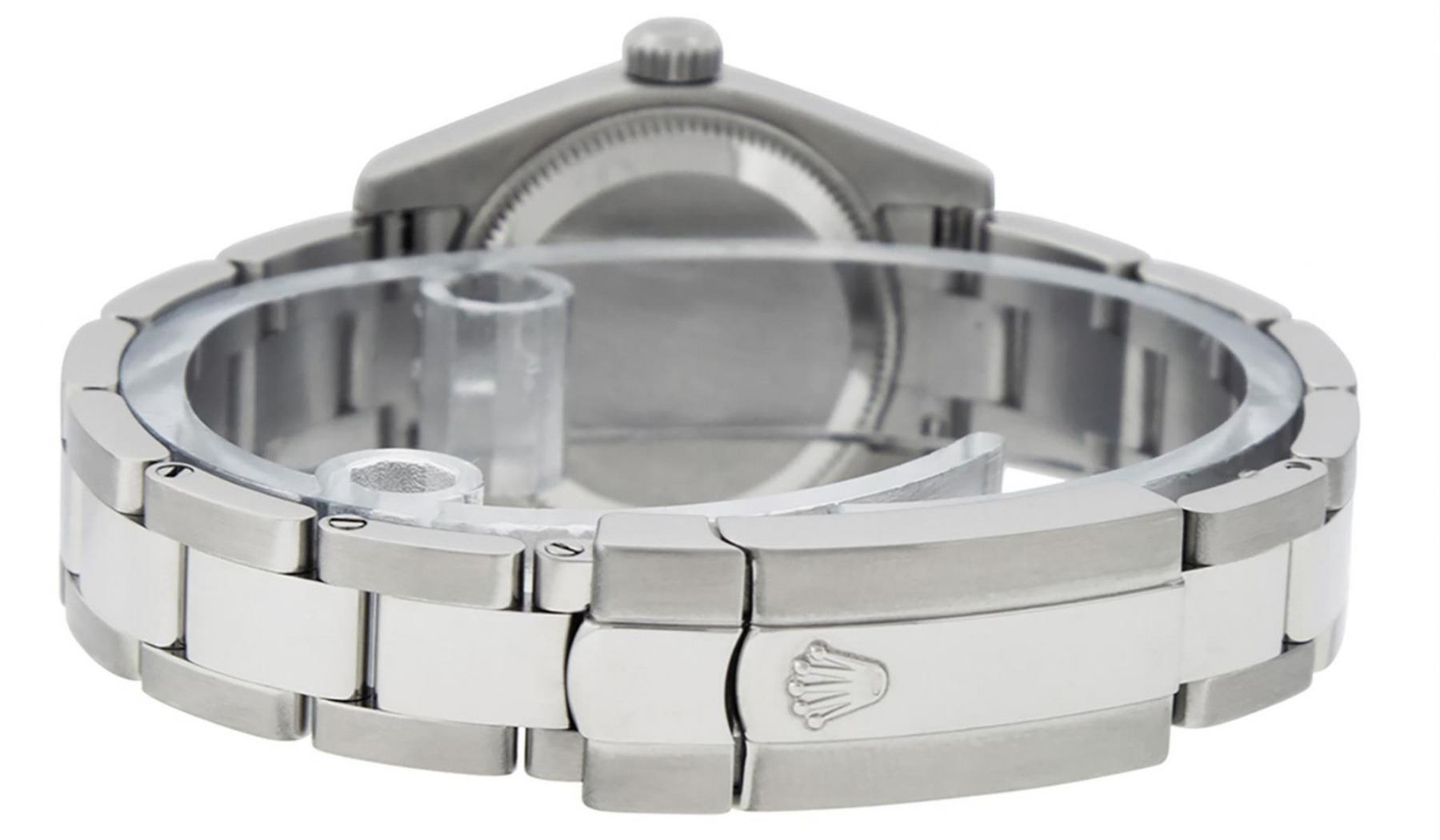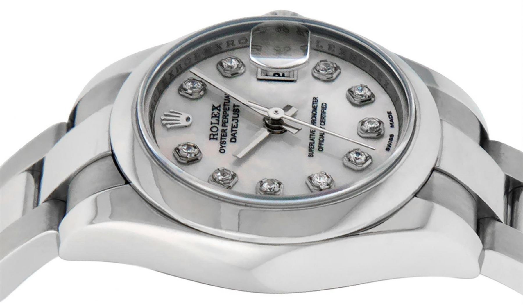 One Ladies Quickset Stainless Steel Rolex Datejust Polished Bright with Satin Finish, Serviced & Electronically Tested, Stainless Steel Case: 26mm, Stainless Steel Crown, Bezel: Stainless Steel Smooth Bezel. Custom Crystal: New Scratch Resistant Sapphire Cyclops Lens. Custom Hands: New Luminescent Hands. Movement: Automatic Winding Movement Caliber 2235. Custom Dial: Mother Of Pearl Single Cut VS Diamond Dial, Diamond Count: 10 Single Cut Diamonds In Dial, Color: G to H, Clarity: VS. Date Window: 3 O'Clock Position Date Display, Model: 179160 Quickset Datejust. Condition: G-6 Extra Fine. Bracelet: Stainless Steel Oyster Band. Bright Polish & Satin Finish. 6.0 Inch Length, Adjustable. Standard Clasp, With Rolex Logo. This Watch Has Been Serviced Time Tested And Is In Excellent Condition It Is Free Of All Scratches And Dents. This Watch Comes With A Rolex Box.