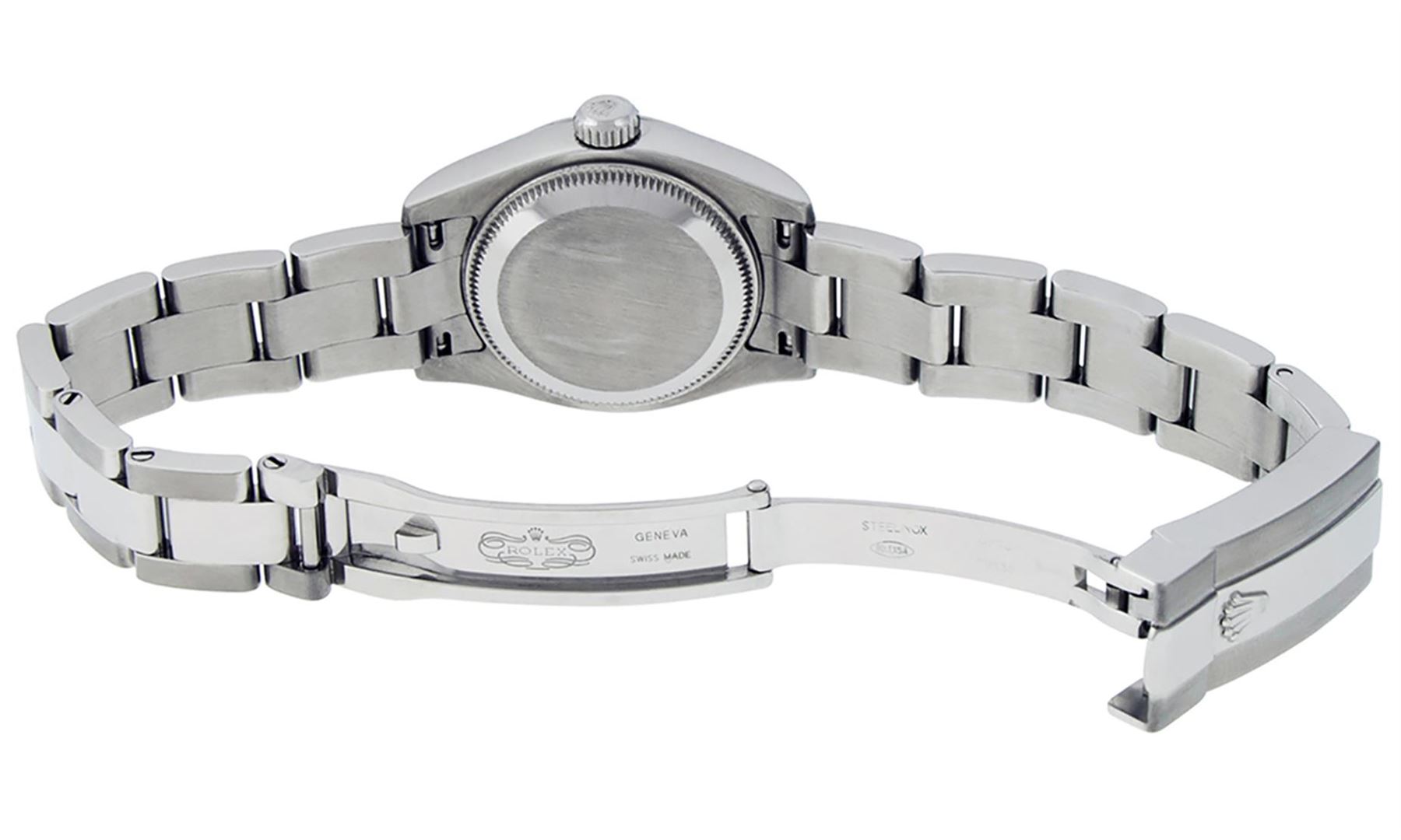 One Ladies Quickset Stainless Steel Rolex Datejust Polished Bright with Satin Finish, Serviced & Electronically Tested, Stainless Steel Case: 26mm, Stainless Steel Crown, Bezel: Stainless Steel Smooth Bezel. Custom Crystal: New Scratch Resistant Sapphire Cyclops Lens. Custom Hands: New Luminescent Hands. Movement: Automatic Winding Movement Caliber 2235. Custom Dial: Mother Of Pearl Single Cut VS Diamond Dial, Diamond Count: 10 Single Cut Diamonds In Dial, Color: G to H, Clarity: VS. Date Window: 3 O'Clock Position Date Display, Model: 179160 Quickset Datejust. Condition: G-6 Extra Fine. Bracelet: Stainless Steel Oyster Band. Bright Polish & Satin Finish. 6.0 Inch Length, Adjustable. Standard Clasp, With Rolex Logo. This Watch Has Been Serviced Time Tested And Is In Excellent Condition It Is Free Of All Scratches And Dents. This Watch Comes With A Rolex Box.