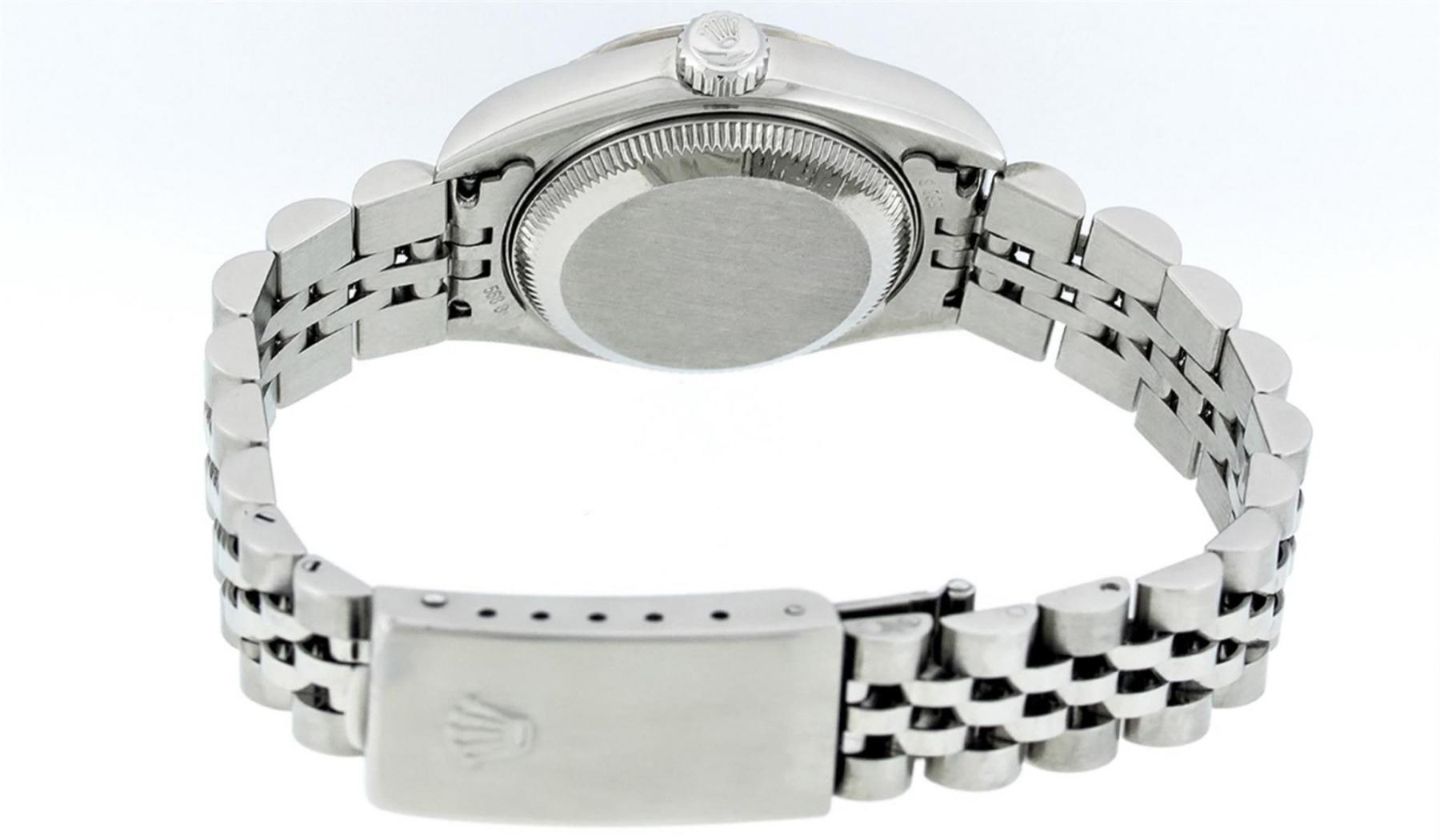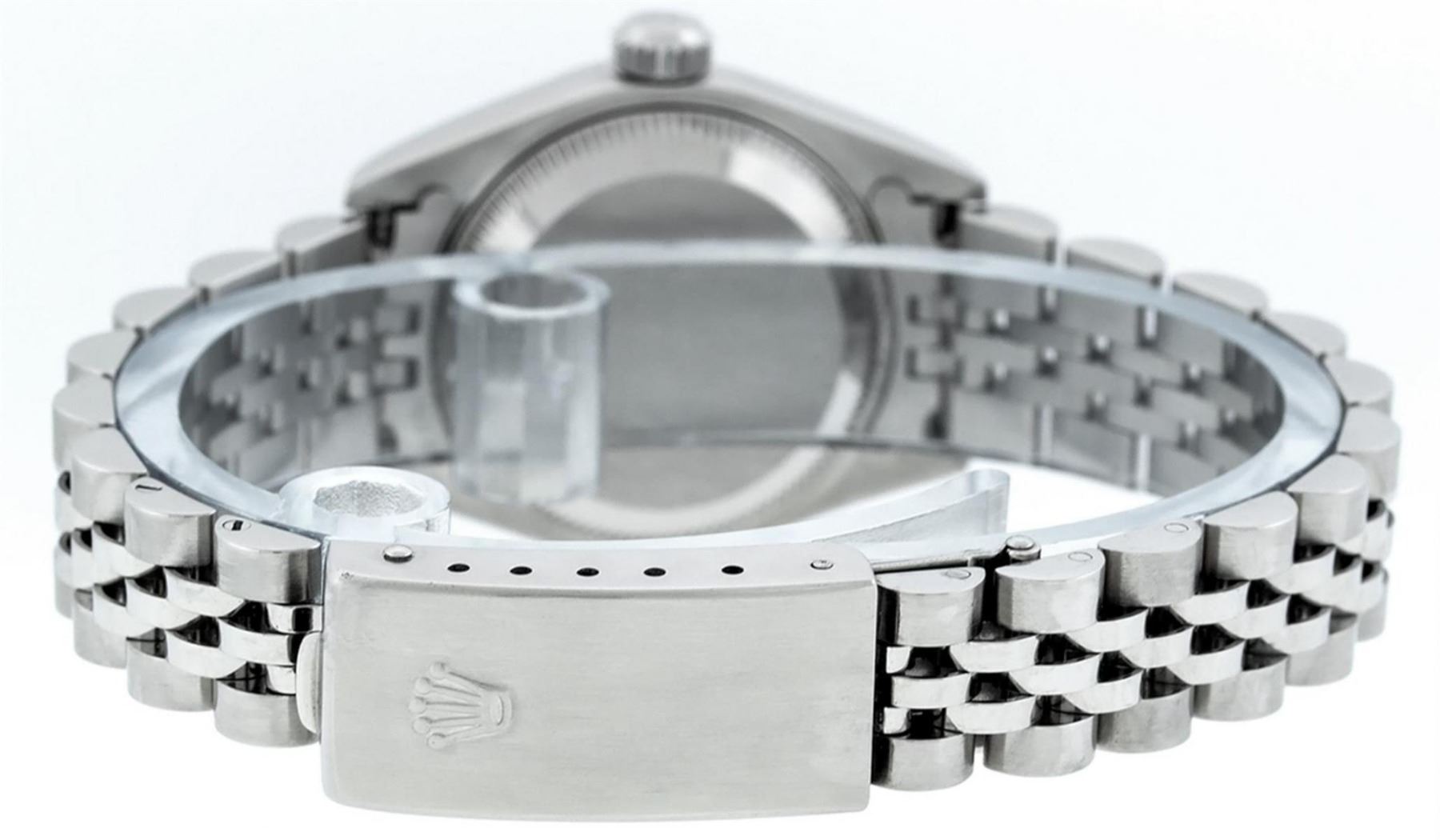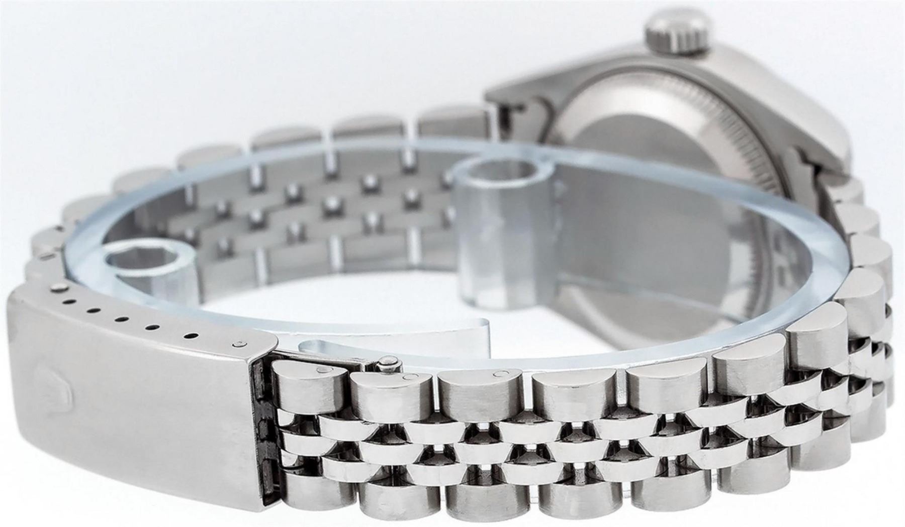 One Ladies Quickset Stainless Steel Rolex Datejust Polished Bright with Satin Finish, Serviced & Electronically Tested, Stainless Steel Case: 26mm, Stainless Steel Crown, Bezel: 18K White Gold Fluted Bezel. Custom Crystal: New Scratch Resistant Sapphire Cyclops Lens. Custom Hands: New Luminescent Hands. Movement: Automatic Winding Movement Caliber 2235. Custom Dial: Mother Of Pearl Diamond Dial, Diamond Count: 10 Single Cut Diamonds In Dial, Color: G to H, Clarity: VS2 Date Window: 3 O'Clock Position Date Display, Model: 79174 Quickset Datejust. Condition: G-6 Extra Fine. Bracelet: Stainless Steel Jubilee Band. Bright Polish & Satin Finish. 6.0 Inch Length, Adjustable. Standard Clasp, With Rolex Logo. This Watch Has Been Serviced Time Tested And Is In Excellent Condition It Is Free Of All Scratches And Dents.