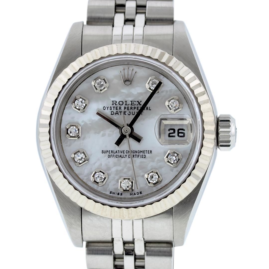 One Ladies Quickset Stainless Steel Rolex Datejust Polished Bright with Satin Finish, Serviced & Electronically Tested, Stainless Steel Case: 26mm, Stainless Steel Crown, Bezel: 18K White Gold Fluted Bezel. Custom Crystal: New Scratch Resistant Sapphire Cyclops Lens. Custom Hands: New Luminescent Hands. Movement: Automatic Winding Movement . Custom Dial: Mother Of Pearl Diamond Dial, Diamond Count: 10 Single Cut Diamonds In Dial, Color: G to H, Clarity: VS2 Date Window: 3 O'Clock Position Date Display, Model: Quickset Datejust. Condition: G-6 Extra Fine. Bracelet: Stainless Steel Jubilee Band. Bright Polish & Satin Finish. 6.0 Inch Length, Adjustable. Standard Clasp, With Rolex Logo. This Watch Has Been Serviced Time Tested And Is In Excellent Condition It Is Free Of All Scratches And Dents.