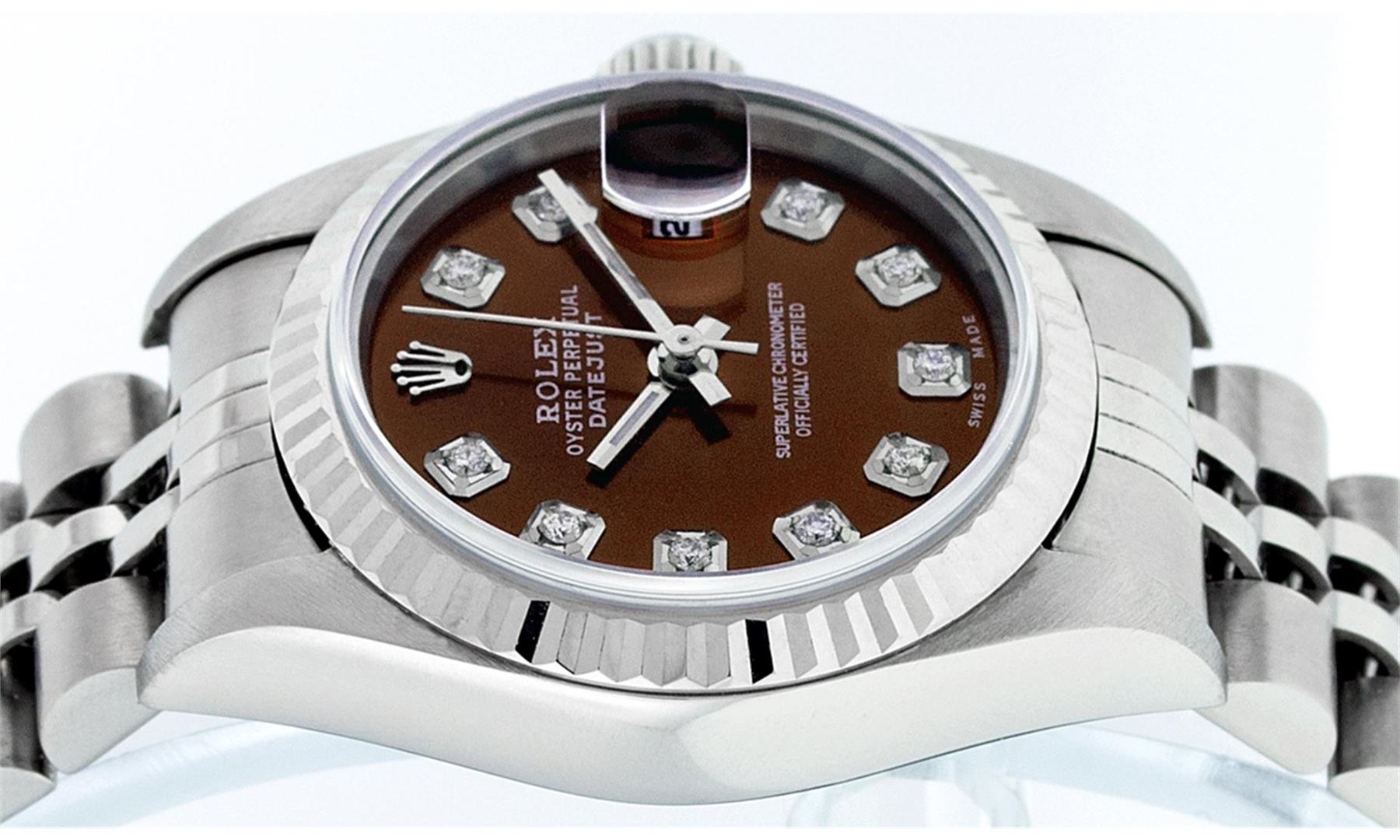 One Ladies Quickset Stainless Steel Rolex Datejust Polished Bright with Satin Finish, Serviced & Electronically Tested, Stainless Steel Case: 26mm, Stainless Steel Crown, Bezel: 18K White Gold Fluted Bezel. Custom Crystal: New Scratch Resistant Sapphire Cyclops Lens. Custom Hands: New Luminescent Hands. Movement: Automatic Winding Movement . Custom Dial: Mother Of Pearl Diamond Dial, Diamond Count: 10 Single Cut Diamonds In Dial, Color: G to H, Clarity: VS2 Date Window: 3 O'Clock Position Date Display, Model: Quickset Datejust. Condition: G-6 Extra Fine. Bracelet: Stainless Steel Jubilee Band. Bright Polish & Satin Finish. 6.0 Inch Length, Adjustable. Standard Clasp, With Rolex Logo. This Watch Has Been Serviced Time Tested And Is In Excellent Condition It Is Free Of All Scratches And Dents.