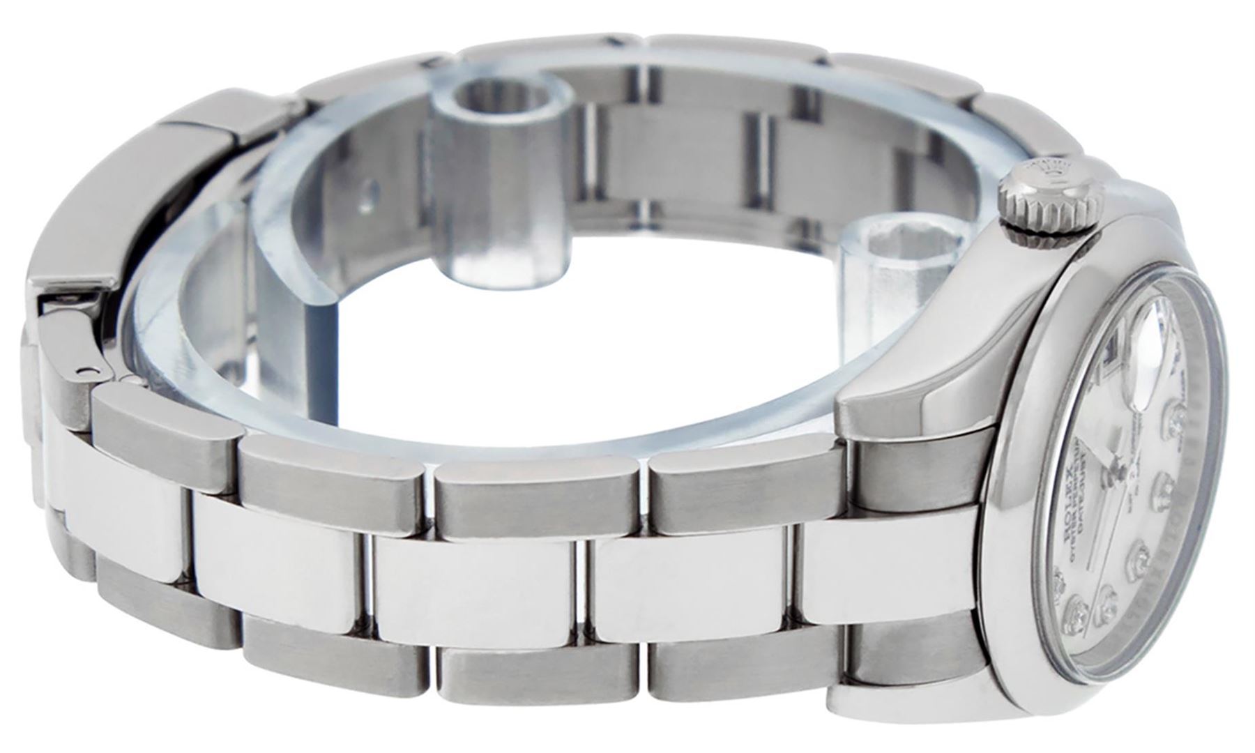 One Ladies Quickset Stainless Steel Rolex Datejust Polished Bright with Satin Finish, Serviced & Electronically Tested, Stainless Steel Case: 26mm, Stainless Steel Crown, Bezel: Stainless Steel Smooth Bezel. Custom Crystal: New Scratch Resistant Sapphire Cyclops Lens. Custom Hands: New Luminescent Hands. Movement: Automatic Winding Movement. Custom Dial: Mother Of Pearl Single Cut VS Diamond Dial, Diamond Count: 10 Single Cut Diamonds In Dial, Color: G to H, Clarity: VS. Date Window: 3 O'Clock Position Date Display, Model: 179160 Quickset Datejust. Condition: G-6 Extra Fine. Bracelet: Stainless Steel Oyster Band. Bright Polish & Satin Finish. 6.0 Inch Length, Adjustable. Standard Clasp, With Rolex Logo. This Watch Has Been Serviced Time Tested And Is In Excellent Condition It Is Free Of All Scratches And Dents.