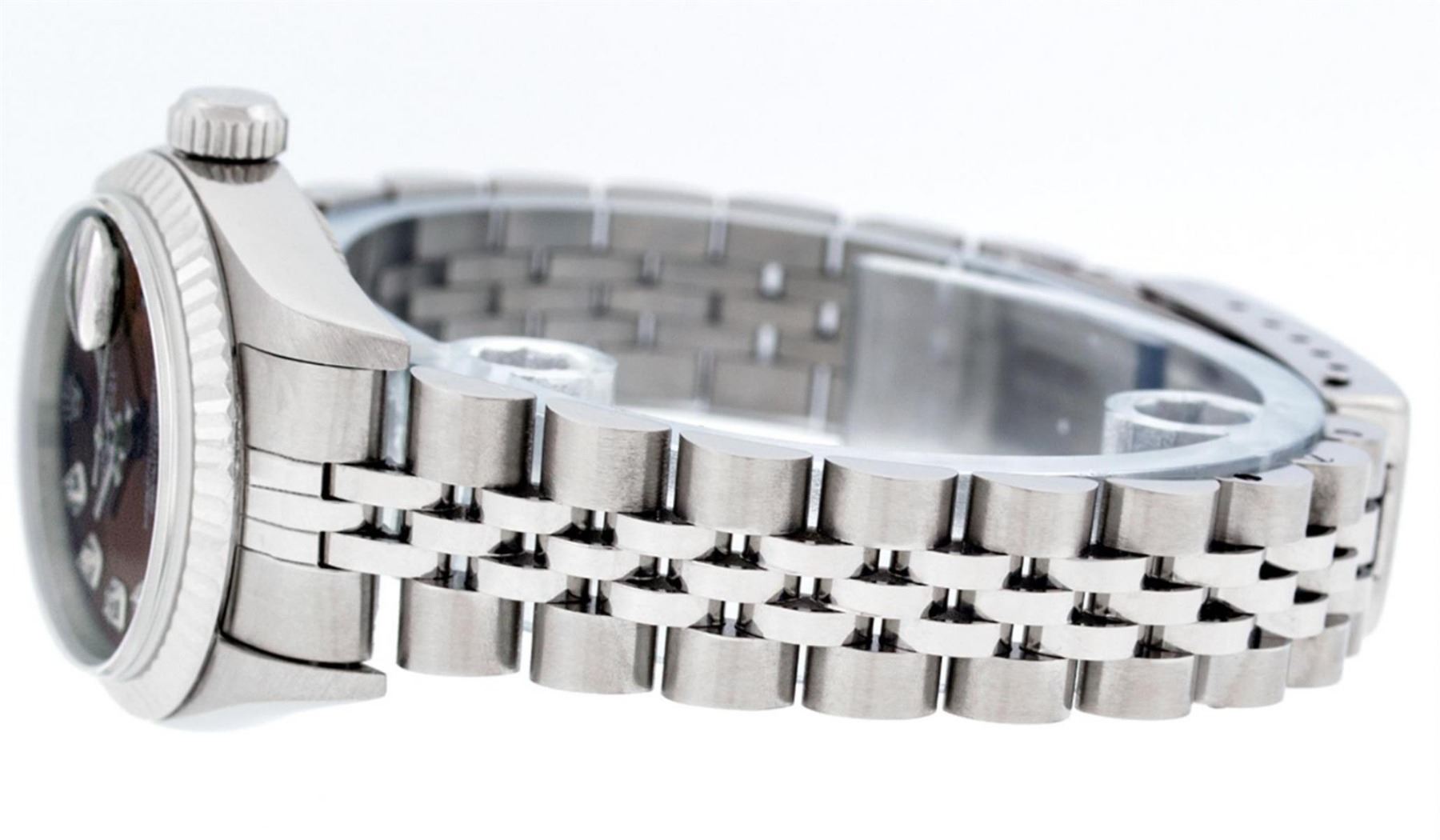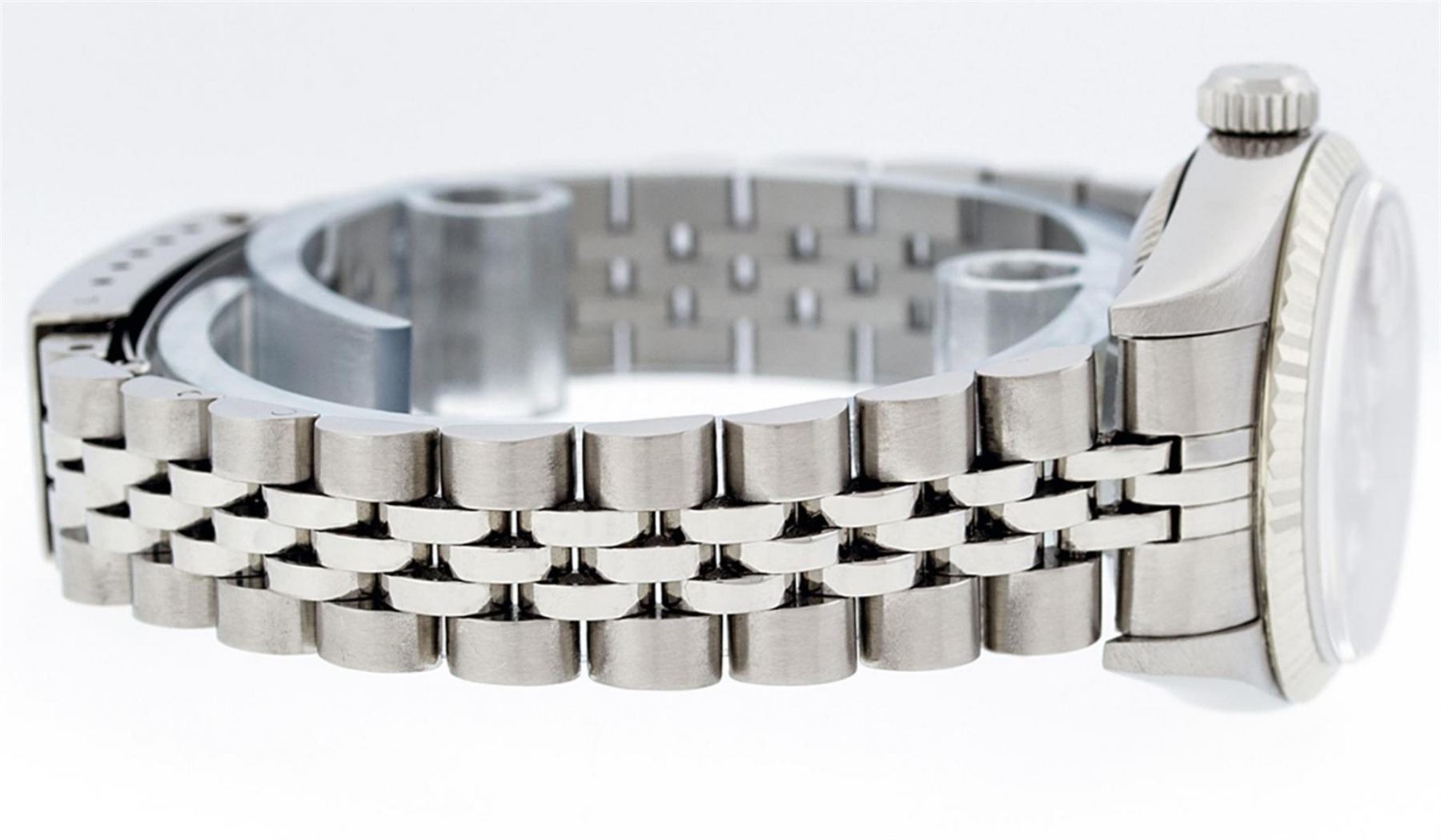 One Ladies Quickset Stainless Steel Rolex Datejust Polished Bright with Satin Finish, Serviced & Electronically Tested, Stainless Steel Case: 26mm, Stainless Steel Crown, Bezel: 18K White Gold Fluted Bezel. Custom Crystal: New Scratch Resistant Sapphire Cyclops Lens. Custom Hands: New Luminescent Hands. Movement: Automatic Winding Movement . Custom Dial: Mother Of Pearl Diamond Dial, Diamond Count: 10 Single Cut Diamonds In Dial, Color: G to H, Clarity: VS2 Date Window: 3 O'Clock Position Date Display, Model: Quickset Datejust. Condition: G-6 Extra Fine. Bracelet: Stainless Steel Jubilee Band. Bright Polish & Satin Finish. 6.0 Inch Length, Adjustable. Standard Clasp, With Rolex Logo. This Watch Has Been Serviced Time Tested And Is In Excellent Condition It Is Free Of All Scratches And Dents.