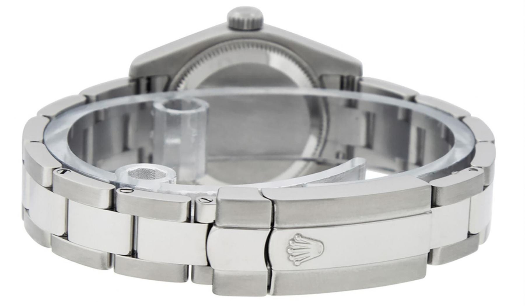 One Ladies Quickset Stainless Steel Rolex Datejust Polished Bright with Satin Finish, Serviced & Electronically Tested, Stainless Steel Case: 26mm, Stainless Steel Crown, Bezel: Stainless Steel Smooth Bezel. Custom Crystal: New Scratch Resistant Sapphire Cyclops Lens. Custom Hands: New Luminescent Hands. Movement: Automatic Winding Movement. Custom Dial: Mother Of Pearl Single Cut VS Diamond Dial, Diamond Count: 10 Single Cut Diamonds In Dial, Color: G to H, Clarity: VS. Date Window: 3 O'Clock Position Date Display, Model: 179160 Quickset Datejust. Condition: G-6 Extra Fine. Bracelet: Stainless Steel Oyster Band. Bright Polish & Satin Finish. 6.0 Inch Length, Adjustable. Standard Clasp, With Rolex Logo. This Watch Has Been Serviced Time Tested And Is In Excellent Condition It Is Free Of All Scratches And Dents.