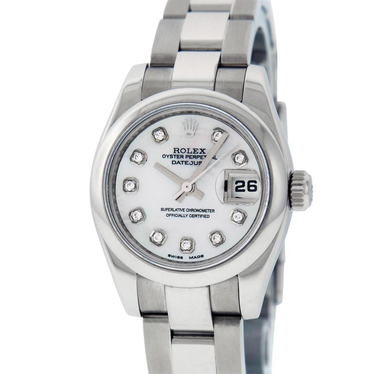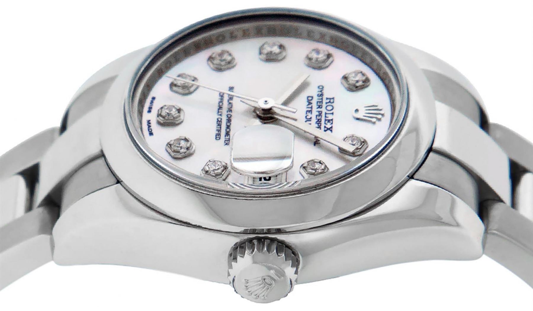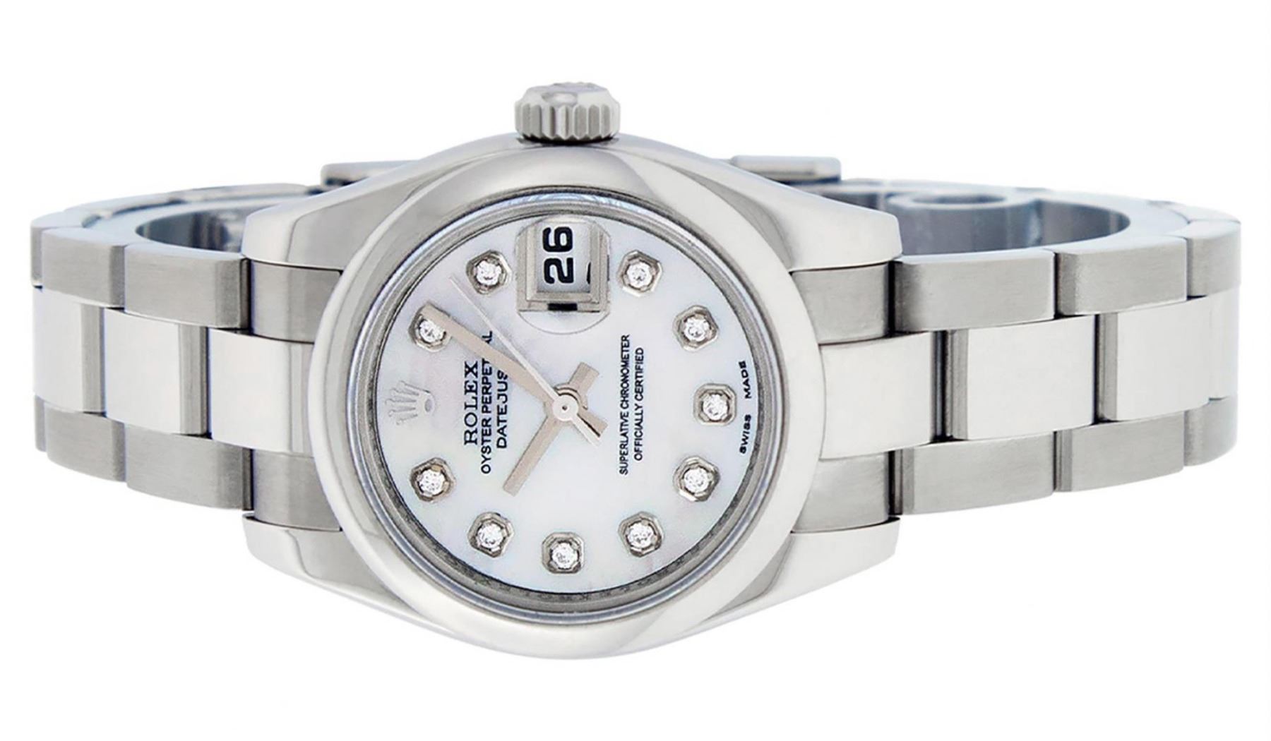 One Ladies Quickset Stainless Steel Rolex Datejust Polished Bright with Satin Finish, Serviced & Electronically Tested, Stainless Steel Case: 26mm, Stainless Steel Crown, Bezel: Stainless Steel Smooth Bezel. Custom Crystal: New Scratch Resistant Sapphire Cyclops Lens. Custom Hands: New Luminescent Hands. Movement: Automatic Winding Movement. Custom Dial: Mother Of Pearl Single Cut VS Diamond Dial, Diamond Count: 10 Single Cut Diamonds In Dial, Color: G to H, Clarity: VS. Date Window: 3 O'Clock Position Date Display, Model: 179160 Quickset Datejust. Condition: G-6 Extra Fine. Bracelet: Stainless Steel Oyster Band. Bright Polish & Satin Finish. 6.0 Inch Length, Adjustable. Standard Clasp, With Rolex Logo. This Watch Has Been Serviced Time Tested And Is In Excellent Condition It Is Free Of All Scratches And Dents.