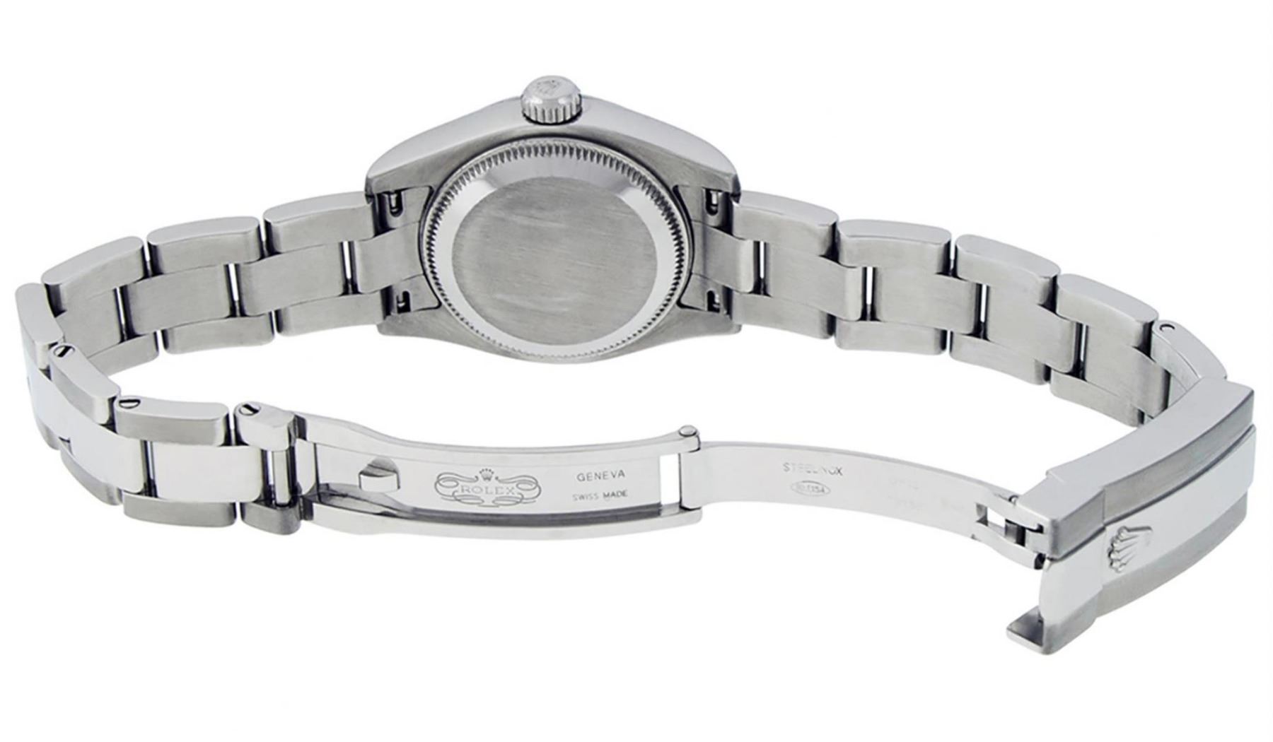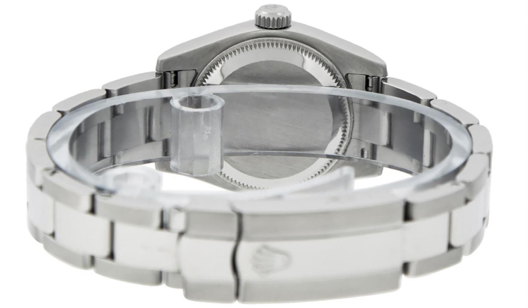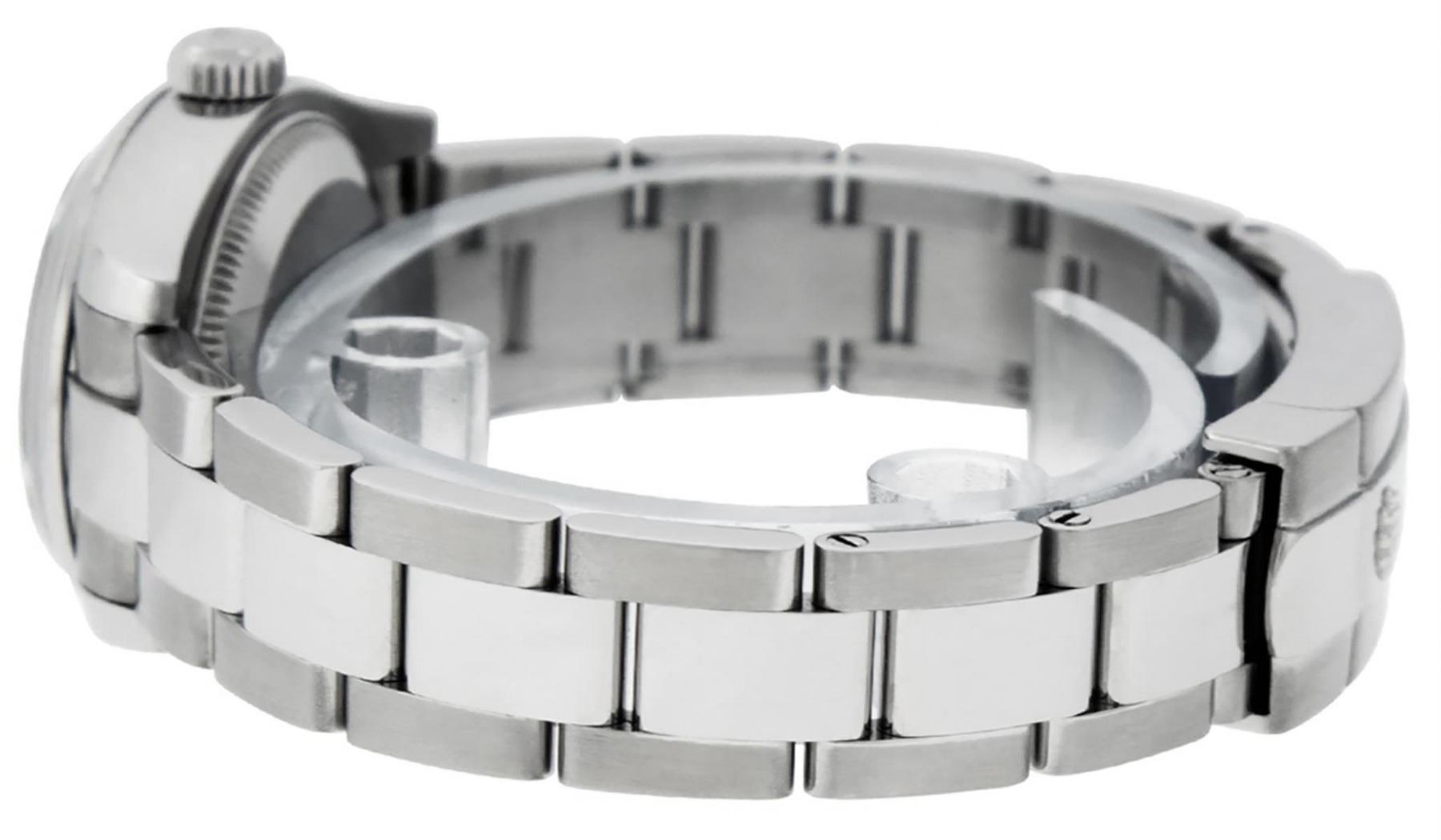 One Ladies Quickset Stainless Steel Rolex Datejust Polished Bright with Satin Finish, Serviced & Electronically Tested, Stainless Steel Case: 26mm, Stainless Steel Crown, Bezel: Stainless Steel Smooth Bezel. Custom Crystal: New Scratch Resistant Sapphire Cyclops Lens. Custom Hands: New Luminescent Hands. Movement: Automatic Winding Movement. Custom Dial: Mother Of Pearl Single Cut VS Diamond Dial, Diamond Count: 10 Single Cut Diamonds In Dial, Color: G to H, Clarity: VS. Date Window: 3 O'Clock Position Date Display, Model: 179160 Quickset Datejust. Condition: G-6 Extra Fine. Bracelet: Stainless Steel Oyster Band. Bright Polish & Satin Finish. 6.0 Inch Length, Adjustable. Standard Clasp, With Rolex Logo. This Watch Has Been Serviced Time Tested And Is In Excellent Condition It Is Free Of All Scratches And Dents.