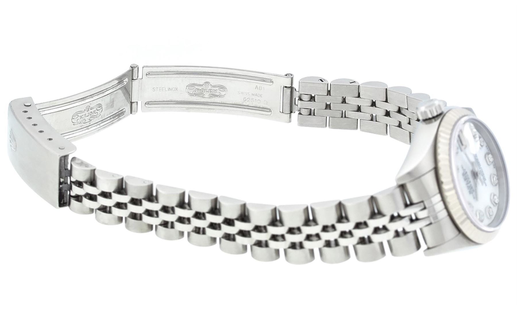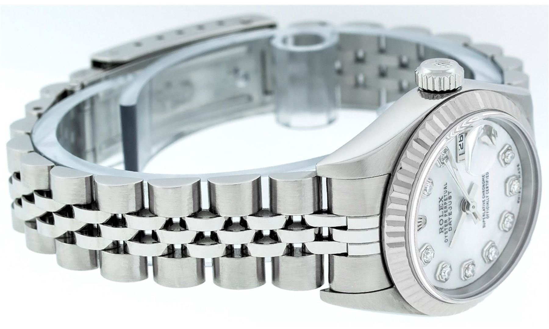 One Ladies Pre Owned Quickset Stainless Steel Rolex Datejust Polished Bright with Satin Finish, Serviced & Electronically Tested, Rolex Stainless Steel Case: 26mm, Rolex Stainless Steel Crown, Rolex Bezel: 18K White Gold Fluted Bezel. Custom Crystal: New