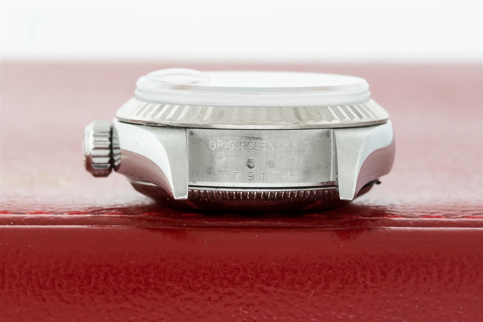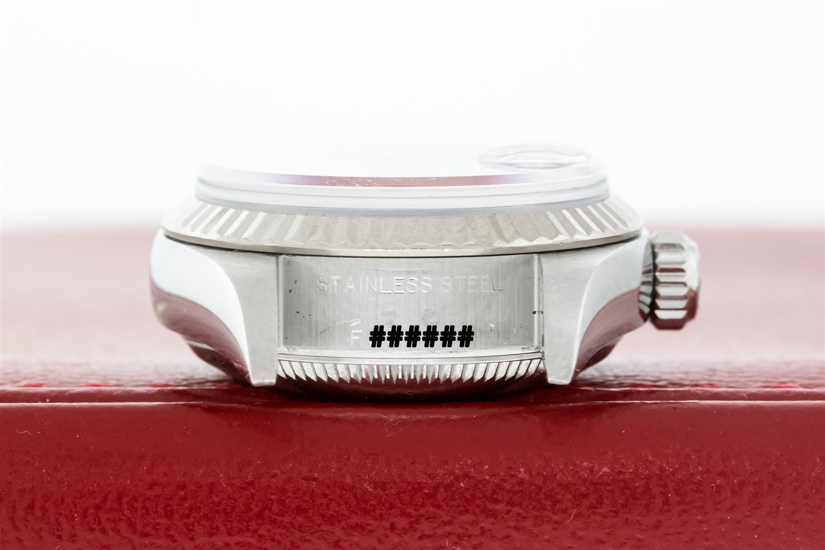 One Ladies Quickset Stainless Steel Rolex Datejust Polished Bright with Satin Finish, Serviced & Electronically Tested, Stainless Steel Case: 26mm, Stainless Steel Crown, Bezel: Original Rolex 18K White Gold Fluted Bezel. Custom Crystal: New Scratch Resistant Sapphire Cyclops Lens. Hands: Genuine Rolex None luminous hands. Movement: Automatic Winding Movement 2235. Original Dial: Rare Rolex Factory Blue Vignette Diamond Dial, Diamond Count: 10 Diamonds In Dial, Clarity:VVS, Date Window: 3 O'Clock Position Date Display, Model: Quickset Datejust 79174, Year: 2003, Condition: G-6 Extra Fine. Bracelet: Nice Tight Stainless Steel Jubilee Band. Bright Polish & Satin Finish. 6.25 Inch Length, Adjustable. Standard Clasp, With Rolex Logo. This Watch Has Been Serviced Time Tested And Is In Excellent Condition It Is Free Of All Scratches And Dents. This Watch Comes With The Following Accessories: Rolex Box, Rolex Booklets, Rolex Original Warranty Papers, Rolex Hang Tag, Rolex Wallet and Polishing Cloth. Complete Rolex Sets Such As This Are Extremely Hard To Come By.