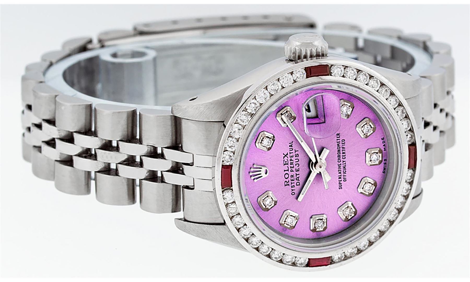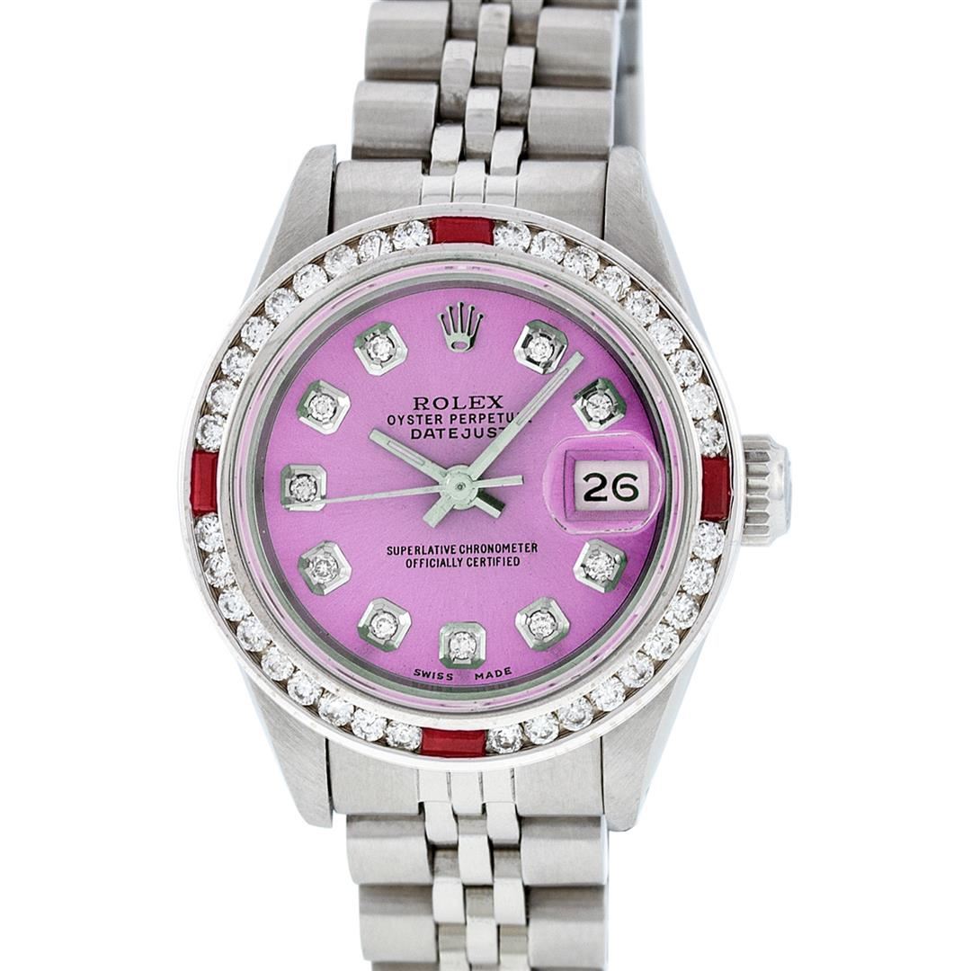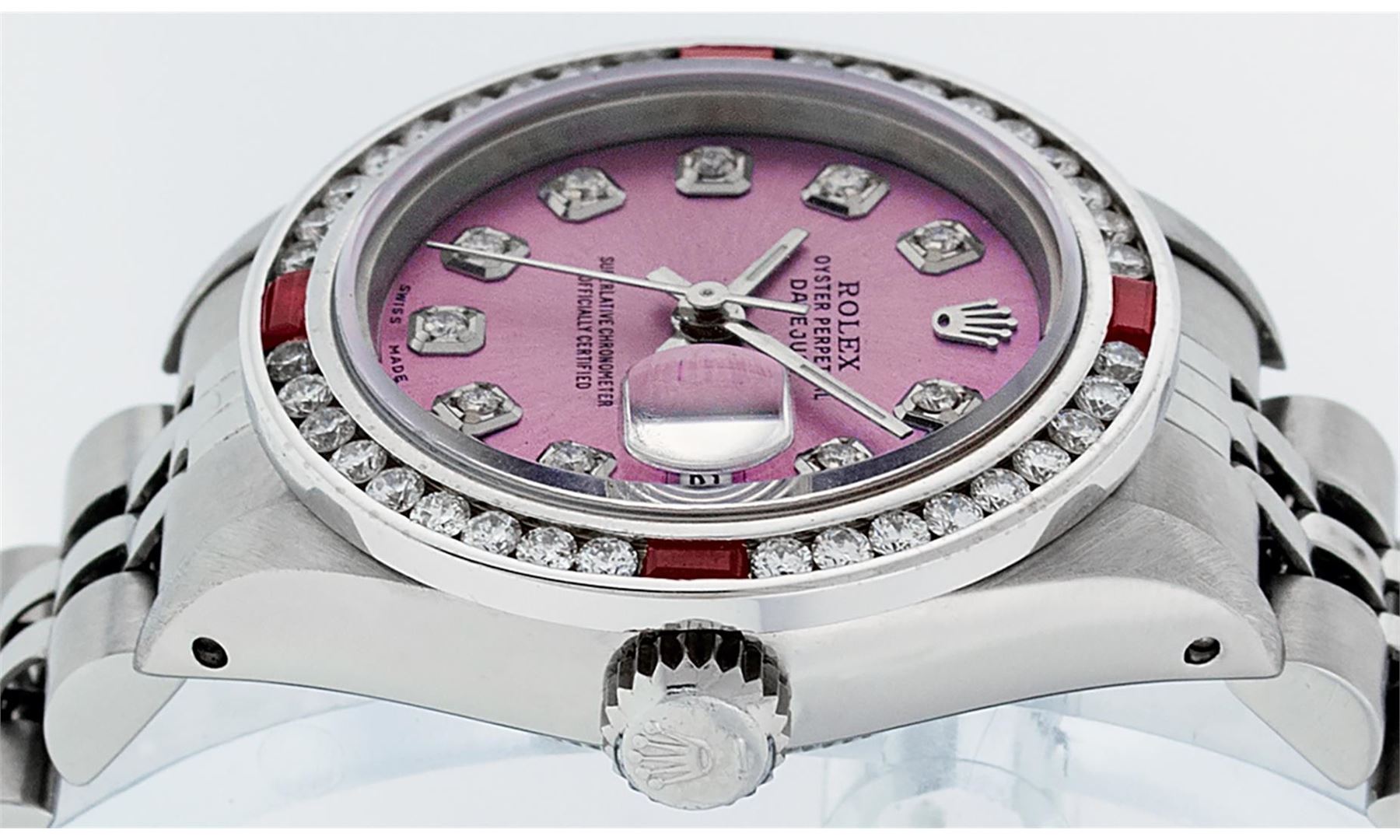 One Ladies Stainless Steel Rolex Datejust Polished Bright with Satin Finish, Serviced & Electronically Tested, Stainless Steel Case: 26mm, Stainless Steel Crown, Custom Bezel: New 18K White Gold Ruby Channel Set Diamond Bezel, Diamond + Gem Count: 36 Diamonds + 4 Rubies Total Weight 1.00 Carat, Clarity: SI-VS, Color: G to H. Custom Crystal: New Synthetic Sapphire Cyclops Lens. Custom Hands: New Luminescent Hands. Movement: Automatic Winding Movement Caliber 2030. Custom Dial: Refinished Pink With Diamond Hour Markers. Date Window: 3 O'Clock Position Date Display, Model: Datejust. Condition: G-6 Extra Fine. Bracelet: Stainless Steel Jubilee Band. Bright Polish & Satin Finish. 6.0 Inch Length, Adjustable. Standard Clasp, With Rolex Logo. This Watch Has Been Serviced Time Tested And Is In Excellent Condition It Is Free Of All Scratches And Dents.