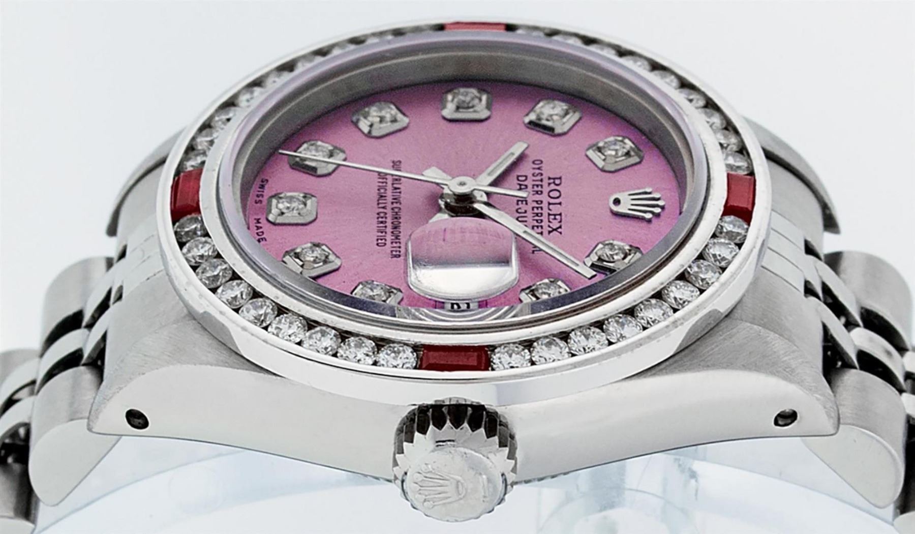 One Ladies Stainless Steel Rolex Datejust Polished Bright with Satin Finish, Serviced & Electronically Tested, Stainless Steel Case: 26mm, Stainless Steel Crown, Custom Bezel: New 18K White Gold Ruby Channel Set Diamond Bezel, Diamond + Gem Count:�36 Diamonds + 4 Rubies Total Weight 1.00 Carat, Clarity: SI-VS, Color: G to H. Custom Crystal: New Synthetic Sapphire Cyclops Lens. Custom Hands: New Luminescent Hands. Movement: Automatic Winding Movement Caliber 2030. Custom Dial: Refinished Pink With Diamond Hour Markers. Date Window: 3 O'Clock Position Date Display, Model: Datejust. Condition: G-6 Extra Fine. Bracelet: Stainless Steel Jubilee Band. Bright Polish & Satin Finish. 6.0 Inch Length, Adjustable. Standard Clasp, With Rolex Logo. This Watch Has Been Serviced Time Tested And Is In Excellent Condition It Is Free Of All Scratches And Dents.