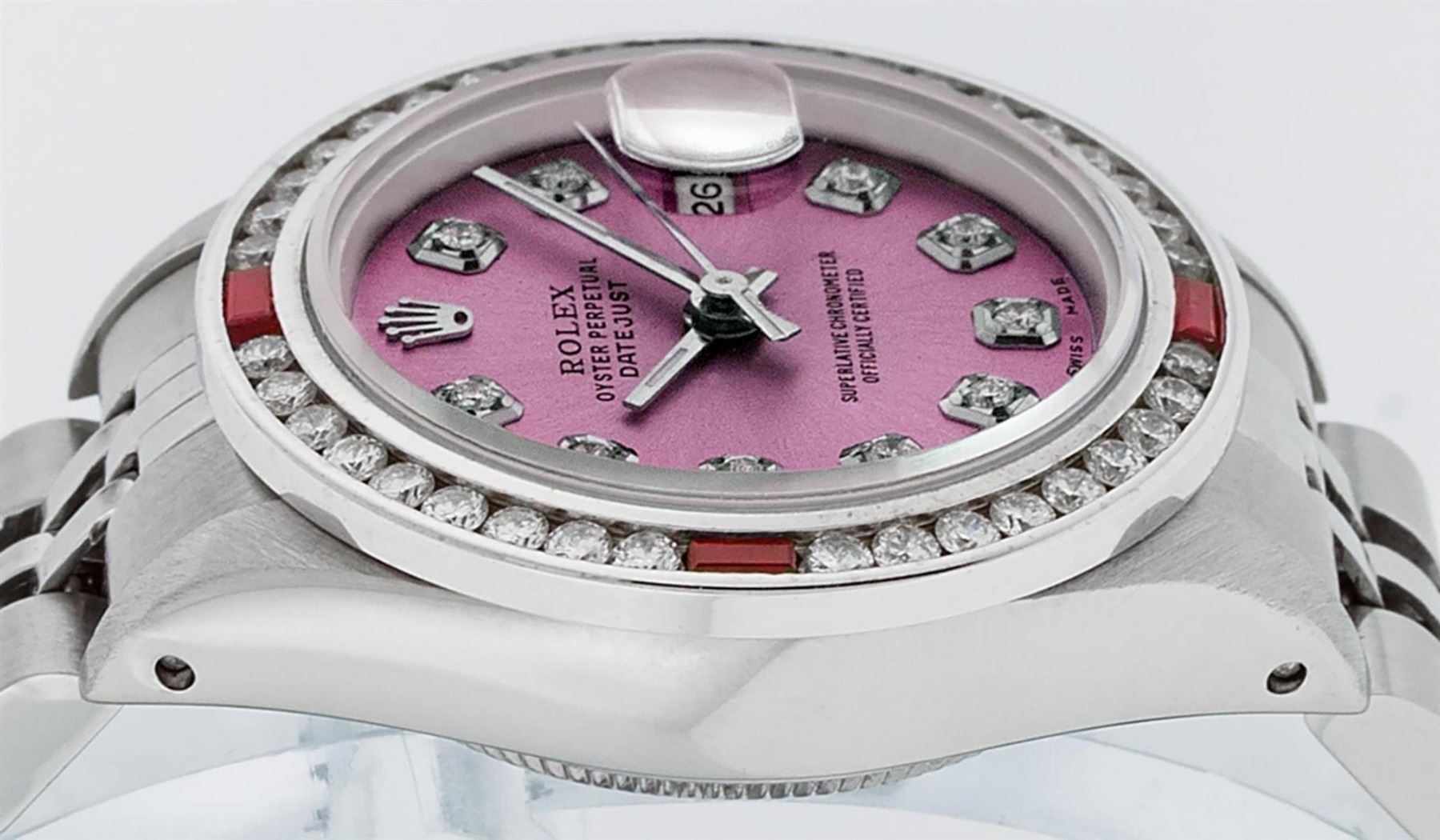 One Ladies Stainless Steel Rolex Datejust Polished Bright with Satin Finish, Serviced & Electronically Tested, Stainless Steel Case: 26mm, Stainless Steel Crown, Custom Bezel: New 18K White Gold Ruby Channel Set Diamond Bezel, Diamond + Gem Count: 36 Diamonds + 4 Rubies Total Weight 1.00 Carat, Clarity: SI-VS, Color: G to H. Custom Crystal: New Synthetic Sapphire Cyclops Lens. Custom Hands: New Luminescent Hands. Movement: Automatic Winding Movement Caliber 2030. Custom Dial: Refinished Pink With Diamond Hour Markers. Date Window: 3 O'Clock Position Date Display, Model: Datejust. Condition: G-6 Extra Fine. Bracelet: Stainless Steel Jubilee Band. Bright Polish & Satin Finish. 6.0 Inch Length, Adjustable. Standard Clasp, With Rolex Logo. This Watch Has Been Serviced Time Tested And Is In Excellent Condition It Is Free Of All Scratches And Dents.